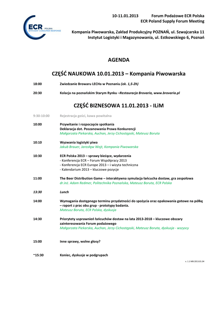 10-11.01.2013 Forum Podażowe ECR Polska ECR Poland Supply Forum Meeting Kompania Piwowarska, Zakład Produkcyjny POZNAŃ, ul. Szwajcarska 11 Instytut Logistyki i Magazynowania, ul. Estkowskiego 6, Poznań AGENDA CZĘŚĆ NAUKOWA 10.01.2013 – Kompania Piwowarska 18:00 Zwiedzanie Browaru LECHa w Poznaniu (ok. 1,5-2h) 20:30 Kolacja na poznańskim Starym Rynku –Restauracja Brovaria, www.brovaria.pl CZĘŚĆ BIZNESOWA 11.01.2013 - ILiM 9:30-10:00 Rejestracja gości, kawa powitalna 10:00 Przywitanie i rozpoczęcie spotkania Deklaracja dot. Poszanowania Prawa Konkurencji Małgorzata Piekarska, Auchan, Jerzy Cichostępski, Mateusz Boruta 10:10 Wyzwania logistyki piwa Jakub Brauer, Jarosłąw Wojt, Kompania Piwowarska 10:30 ECR Polska 2013 – sprawy bieżące, wydarzenia - Konferencja ECR – Forum Współpracy 2013 - Konferencja ECR Europe 2013 – i wizyta techniczna - Kalendarium 2013 – kluczowe pozycje 11:00 The Beer Distribution Game – interaktywna symulacja łańcucha dostaw, gra zespołowa dr.inż. Adam Redmer, Politechnika Poznańska, Mateusz Boruta, ECR Polska 13:30 Lunch 14:00 Wymagania dostępnego terminu przydatności do spożycia oraz opakowania gotowe na półkę – raport z prac obu grup - prototypy badania. Mateusz Boruta, ECR Polska, dyskusja 14:30 Priorytety usprawnień łańcuchów dostaw na lata 2013-2018 – kluczowe obszary zainteresowania Forum podażowego Małgorzata Piekarska, Auchan, Jerzy Cichostępski, Mateusz Boruta, dyskusja - wszyscy 15:00 Inne sprawy, wolne głosy? ~15:30 Koniec, dyskusje w podgrupach v. 1.1 MB 2013.01.04 10-11.01.2013 Forum Podażowe ECR Polska ECR Poland Supply Forum Meeting Kompania Piwowarska, Brewery in POZNAŃ, Szwajcarska 11 Institute of Logistics & Warehousing (ILiM), Estkowskiego 6, Poznań AGENDA English Version Scientific Part 10.01.2013 – KP Brewery 18:00 Kompania Piwowarska’ LECH Brewery visit (ca. 1,5-2h) 20:30 Dinner at the Old Market Square, Brovaria restarurant&hotel, www.brovaria.pl Business Part 11.01.2013 - ILiM 9:30-10:00 Registration, welcome coffee 10:00 Opening of the meeting Anti-trust reminder Małgorzata Piekarska, Auchan, Jerzy Cichostępski, Mateusz Boruta 10:10 Beer logistics challenges Jakub Brauer, Jarosłąw Wojt, Kompania Piwowarska 10:30 ECR Poland 2013 – current matters, events - ECR Conference – Forum for Cooperation 2013 - ECR Europe Conference 2013 & technical visits - 2013 Agenda & events – key positions 11:00 The Beer Distribution Game – interactive S.C. simulation game dr.inż. Adam Redmer, Politechnika Poznańska, Mateusz Boruta, ECR Polska 13:30 Lunch 14:00 Remaining shelf-life requirements & Shelf-Ready Packaging – update on the groups’ work, survey pilots. Mateusz Boruta, ECR, discussion 14:30 Supply Chain Improvements priorities for 2013-2018 – key area of interest for the ECR Poland Supply Forum Małgorzata Piekarska, Jerzy Cichostępski, Mateusz Boruta, discussion - all 15:00 Any Other Business? ~15:30 Finish, discussions in smaller groups v. 1.1 MB 2013.01.04
