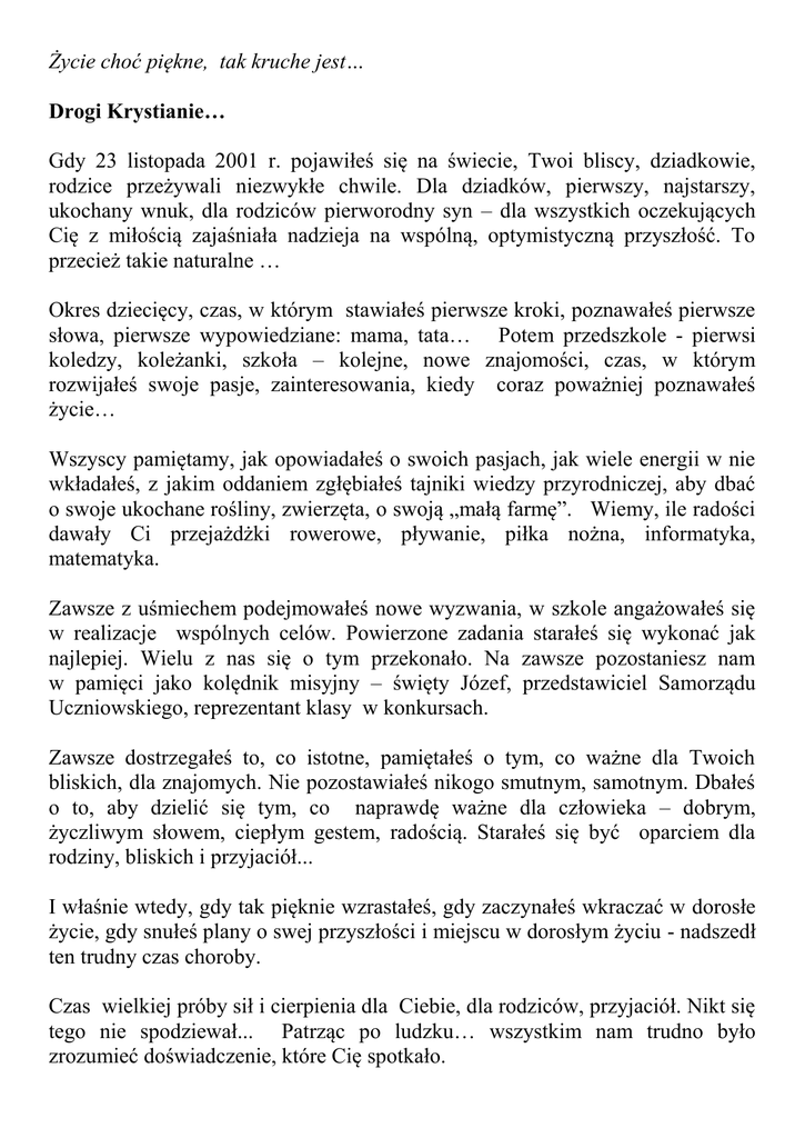 Życie choć piękne, tak kruche jest… Drogi Krystianie… Gdy 23 listopada 2001 r. pojawiłeś się na świecie, Twoi bliscy, dziadkowie, rodzice przeżywali niezwykłe chwile. Dla dziadków, pierwszy, najstarszy, ukochany wnuk, dla rodziców pierworodny syn – dla wszystkich oczekujących Cię z miłością zajaśniała nadzieja na wspólną, optymistyczną przyszłość. To przecież takie naturalne … Okres dziecięcy, czas, w którym stawiałeś pierwsze kroki, poznawałeś pierwsze słowa, pierwsze wypowiedziane: mama, tata… Potem przedszkole - pierwsi koledzy, koleżanki, szkoła – kolejne, nowe znajomości, czas, w którym rozwijałeś swoje pasje, zainteresowania, kiedy coraz poważniej poznawałeś życie… Wszyscy pamiętamy, jak opowiadałeś o swoich pasjach, jak wiele energii w nie wkładałeś, z jakim oddaniem zgłębiałeś tajniki wiedzy przyrodniczej, aby dbać o swoje ukochane rośliny, zwierzęta, o swoją „małą farmę”. Wiemy, ile radości dawały Ci przejażdżki rowerowe, pływanie, piłka nożna, informatyka, matematyka. Zawsze z uśmiechem podejmowałeś nowe wyzwania, w szkole angażowałeś się w realizacje wspólnych celów. Powierzone zadania starałeś się wykonać jak najlepiej. Wielu z nas się o tym przekonało. Na zawsze pozostaniesz nam w pamięci jako kolędnik misyjny – święty Józef, przedstawiciel Samorządu Uczniowskiego, reprezentant klasy w konkursach. Zawsze dostrzegałeś to, co istotne, pamiętałeś o tym, co ważne dla Twoich bliskich, dla znajomych. Nie pozostawiałeś nikogo smutnym, samotnym. Dbałeś o to, aby dzielić się tym, co naprawdę ważne dla człowieka – dobrym, życzliwym słowem, ciepłym gestem, radością. Starałeś się być oparciem dla rodziny, bliskich i przyjaciół... I właśnie wtedy, gdy tak pięknie wzrastałeś, gdy zaczynałeś wkraczać w dorosłe życie, gdy snułeś plany o swej przyszłości i miejscu w dorosłym życiu - nadszedł ten trudny czas choroby. Czas wielkiej próby sił i cierpienia dla Ciebie, dla rodziców, przyjaciół. Nikt się tego nie spodziewał... Patrząc po ludzku… wszystkim nam trudno było zrozumieć doświadczenie, które Cię spotkało. Wzrastałeś przecież do życia – a teraz Pan Bóg uświadamia nam, że do Życia Wiecznego w Jego Niebieskim Królestwie. I pozwolił Bóg, aby zgasł rozwijający się dopiero promyk Twojego życia… Niełatwo nam pogodzić się z faktem śmierci. Byłeś z nami przez 2/3 długości Twojego życia. Byłeś w zdrowiu, byłeś w chorobie, kiedy objęty nauczaniem indywidualnym dzielnie podejmowałeś obowiązki ucznia. Byłeś z nami nawet wtedy, kiedy przykuty do szpitalnego łóżka cierpliwie znosiłeś terapię. Miała Ci przywrócić zdrowie … Dzisiaj nasze serca trawi żal, bo tak trudno pojąć Boży plan. Tak wiele jeszcze chcieliśmy Ci powiedzieć, o tyle ważnych spraw zapytać, tak wiele wspólnych planów zrealizować, tyle przeżyć… Zabrakło czasu… „Miarą wartości człowieka jest rozmiar pustki, jaką po sobie zostawia” Pozostanie wielka pustka… Bo gdy odchodzi ktoś, kogo lubimy, kochamy i szanujemy, wtedy coś w nas umiera, umiera cząstka nas samych i ulatując zadaje pytanie o... SENS NASZEJ WĘDRÓWKI PO ZIEMI. My wszyscy – nauczyciele, katecheci, pracownicy szkoły, uczniowie, rodzice wierzymy głęboko, że Twoja śmierć, Twoje odejście mają ukryty w zamyśle Boga sens… Wiemy, że odszedłeś przygotowany na spotkanie z Bogiem. Przyjąłeś Sakramenty Święte, przyjąłeś Bierzmowanie. Żegnamy Cię, zapewniamy o naszej pamięci i modlitwie i wierzymy , że Stwórca zapragnął mieć obok siebie Anioła …i … powołał Ciebie .Wierzymy, że jesteś teraz szczęśliwy. Dziękujemy , że byłeś , że w jakiś sposób stanąłeś na życiowej drodze każdego z nas, że dzięki Tobie poznaliśmy kruchość, ulotność, a jednocześnie wielkość ludzkiego życia i potęgę boskich decyzji . Będziemy o Tobie pamiętać – Krystusiu, nasz uczniu, wychowanku, młody przyjacielu. A i Ty z tym Twoim pięknym, serdecznym uśmiechem spójrz na nas nieraz z niebiańskich wyżyn. I spoczywaj w pokoju!