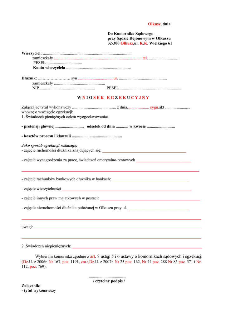 Olkusz, dnia Do Komornika Sądowego przy Sądzie Rejonowym w Olkuszu 32-300 Olkusz,ul. K.K. Wielkiego 61 Wierzyciel: ...................................................................................... zamieszkały .....................................................................................tel. ............................ PESEL .................................. Konto wierzyciela .............................................................. Dłużnik: ........................, syn ................................, ur. .............................................. zamieszkały ................................................. NIP ..................................................... PESEL ........................................................... WNIOSEK EGZEKUCYJNY Załączając tytuł wykonawczy .......................................... z dnia..................... sygn.akt ........................ wnoszę o wszczęcie egzekucji: 1. Świadczeń pieniężnych celem wyegzekwowania: - pretensji głównej............................ odsetek od dnia ............ w kwocie ........................... - kosztów procesu i klauzuli ................................................ Jako sposób egzekucji wskazuję: - zajęcie ruchomości dłużnika znajdujących się: ________________________________________ - zajęcie wynagrodzenia za pracę, świadczeń emerytalno-rentowych __________________________ _____________________________________________________________________________________ - zajęcie rachunków bankowych dłużnika w bankach: _____________________________________ - zajęcie wierzytelności ______________________________________________________________ - zajęcie innych praw majątkowych w postaci: ________________________________________________ - zajęcie nieruchomości dłużnika położonej w Olkuszu przy ul. _____________________________ ______________________________________________________________________________________ uwagi: ________________________________________________________________________________ ______________________________________________________________________________________ 2. Świadczeń niepieniężnych: ______________________________________________________________ Wybieram komornika zgodnie z art. 8 ustęp 5 i 6 ustawy o komornikach sądowych i egzekucji (Dz.U. z 2006r. Nr 167, poz. 1191, zm.:,Dz.U. z 2007r. Nr 25 poz. 162, Nr 44 poz. 288 Nr 85 poz. 571 i Nr 112, poz. 769). .................................... / czytelny podpis / Załącznik: - tytuł wykonawczy