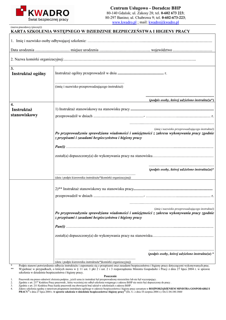 Centrum Usługowo - Doradcze BHP 80-140 Gdańsk; ul. Zakosy 28; tel. 0-602 673 223; 80-297 Banino; ul. Chabrowa 9; tel. 0-602-673-223; www.kwadro.pl ; mail: [email protected] (nazwa pracodawcy (pieczęć)) KARTA SZKOLENIA WSTĘPNEGO W DZIEDZINIE BEZPIECZEŃSTWA I HIGIENY PRACY 1. Imię i nazwisko osoby odbywającej szkolenie: ……………………………………....................................................................... Data urodzenia ……………………… miejsce urodzenia …………………………………. województwo …………………………. 2. Nazwa komórki organizacyjnej:.................................................................................................................................... 3. Instruktaż ogólny Instruktaż ogólny przeprowadził w dniu .............................................. r. ..................................................................... (imię i nazwisko przeprowadzającego instruktaż) .................................................................... (podpis osoby, której udzielono instruktażu*) 4. Instruktaż stanowiskowy 1) Instruktaż stanowiskowy na stanowisku pracy ................................................................................... przeprowadził w dniach ..................................................- …………………….................................. r. ………..…………………............................................ (imię i nazwisko przeprowadzającego instruktaż) Po przeprowadzeniu sprawdzianu wiadomości i umiejętności z zakresu wykonywania pracy zgodnie z przepisami i zasadami bezpieczeństwa i higieny pracy Pan(i) …………………………………………………………………………........................................ został(a) dopuszczony(a) do wykonywania pracy na stanowisku………………………………………… ................................................................. (podpis osoby, której udzielono instruktażu)* ……………………………………………………… (data i podpis kierownika instruktażu*)komórki organizacyjnej) 2)** Instruktaż stanowiskowy na stanowisku pracy............................................................................... przeprowadził w dniach ..................................................- …………………….................................. r. ………..…………………............................................ (imię i nazwisko przeprowadzającego instruktaż) Po przeprowadzeniu sprawdzianu wiadomości i umiejętności z zakresu wykonywania pracy zgodnie z przepisami i zasadami bezpieczeństwa i higieny pracy Pan(i) …………………………………………………………………………........................................ został(a) dopuszczony(a) do wykonywania pracy na stanowisku………………………………………… ................................................................. (podpis osoby, której udzielono instruktażu) * ……………………………………………………… * ** 1. 2. 3. 4. (data i podpis kierownika instruktażu*)komórki organizacyjnej) Podpis stanowi potwierdzenie odbycia instruktażu i zapoznania się z przepisami oraz zasadami bezpieczeństwa i higieny pracy dotyczącymi wykonywanych prac. Wypełniać w przypadkach, o których mowa w § 11 ust. 1 pkt 2 i ust. 2 i 3 rozporządzenia Ministra Gospodarki i Pracy z dnia 27 lipca 2004 r. w sprawie szkolenia w dziedzinie bezpieczeństwa i higieny pracy. Pouczenie Pracownik ma prawo odmówić złożenia podpisu , jeżeli uzna że instruktaż był przeprowadzony nierzetelnie lub nie był wyczerpujący . Zgodnie z art. 2373 Kodeksu Pracy pracownik , który wcześniej nie odbył szkolenia wstępnego z zakresu BiHP nie może być dopuszczony do pracy . Zgodnie z art. 211 Kodeksu Pracy każdy pracownik ma obowiązek brać udział w szkoleniach z zakresu BiHP . Zakres szkolenia zgodny z ramowym programem instruktażu ogólnego w zakresie bezpieczeństwa i higieny pracy zawartym w ROZPORZĄDZENIEM MINISTRA GOSPODARKI I PRACY1) z dnia 27 lipca 2004 r. w sprawie szkolenia w dziedzinie bezpieczeństwa i higieny pracy2) (Dz. U. z dnia 18 sierpnia 2004 r.) /Dz.U.04.180.1860/ Instruktaż wstępny ogólny: Celem szkolenia jest zaznajomienie pracownika, w szczególności z: a) podstawowymi przepisami bezpieczeństwa i higieny pracy zawartymi w Kodeksie pracy, w układach zbiorowych pracy i w regulaminach pracy, b) przepisami i zasadami bezpieczeństwa i higieny pracy obowiązującymi w danym zakładzie pracy, c) zasadami udzielania pomocy przedlekarskiej. Zakres szkolenia: Lp 1. 1. Ramowy program szkolenia Temat szkolenia 2. Istota bezpieczeństwa i higieny pracy Liczba godz. 3. 0,1 Zakres obowiązków i uprawnień pracodawcy, pracowników oraz 0,4 poszczególnych komórek organizacyjnych zakładu pracy i organizacji społecznych w zakresie bezpieczeństwa i higieny pracy 3. Odpowiedzialność za naruszenie przepisów lub zasad 0,1 bezpieczeństwa i higieny pracy 4. Zasady poruszania się na terenie zakładu pracy 0,2 5. Zagrożenia wypadkowe i zagrożenia dla zdrowia występujące w 0,3 zakładzie i podstawowe środki zapobiegawcze 6. Podstawowe zasady bezpieczeństwa i higieny pracy związane z 0,4 obsługą urządzeń technicznych oraz transportem wewnątrzzakładowym 7. Zasady przydziału odzieży roboczej i obuwia roboczego oraz 0,2 środków ochrony indywidualnej, w tym w odniesieniu do stanowiska pracy instruowanego 8. Porządek i czystość w miejscu pracy oraz higiena osobista 0,1 pracownika - ich wpływ na zdrowie i bezpieczeństwo pracownika 9. Profilaktyczna opieka lekarska - zasady jej sprawowania w 0,2 odniesieniu do stanowiska instruowanego 10. Podstawowe zasady ochrony przeciwpożarowej oraz 0,3 postępowania w razie pożaru 11. Organizacja i zasady udzielania pomocy przedlekarskiej w razie 0,7 wypadku Razem: min. 3 2