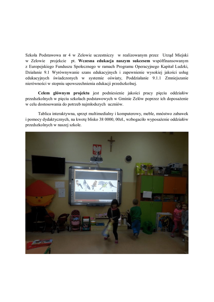 Szkoła Podstawowa nr 4 w Zelowie uczestniczy w realizowanym przez Urząd Miejski w Zelowie projekcie pt. Wczesna edukacja naszym sukcesem współfinansowanym z Europejskiego Funduszu Społecznego w ramach Programu Operacyjnego Kapitał Ludzki, Działanie 9.1 Wyrównywanie szans edukacyjnych i zapewnienie wysokiej jakości usług edukacyjnych świadczonych w systemie oświaty, Poddziałanie 9.1.1 Zmniejszanie nierówności w stopniu upowszechnienia edukacji przedszkolnej. Celem głównym projektu jest podniesienie jakości pracy pięciu oddziałów przedszkolnych w pięciu szkołach podstawowych w Gminie Zelów poprzez ich doposażenie w celu dostosowania do potrzeb najmłodszych uczniów. Tablica interaktywna, sprzęt multimedialny i komputerowy, meble, mnóstwo zabawek i pomocy dydaktycznych, na kwotę blisko 38 0000, 00zł., wzbogaciło wyposażenie oddziałów przedszkolnych w naszej szkole.