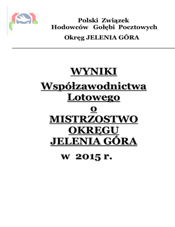 Polski Związek Hodowców Gołębi Pocztowych Okręg JELENIA GÓRA WYNIKI Współzawodnictwa Lotowego o MISTRZOSTWO OKRĘGU JELENIA GÓRA w 2015 r. GENERALNE MISTRZOSTWO OKRĘGU 2015 r. Nazwisko i imię hodowcy MISTRZ Latawiec Kazimierz I V-ce MISTRZ Aniśkiewicz Wiktor i Grzegorz II V-ce MISTRZ Słobodzian M. i J. PRZODOWNICY 1. Michalik Józef i Franciszek 2. Błaszczyk G. i A. 3. Masztalerz W. i T. 4. Kopczacki Jerzy 5. Wyszomirski Janusz 6. Barszczowski Gabriel 7. Opaliński Robert i Ela 8. Dudek-Kopke-Hoop 9. Wilk Andrzej 10. Latkowski Henryk 11. Śnieżek Henryk 12.Szostak Zdz.-Wąsowski St. 13.Gołąbek Tadeusz 14.Sygit Zdzisław 15.Pachota Stanisław 16.Nowicki Ireneusz 17.Świątek Bogusław i Kamil 18.Stolarz Marian i Stanisław 19.Marczyk Roman 20.Kwiecinski Paweł „SUPERMISTRZ” Oddział Konk. Punkty Bolesławiec 40 2409,09 Lubań 40 2406,20 Bolesławiec 40 2403,35 Lubań Karkonosze Karkonosze Bolesławiec Łużyce-Lubań Łużyce-Lubań Lubań Bolesławiec Bolesławiec Lubań Lubań Lubań Lubań Lubań Karkonosze Łużyce-Lubań Lubań Lubań Łużyce-Lubań Lubań 40 40 40 40 40 40 39 39 39 38 39 38 39 38 38 38 38 37 38 36 2402,98 2401,59 2392,40 2379,16 2369,50 2362,29 2320,77 2318,34 2301,52 2296,71 2294,82 2289,33 2286,62 2278,82 2258,20 2203,35 2192,38 2189,41 2133,41 2078,63 OKRĘGU - 2015 (kat.A,B,C,E,F) Nazwisko i imię hodowcy Oddział Konk. Coeff. Dudek-Kopke-Hoop Bolesławiec 66 1537,85 Kat. „A” – 2015 Loty krótkodystansowe Nazwisko i imię hodowcy MISTRZ Pałka M.T.M. I V-ce MISTRZ Słobodzian M. i J. II V-ce MISTRZ Dudek-Kopke-Hoop PRZODOWNICY 1. Masztalerz W. i T. 2. Wolski Rafał 3. Błaszczyk G. i A. 4. Michalik Józef i Franciszek 5. Królicki Jerzy 6. Tankielun Tadeusz 7. Dawidiwicz Jarosław 8. Dawidowicz Marek 9. Kopka Janusz 10. Merkel Marian 11. Fila Czesław 12. Paloc - Błaszczyk M. 13. Wiatrowski Janusz 14. Boryczewski Marian 15. Koryluk Marek 16. Latawiec Kazimierz 17. Stolarz Marian i Stanisław 18. Myszka – Tarczyński 19. Kopczacki Jerzy 20. Zwoliński Jan Oddział Konk. Coeff. Łużyce Lubań 20 86,77 Bolesławiec 20 472,97 Bolesławiec 20 587,52 Karkonosze Bolesławiec Karkonosze Lubań Łużyce Lubań Łużyce Lubań Karkonosze Karkonosze Karkonosze Karkonosze Bolesławiec Karkonosze Łużyce Lubań Lubań Lubań Bolesławiec Lubań Karkonosze Bolesławiec Karkonosze 20 20 20 20 20 20 20 20 20 20 20 20 20 20 20 20 20 20 20 20 610,46 613,87 642,06 687,14 733,63 768,77 770,02 776,29 803,58 815,77 821,76 890,58 927,22 939,44 960,68 1028,76 1030,60 1147,27 1214,59 1236,93 KAT. „B” – 2015 Loty średniodystansowe Nazwisko i imię hodowcy MISTRZ Pałka M.T.M I V-ce MISTRZ Michalik Józef i Franciszek II V-ce MISTRZ Dudek-Kopke-Hoop PRZODOWNICY 1. Wiatrowski Janusz 2. Błaszczyk G. i A. 3. Nowicki Ireneusz 4. Paloc - Błaszczyk M. 5. Stanasiuk Walerian 6. Latawiec Kazimierz 7. Królicki Jerzy 8. Słobodzian M. i J. 9. Tankielun Tadeusz 10. Bielecki Z. i M. 11. Kopka Janusz 12. Radzięta Wioletta 13. Zimroz Sławomir 14. Masztalerz W. i T. 15. Kujel T. i P. 16. Kopczacki Jerzy 17. Pachota Stanisław 18. Dawidowicz Marek 19. Wolski Rafał 20. Krystyniuk Franciszek Oddział Konk. Coeff. Łużyce Lubań 16 71,68 Lubań 16 269,57 Bolesławiec 16 310,29 Łużyce Lubań Karkonosze Łużyce Lubań Karkonosze Lubań Bolesławiec Łużyce Lubań Bolesławiec Łużyce Lubań Karkonosze Karkonosze Bolesławiec Lubań Karkonosze Bolesławiec Bolesławiec Karkonosze Karkonosze Bolesławiec Bolesławiec 16 16 16 16 16 16 16 16 16 16 16 16 16 16 16 16 16 16 16 16 376,86 405,47 408,52 417,76 525,08 537,90 600,01 628,89 635,33 687,34 702,18 703,93 798,59 884,43 885,80 923,50 928,79 976,52 983,54 994,88 Kat. „C” – 2015 Loty dalekodystansowe Nazwisko i imię hodowcy MISTRZ Latawiec Kazimierz I V-ce MISTRZ Dudek-Kopke-Hoop II V-ce MISTRZ Błaszczyk G. i A. PRZODOWNICY 1. Latkowswki Henryk 2. Opaliński Robert i Ela 3. Kopczacki Jerzy 4. Szostak Zdz.- Wąsowski St. 5. Przybyłek Andrzej 6. Kujel T.P.M. 7. Wolski Rafał 8. Zwoliński Jan 9. Pachota Stanisław 10. Kwieciński Paweł 11. Michalik Józef i Franciszek 12. Wyszomirski Janusz 13. Mielnik Piotr 14. Świętochowski Marian 15. Wilk Andrzej 16. Sygit Zdzisław 17. Masztalerz W. i T. 18. Popielarz Zdzisław 19. Myszka - Tarczyński 20. Celuch Andzej Oddział Konk. Coeff. Bolesławiec 9 80,95 Bolesławiec 9 119,10 Karkonosze 9 135,38 Lubań Lubań Bolesławiec Lubań Bolesławiec Bolesławiec Bolesławiec Karkonosze Karkonosze Lubań Lubań Łużyce Lubań Lubań Łużyce Lubań Bolesławiec Lubań Karkonosze Karkonosze Karkonosze Łużyce Lubań 9 9 9 9 9 9 9 9 9 9 9 9 9 9 9 9 9 9 9 9 151,98 175,24 179,53 194,94 200,09 204,10 237,54 245,90 248,91 253,15 259,55 274,70 280,49 291,80 298,64 306,49 344,15 346,99 347,66 365,66 Kat. „E” – 2015 Maraton Nazwisko i imię hodowcy MISTRZ Latawiec Kazimierz I V-ce MISTRZ Michalik Józef i Franciszek II V-ce MISTRZ Siemierz Andrzej PRZODOWNICY 1. Wolski Rafał 2. Słobodzian M. i J. 3. Aniśkiewicz Wiktor i Grzegorz 4. Sygit Zdzisław 5. Brodziński Kazimierz 6. Musiał Tadeusz 7. Błaszczyk G. i A. 8. Lorenc Zbigniew 9. Barszczowski Gabriel 10. Wyszomirski Janusz 11. Dudek-Kopke-Hoop 12. Stolarz Marian i Stanisław 13. Radzięta Wioletta 14. Drożdżyński Tadeusz 15. Pasternak Zbigniew 16. Opaliński Robert i Ela 17. Latkowski Henryk 18. Pachota Stanisław 19. Niestier Zbigniew 20. Sieradzki Andrzej Oddział Konk. Coeff. Bolesławiec 6 63,24 Lubań 6 87,22 Łużyce Lubań 6 91,74 Bolesławiec Bolesławiec Lubań Lubań Łużyce Lubań Łużyce Lubań Karkonosze Lubań Łużyce Lubań Łużyce Lubań Bolesławiec Lubań Bolesławiec Łużyce Lubań Łużyce Lubań Lubań Lubań Karkonosze Lubań Łużyce Lubań 6 6 6 6 6 6 6 6 6 6 6 6 6 6 6 6 6 6 6 6 107,04 124,05 132,34 156,13 172,42 173,28 179,06 181,73 183,81 184,81 201,17 205,65 226,26 227,21 236,65 245,05 246,85 248,78 253,08 273,88 Kat „G” - Roczne -2015 Nazwisko i imię hodowcy MISTRZ Dud