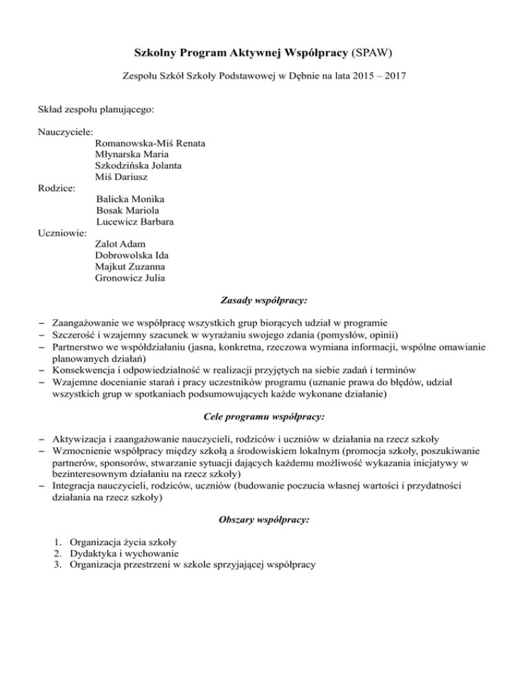 Szkolny Program Aktywnej Współpracy (SPAW) Zespołu Szkół Szkoły Podstawowej w Dębnie na lata 2015 – 2017 Skład zespołu planującego: Nauczyciele: Romanowska-Miś Renata Młynarska Maria Szkodzińska Jolanta Miś Dariusz Rodzice: Balicka Monika Bosak Mariola Lucewicz Barbara Uczniowie: Zalot Adam Dobrowolska Ida Majkut Zuzanna Gronowicz Julia Zasady współpracy: – Zaangażowanie we współpracę wszystkich grup biorących udział w programie – Szczerość i wzajemny szacunek w wyrażaniu swojego zdania (pomysłów, opinii) – Partnerstwo we współdziałaniu (jasna, konkretna, rzeczowa wymiana informacji, wspólne omawianie planowanych działań) – Konsekwencja i odpowiedzialność w realizacji przyjętych na siebie zadań i terminów – Wzajemne docenianie starań i pracy uczestników programu (uznanie prawa do błędów, udział wszystkich grup w spotkaniach podsumowujących każde wykonane działanie) Cele programu współpracy: – Aktywizacja i zaangażowanie nauczycieli, rodziców i uczniów w działania na rzecz szkoły – Wzmocnienie współpracy między szkołą a środowiskiem lokalnym (promocja szkoły, poszukiwanie partnerów, sponsorów, stwarzanie sytuacji dających każdemu możliwość wykazania inicjatywy w bezinteresownym działaniu na rzecz szkoły) – Integracja nauczycieli, rodziców, uczniów (budowanie poczucia własnej wartości i przydatności działania na rzecz szkoły) Obszary współpracy: 1. Organizacja życia szkoły 2. Dydaktyka i wychowanie 3. Organizacja przestrzeni w szkole sprzyjającej współpracy Obszar Organizacja życia szkoły Dydaktyka i wychowanie Przestrzeń szkoły Działanie Data działania 1. Noc w szkole V-VI 2016 2. Spływ kajakowy V-VI 2017 1. Mamo – tato! naucz mnie... II 2016 2. Zbiórka surowców wtórnych XI, IV 2015-17 1. Miejsce na ognisko III 2016 2. Ukwiecenie szkoły IV-V 2016 3. Święto wiosny III 2016, 2017 Opis działań realizowanych w roku szkolnym 2015/2016 i 2016/2017 Noc w szkole - zorganizowana z okazji Dnia Dziecka (piątek/sobota) Uczniowie wraz z rodzicami i nauczycielami wspólnie spędzą czas wieczoru i nocy. Odbędą się gry i zabawy sportowe na sali gimnastycznej, wspólny seans filmowy, dyskoteka, inne zajęcia... Wspólne sprzątanie następnego dnia Spływ kajakowy - Zorganizowany wyjazd na spływ kajakami z okazji Dnia Dziecka Mamo – tato! naucz mnie... Przekazywanie pasji, zainteresowań, hobby poszczególnych rodziców. Rodzic staje się ekspertem w danej dziedzinie prowadząc zajęcia z uczniami. Zbiórka surowców wtórnych – wraz z akcją Sprzątanie Świata czy Gminy zorganizowana zostanie zbiórka surowców (wspólny piknik). Pieniądze ze zbiórki przeznaczone zostaną na wycieczkę. Miejsce na ognisko – wykonanie miejsca w którym można rozpalić ogień na terenie szkoły. Ukwiecenie szkoły – wykonanie pomysłowych doniczek i zasadzenie kwiatów na szkolne parapety. Święto wiosny – Wspólne robienie ozdób świątecznych, wystawa, kiermasz