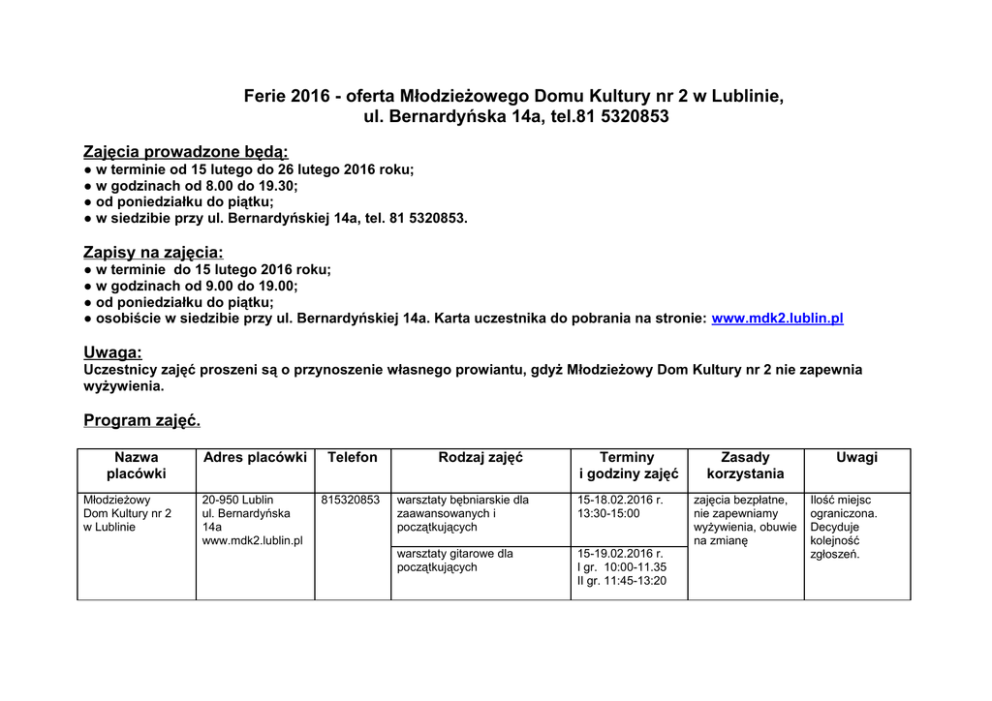 Ferie 2016 - oferta Młodzieżowego Domu Kultury nr 2 w Lublinie, ul. Bernardyńska 14a, tel.81 5320853 Zajęcia prowadzone będą: ● w terminie od 15 lutego do 26 lutego 2016 roku; ● w godzinach od 8.00 do 19.30; ● od poniedziałku do piątku; ● w siedzibie przy ul. Bernardyńskiej 14a, tel. 81 5320853. Zapisy na zajęcia: ● w terminie do 15 lutego 2016 roku; ● w godzinach od 9.00 do 19.00; ● od poniedziałku do piątku; ● osobiście w siedzibie przy ul. Bernardyńskiej 14a. Karta uczestnika do pobrania na stronie: www.mdk2.lublin.pl Uwaga: Uczestnicy zajęć proszeni są o przynoszenie własnego prowiantu, gdyż Młodzieżowy Dom Kultury nr 2 nie zapewnia wyżywienia. Program zajęć. Nazwa placówki Młodzieżowy Dom Kultury nr 2 w Lublinie Adres placówki Telefon 20-950 Lublin ul. Bernardyńska 14a www.mdk2.lublin.pl 815320853 Rodzaj zajęć Terminy i godziny zajęć warsztaty bębniarskie dla zaawansowanych i początkujących 15-18.02.2016 r. 13:30-15:00 warsztaty gitarowe dla początkujących 15-19.02.2016 r. I gr. 10:00-11.35 II gr. 11:45-13:20 Zasady korzystania zajęcia bezpłatne, nie zapewniamy wyżywienia, obuwie na zmianę Uwagi Ilość miejsc ograniczona. Decyduje kolejność zgłoszeń. otwarte warsztaty zespołu wokalno-instrumentalnego muzyki dawnej „La Folia” „Sekrety ślimaka” – edukacyjne warsztaty dla dzieci 20.02.2016 r. 22.02.2016 r. 11:00-13:15 23.02.2016 r. 11:00-12:30 15.02.2016 r. 17.02.2016 r. 23.02.2016 r. gr. A 10:00-12:00 gr. B 12:00-14:00 „Tykwarium” – warsztaty przedmiotów artystycznych i użytkowych gr. C dziecięca gr. D młodzież 16.02.2016 r. 18.02.2016 r. 22.02.2016 r. gr.C 10:00-12:00 gr.D 12:00-14:00 Grafika warsztatowa 19.02.2016 r. 24.02.2016 r. gr. E 10:00-12:00 gr. F 12:00-14:00 Rysunek studyjny Taniec i zabawy rytmiczne dla dzieci 20.02.2016 r. gr. G 10:00-14:00 15-18.02.2016 r. 14:00-15:30 Taniec dawny XV-XVI wiek warsztaty dla młodzieży 15 i 17.02.2016 r. 15:45-17:15 Warsztaty Historycznej Żonglerki Flagami 16 i 18.02.2016 r. 15:45-17:15 ! godziny mogą ulec zmianie Warsztaty dworskiego tańca hiszpańskiego (kastaniety, wachlarze) 19.02.2016 r. 17:00-19:45 20.02.2016 r. 10:00-13:45 zajęcia bezpłatne, jasna bawełniana koszulka, nie zapewniamy wyżywienia, obuwie na zmianę zajęcia bezpłatne, nie zapewniamy wyżywienia, obuwie na zmianę zajęcia bezpłatne, nie zapewniamy wyżywienia, wygodny strój sportowy, obuwie na zmianę Zajęcia stałe grup Zespołu Tańca Dawnego „Belriguardo” Warsztaty wokalne dla dzieci z SP „Zabawa dźwiękiem i słowem w piosence” Warsztaty wokalne uczestników zajęć stałych dla Warsztaty plastyczno-filmowe związane tematycznie z legendami lubelskimi dla dzieci gr. początkująca: 15 i17.02.2016 r. 17:30-19:45 gr. zaawansowana: 16 i 18.02.2016 r. 17:30-19:45 15-19.02.2016 r. 10:00-13:00 15,17-19.02.2016 r. 17:00-19:15 26.02.2016 r. 16:30-19:30 15-19.02.2016 r. 22-26.02.2016 r. g. 9:30-14:00 zajęcia bezpłatne, nie zapewniamy wyżywienia, obuwie na zmianę wiek dzieci 6-12 lat obuwie na zmianę, zajęcia bezpłatne, nie zapewniamy wyżywienia