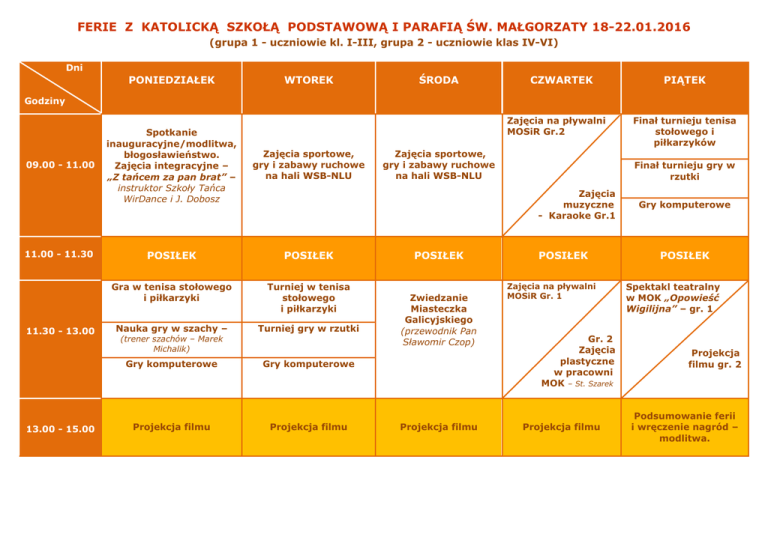 FERIE Z KATOLICKĄ SZKOŁĄ PODSTAWOWĄ I PARAFIĄ ŚW. MAŁGORZATY 18-22.01.2016 (grupa 1 - uczniowie kl. I-III, grupa 2 - uczniowie klas IV-VI) Dni PONIEDZIAŁEK WTOREK ŚRODA CZWARTEK PIĄTEK Godziny 09.00 - 11.00 11.00 - 11.30 11.30 - 13.00 13.00 - 15.00 Zajęcia na pływalni MOSiR Gr.2 Spotkanie inauguracyjne/modlitwa, błogosławieństwo. Zajęcia integracyjne – „Z tańcem za pan brat” – instruktor Szkoły Tańca WirDance i J. Dobosz Zajęcia sportowe, gry i zabawy ruchowe na hali WSB-NLU POSIŁEK POSIŁEK Gra w tenisa stołowego i piłkarzyki Turniej w tenisa stołowego i piłkarzyki Nauka gry w szachy – Turniej gry w rzutki Zajęcia sportowe, gry i zabawy ruchowe na hali WSB-NLU Finał turnieju gry w rzutki Zajęcia muzyczne - Karaoke Gr.1 (trener szachów – Marek Michalik) Gry komputerowe Gry komputerowe Projekcja filmu Projekcja filmu POSIŁEK Zwiedzanie Miasteczka Galicyjskiego (przewodnik Pan Sławomir Czop) Projekcja filmu Finał turnieju tenisa stołowego i piłkarzyków POSIŁEK Zajęcia na pływalni MOSiR Gr. 1 Gr. 2 Zajęcia plastyczne w pracowni MOK – St. Szarek Projekcja filmu Gry komputerowe POSIŁEK Spektakl teatralny w MOK „Opowieść Wigilijna” – gr. 1 Projekcja filmu gr. 2 Podsumowanie ferii i wręczenie nagród – modlitwa.