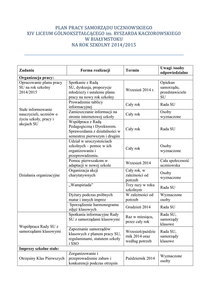 PLAN PRACY SAMORZĄDU UCZNIOWSKIEGO XIV LICEUM GÓLNOKSZTAŁCĄCEGO im. RYSZARDA KACZOROWSKIEGO W BIAŁYMSTOKU NA ROK SZKOLNY 2014/2015 Zadania Organizacja pracy: Opracowanie planu pracy SU na rok szkolny 2014/2015 Stałe informowanie nauczycieli, uczniów o życiu szkoły, pracy i akcjach SU Działania organizacyjne Forma realizacji Spotkanie z Radą SU, dyskusja, propozycje młodzieży i ustalenie planu pracy na nowy rok szkolny Prowadzenie tablicy informacyjnej Zamieszczanie informacji na stronie internetowej szkoły Współpraca z Radą Pedagogiczną i Dyrektorem. Sprawozdania z działalności w semestrze pierwszym i drugim Udział w uroczystościach szkolnych – pomoc w ich organizowaniu i przeprowadzeniu. Pomoc pierwszakom w adaptacji w nowej szkole Organizacja akcji charytatywnych „Wampiriada” Dyżury podczas próbnych matur i innych imprez Sporządzenie harmonogramu zdjęć klasowych Spotkania informacyjne Rady SU z samorządami klasowymi Współpraca Rady SU z samorządami klasowymi Zapoznanie samorządów klasowych z planem pracy SU, regulaminami, statutem szkoły i SSO Termin Uwagi /osoby odpowiedzialne Wrzesień 2014 r. Opiekun samorządu, przedstawiciele SU Cały rok Rada SU Cały rok Osoby wyznaczone Cały rok Rada SU Cały rok Osoby wyznaczone Wrzesień 2014 Cała społeczność uczniowska Cały rok, w zależności od potrzeb Trzy razy w roku szkolnym W zależności od potrzeb Osoby wyznaczone Rada SU Wyznaczone osoby Grudzień 2014 Rada SU Raz w miesiącu, przez cały rok Rada SU, samorządy klasowe Wrzesień/paździe rnik 2014 oraz według potrzeb Rada SU, samorządy klasowe Październik 2014 Wyznaczone osoby Imprezy szkolne stałe: Zorganizowanie i Otrzęsiny Klas Pierwszych przeprowadzenie zabaw i konkurencji podczas otrzęsin Obchody Dnia Edukacji Narodowej Obchody Dnia Niepodległości Wybory nowych władz SU Wigilia szkolna Ślubowanie Klas Pierwszych Walentynki II Podlaskie Forum Klas Mundurowych Pierwszy Dzień Wiosny – dzień samorządności Zakończenie roku klasy III Dzień otwarty W Zespole Szkół Ogólnokształcących Nr 9 w Białymstoku Dzień sportu Zakończenie roku szkolnego Uroczystość organizowana razem z Samorządem Uczniowskim gimnazjum. Koncert Życzeń Wspólne śpiewanie pieśni patriotycznych Wybory Zarządu SU Zorganizowanie wigilii szkolnej, jasełka szkolne Wspólne śpiewanie kolęd Pomoc przy organizacji uroczystości Ślubowania Klas Pierwszych Udekorowanie szkoły w elementy kojarzące się ze świętem zakochanych (serca, balony, girlandy w kolorze czerwonym). Zorganizowanie poczty walentynkowej, rozdanie walentynek nastąpi w piątek (13 lutego). Debata i zajęcia integrujące klasy mundurowe woj. podlaskiego Okolicznościowa gazetka, konkursy tematyczne Uroczysty apel na zakończenie roku szkolnego – przygotowanie i pomoc w jego przeprowadzeniu Pomoc w organizacji Dnia Otwartego, spotkanie z gimnazjalistami, ciekawe zajęcia Organizacja rozgrywek sportowych Uroczysty apel na zakończenie roku szkolnego – przygotowanie i pomoc w jego przeprowadzeniu 14 października 2014 10 listopad 2014 Listopad 2014 Cała społeczność uczniowska Cała społeczność uczniowska Przedstawiciele wszystkich klas Grudzień 2014 Cała społeczność uczniowska Luty 2015 Cała społeczność uczniowska Luty 2015 Cała społeczność uczniowska Marzec 2015 Opiekunowie SU, Rada SU Marzec 2015 Cała społeczność uczniowska Kwiecień 2015 Uczniowie klas II Kwiecień 2015 Cała społeczność uczniowska Czerwiec 2015 Cała społeczność uczniowska Czerwiec 2015 Uczniowie klasy I Cały rok Cała społeczność uczniowska Pozostałe imprezy: Promowanie szkoły w środowisku lokalnym i rówieśniczym Spotkania z gimnazjalistami Promowanie zdrowego stylu życia Organizacja międzyszkolnych i szkolnych rozgrywek Cały rok sportowych Zorganizowanie Dnia Cały rok Zdrowego Odżywiania Nauczyciel w-f, społeczność uczniowska Opiekun samorządu, społeczność uczniowska Dbanie o własny rozwój Spotkanie z przedstawicielem W miarę służby zdrowia, policji i innych instytucji możliwości Pedagog szkolny, Spotkanie ze sławną osobą (sport, kultura) Pedagog szkolny, opiekun samorządu, społeczność uczniowska Pedagog szkolny, opiekun samorządu, społeczność uczniowska Spotkania z absolwentami liceum oraz przedstawicielami uczelni wyższych W miarę możliwości Styczeń 2015 opiekun samorządu, społeczność uczniowska Skład Rady Samorządu Uczniowskiego: Przewodniczący: Martyna Danowska Zastępca przewodniczącego: Magdalena Oświecińska Dawid Łukasiuk Natalia Maksimowicz