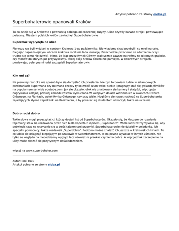 Artykuł pobrano ze strony eioba.pl Superbohaterowie opanowali Kraków To co dzieje się w Krakowie z pewnością odbiega od codziennej rutyny. Ulice ożywiły barwne stroje i powiewające peleryny. Miastem polskich królów zawładnęli Superbohaterowie Supermoc wypłynęła na ulice Pierwszy raz byli widziani w centrum Krakowa 1-go października. Nie wiadomo skąd przybyli i co mieli na celu. Biegając najważniejszymi ulicami Krakowa robili nie lada sensację. Przechodnie przecierali ze zdumienia oczy i trudno się temu nie dziwić. Mimo, że idąc przez Rynek Główny praktycznie zawsze natrafimy na ulicznych grajków, czy mimów do których już przywykliśmy, takiej akcji Kraków dawno nie pamiętał. W kolorowych strojach, powiewając pelerynami ludzi zaczepiali Superbohaterowie. Kim oni są? Na pierwszy rzut oka nie sposób było się domyśleć ich przesłania. Nie byli to bowiem ludzie w sztampowych przebraniach Supermana czy Batmana chcący tylko zrobić szum wokół siebie i pragnący stać się gwiazdą filmików na popularnym serwisie youtube.com. Jak się okazało, obok nie znajdowały się kamery i statyści, więc opcja nagrywania kolejnej polskiej komedii została wykluczona. W kolejnych dniach widziano ich w okolicach Dworca Głównego, na Plantach, wokół Rynku Głównego, czy przy Wiśle. Mogliśmy się nawet natknąć na Superbohaterów zajadających słynne zapiekanki na Kazimierzu, a by pokazać się studentom wkroczyli, także na uczelnie. Dobro rodzi dobro Takie słowa mogli przeczytać ci, którzy dostali list od Superbohaterów. Okazało się, że kluczem do rozwiania tajemnicy stała się rozdawana przez nich biała koperta z napisem „Superdobro”. Wiele ludzi zatrzymywało się, aby poświęcić czas na wczytanie się w treść tajemniczej przesyłki. Superbohaterowie nie działali w pojedynkę, ich specjalni pomocnicy, także rozdawali „Superdobro”. Podobno można znaleźć ich jeszcze w krakowskich kinach. To co udało się osiągnąć biegającym po Krakowie w Superbohaterom, to na pewno wywołać w innych uśmiech. Nie tylko ze względu na niecodzienny wygląd, lecz również na przekaz czynienia dobra. A więc jednak zaczepienie na ulicy może okazać się pozytywnym doświadczeniem. więcej na www.superbohater.com Autor: Emil Holu Artykuł pobrano ze strony eioba.pl