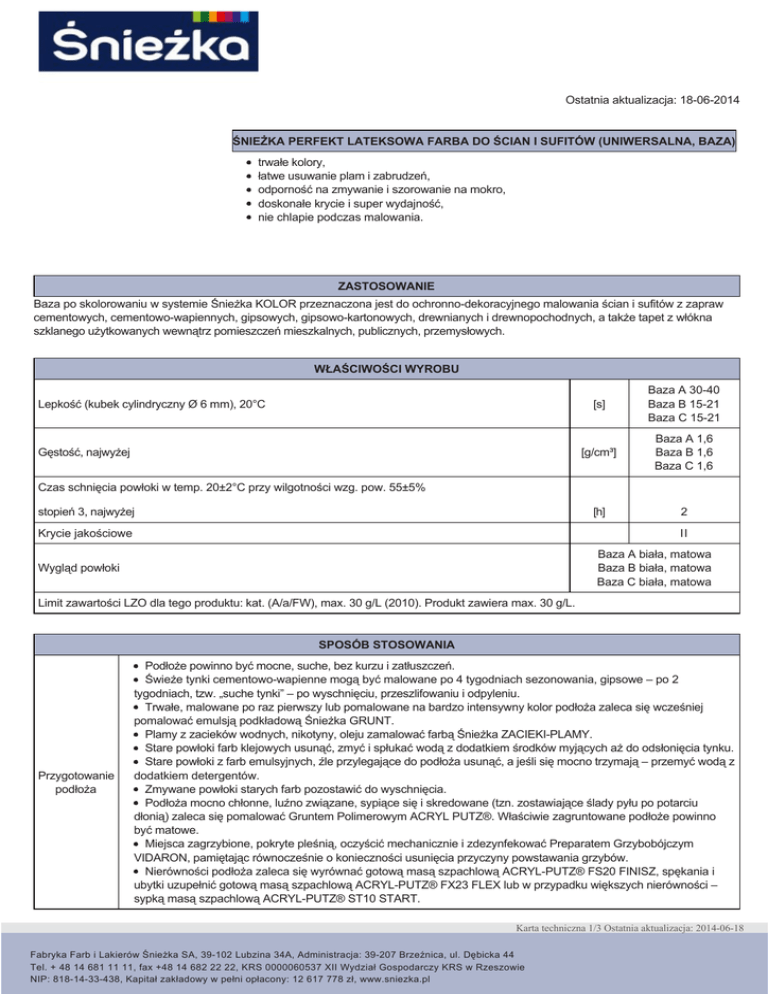 Ostatnia aktualizacja: 18-06-2014 ŚNIEŻKA PERFEKT LATEKSOWA FARBA DO ŚCIAN I SUFITÓW (UNIWERSALNA, BAZA) trwałe kolory, ŚNIEŻKA_PERFEKT_LATEKSOWA_FARBA_DO_ŚCIAN_I_SUFITÓW_(UNIWERSALNA,_BAZA) łatwe usuwanie plam i zabrudzeń, odporność na zmywanie i szorowanie na mokro, doskonałe krycie i super wydajność, nie chlapie podczas malowania. ZASTOSOWANIE Baza po skolorowaniu w systemie Śnieżka KOLOR przeznaczona jest do ochronnodekoracyjnego malowania ścian i sufitów z zapraw cementowych, cementowowapiennych, gipsowych, gipsowokartonowych, drewnianych i drewnopochodnych, a także tapet z włókna szklanego użytkowanych wewnątrz pomieszczeń mieszkalnych, publicznych, przemysłowych. WŁAŚCIWOŚCI WYROBU Lepkość (kubek cylindryczny Ø 6 mm), 20°C Gęstość, najwyżej [s] Baza A 30-40 Baza B 15-21 Baza C 15-21 [g/cm³] Baza A 1,6 Baza B 1,6 Baza C 1,6 [h] 2 Czas schnięcia powłoki w temp. 20±2°C przy wilgotności wzg. pow. 55±5% stopień 3, najwyżej Krycie jakościowe II Baza A biała, matowa Baza B biała, matowa Baza C biała, matowa Wygląd powłoki Limit zawartości LZO dla tego produktu: kat. (A/a/FW), max. 30 g/L (2010). Produkt zawiera max. 30 g/L. SPOSÓB STOSOWANIA Przygotowanie podłoża Podłoże powinno być mocne, suche, bez kurzu i zatłuszczeń. Świeże tynki cementowowapienne mogą być malowane po 4 tygodniach sezonowania, gipsowe – po 2 tygodniach, tzw. „suche tynki” – po wyschnięciu, przeszlifowaniu i odpyleniu. Trwałe, malowane po raz pierwszy lub pomalowane na bardzo intensywny kolor podłoża zaleca się wcześniej pomalować emulsją podkładową Śnieżka GRUNT. Plamy z zacieków wodnych, nikotyny, oleju zamalować farbą Śnieżka ZACIEKIPLAMY. Stare powłoki farb klejowych usunąć, zmyć i spłukać wodą z dodatkiem środków myjących aż do odsłonięcia tynku. Stare powłoki z farb emulsyjnych, źle przylegające do podłoża usunąć, a jeśli się mocno trzymają – przemyć wodą z dodatkiem detergentów. Zmywane powłoki starych farb pozostawić do wyschnięcia. Podłoża mocno chłonne, luźno związane, sypiące się i skredowane (tzn. zostawiające ślady pyłu po potarciu dłonią) zaleca się pomalować Gruntem Polimerowym ACRYL PUTZ®. Właściwie zagruntowane podłoże powinno być matowe. Miejsca zagrzybione, pokryte pleśnią, oczyścić mechanicznie i zdezynfekować Preparatem Grzybobójczym VIDARON, pamiętając równocześnie o konieczności usunięcia przyczyny powstawania grzybów. Nierówności podłoża zaleca się wyrównać gotową masą szpachlową ACRYLPUTZ® FS20 FINISZ, spękania i ubytki uzupełnić gotową masą szpachlową ACRYLPUTZ® FX23 FLEX lub w przypadku większych nierówności – sypką masą szpachlową ACRYLPUTZ® ST10 START. Karta techniczna 1/3 Ostatnia aktualizacja: 2014-06-18 Fabryka Farb i Lakierów Śnieżka SA, 39102 Lubzina 34A, Administracja: 39207 Brzeźnica, ul. Dębicka 44 Tel. + 48 14 681 11 11, fax +48 14 682 22 22, KRS 0000060537 XII Wydział Gospodarczy KRS w Rzeszowie NIP: 8181433438, Kapitał zakładowy w pełni opłacony: 12 617 778 zł, www.sniezka.pl Baza nie jest wyrobem gotowym do użycia, wymaga uprzedniego zabarwienia w systemie kolorowania. Farbę przed malowaniem dokładnie wymieszać. Przed dozowaniem pigmentu opakowanie odwrócić deklem do dołu – zapewni to równomierne wymieszanie produktu. Do farby nie dodawać wapna, kredy, bieli tytanowej, ani nie mieszać z innymi farbami. Farby z różnych partii produkcyjnych wymieszać razem przed ich użyciem. ŚNIEŻKA_PERFEKT_LATEKSOWA_FARBA_DO_ŚCIAN_I_SUFITÓW_(UNIWERSALNA,_BAZA) Przed przystąpieniem do malowania należy sprawdzić na małym fragmencie zgodność koloru. Przygotowanie Przed przystąpieniem do malowania większej płaszczyzny przygotować wystarczającą ilość farby – w celu wyrobu zapewnienia jednolitego efektu kolorystycznego, zaleca się farby z różnych partii produkcyjnych lub różnych wielkości opakowań wymieszać razem. Do pierwszego malowania świeżych niegruntowanych podłoży zaleca się rozcieńczyć farbę, w zależności od chłonności podłoża dodając do 10% wody. Na zagruntowane podłoże nakładać farbę nierozcieńczoną. Do malowania tapet z włókna szklanego(w zależności od ich struktury) dopuszczalne jest 10procentowe rozcieńczenie produktu. Malowanie UWAGI Malować wewnątrz pomieszczeń w temperaturze otoczenia i podłoża od +10°C do +30°C. Nakładać pędzlem, wałkiem lub natryskiem dwie warstwy farby – warstwę drugą po wyschnięciu poprzedniej tj. po około 24 h. W przypadku podłoży niegruntowanych do pierwszego malowania wyrób rozcieńczyć dodając maksymalnie 10%. Kolejne dwie warstwy farby nakładać bez rozcieńczania. Narzędzia po zakończeniu prac malarskich umyć w wodzie. Pełne właściwości wytrzymałościowe powłoka uzyskuje po 28 dniach. W czasie prac malarskich i po ich zakończeniu pomieszczenie wietrzyć do zaniku zapachu. Przechowywać i magazynować w szczelnie zamkniętych pojemnikach. PARAMETRY MALOWANIA DLA POSZCZEGÓLNYCH METOD PARAMETRY MALOWANIA METODY lepkość farby dodatek rozcieńczalnika [s] [%] [mm] [MPa] postać handlowa - - - 2 postać handlowa - 0,43÷0,66 20÷21 1-2 MALOWANIA Pędzel, wałek średnica dyszy pistoletu ciśnienie natrysku zalecana ilość warstw Natrysk hydrodynamiczny* * natrysk wykonany na urządzeniach firmy Graco, model 395 ST PRO OKRES PRZYDATNOŚCI OKRES PRZYDATNOŚCI: 48 miesięcy od daty produkcji TEMPERATURA PRZECHOWYWANIA: od +5ºC do +30ºC OPAKOWANIA 9,4L, 4,7L, 2,82L, 940ml WYDAJNOŚĆ do 14 m²/L przy jednokrotnym malowaniu KOLORYSTYKA Karta techniczna 2/3 Ostatnia aktualizacja: 2014-06-18 Fabryka Farb i Lakierów Śnieżka SA, 39102 Lubzina 34A, Administracja: 39207 Brzeźnica, ul. Dębicka 44 Tel. + 48 14 681 11 11, fax +48 14 682 22 22, KRS 0000060537 XII Wydział Gospodarczy KRS w Rzeszowie NIP: 8181433438, Kapitał zakładowy w pełni opłacony: 12 617 778 zł, www.sni