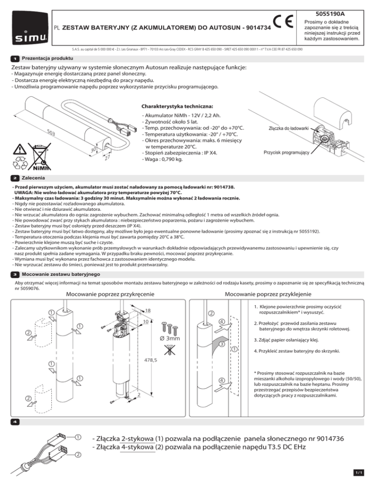 5055190A PL ZESTAW BATERYJNY (Z AKUMULATOREM) DO AUTOSUN - 9014734 Prosimy o dokładne zapoznanie się z treścią niniejszej instrukcji przed każdym zastosowaniem. S.A.S. au capital de 5 000 000 - Z.I. Les Giranaux - BP71 - 70103 Arc-Les-Gray CEDEX - RCS GRAY B 425 650 090 - SIRET 425 650 090 00011 - n° T.V.A CEE FR 87 425 650 090 1 Prezentacja produktu Zestaw bateryjny używany w systemie słonecznym Autosun realizuje następujące funkcje: - Magazynuje energię dostarczaną przez panel słoneczny. - Dostarcza energię elektryczną niezbędną do pracy napędu. - Umożliwia programowanie napędu poprzez wykorzystanie przycisku programującego. Charakterystyka techniczna: - Akumulator NiMh - 12V / 2,2 Ah. - Żywotność około 5 lat. - Temp. przechowywania: od -20° do +70°C. - Temperatura użytkowania: -20° / +70°C. - Okres przechowywania: maks. 6 miesięcy w temperaturze 20°C. - Stopień zabezpieczenia : IP X4. - Waga : 0,790 kg. 50 3 30 27 Złączka do ładowarki Przycisk programujący NiMh 2 Zalecenia - Przed pierwszym użyciem, akumulator musi zostać naładowany za pomocą ładowarki nr: 9014738. UWAGA: Nie wolno ładować akumulatora przy temperaturze powyżej 70°C. - Maksymalny czas ładowania: 3 godziny 30 minut. Maksymalnie można wykonać 2 ładowania rocznie. - Nigdy nie pozostawiać roz!adowanego akumulatora. - Nie otwierać i nie dziurawić akumulatora. - Nie wrzucać akumulatora do ognia: zagrożenie wybuchem. Zachować minimalną odległość 1 metra od wszelkich źródeł ognia. - Nie powodować zwarć przy stykach akumulatora : niebezpieczeństwo poparzenia, pożaru i zagrożenie wybuchem. - Zestaw bateryjny musi być osłonięty przed deszczem (IP X4). - Zestaw bateryjny musi być łatwo dostępny, aby możliwe było jego ewentualne ponowne ładowanie (prosimy zpoznać się z instrukcją nr 5055192). - Temperatura otoczenia podczas klejenia musi być zawarta pomiędzy 20°C a 38°C. - Powierzchnie klejone muszą być suche i czyste. - Zalecamy użytkownikom wykonanie prób przemysłowych w warunkach dokładnie odpowiadających przewidywanemu zastosowaniu i upewnienie się, czy nasz produkt spełnia zadane wymagania. W przypadku braku pewności, mocować poprzez przykręcanie. - Wymiana musi być wykonana przez fachowca z zastosowaniem identycznego modelu. - Nie wyrzucać zestawu do śmieci, ponieważ jest to produkt przetwarzalny. 3 Mocowanie zestawu bateryjnego Aby otrzymać więcej informacji na temat sposobów montażu zestawu bateryjnego w zależności od rodzaju kasety, prosimy o zapoznanie się ze specyfikacją techniczną nr 5059076. Mocowanie poprzez przykręcenie Mocowanie poprzez przyklejenie 18 1 4 10 1 2 1. Klejone powierzchnie prosimy oczyścić rozpuszczalnikiem* i wysuszyć. 2 Ø 3mm 3 2. Przełożyć przewód zasilania zestawu bateryjnego do wnętrza skrzynki roletowej. 3. Zdjąć papier osłaniający klej. 1 4. Przykleić zestaw bateryjny do skrzynki. 478,5 1 1 4 2 2 * Prosimy stosować rozpuszczalnik na bazie mieszanki alkoholu izopropylowego i wody (50/50), lub rozpuszczalnik na bazie heptanu. Prosimy przestrzegać przepisów bezpieczeństwa dotyczących pracy z rozpuszczalnikami. 4 1 - Złączka 2-stykowa (1) pozwala na podłączenie panela słonecznego nr 9014736 - Złączka 4-stykowa (2) pozwala na podłączenie napędu T3.5 DC EHz 2 1/1