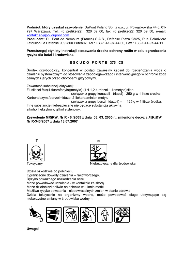 Podmiot, który uzyskał zezwolenie: DuPont Poland Sp. z o.o., ul. Powązkowska 44 c, 01797 Warszawa. Tel.: (0 prefiks-22) 320 09 00, fax: (0 prefiks-22) 320 09 50, e-mail: [email protected] Producent: Du Pont de Nemours (France) S.A.S., Défense Plaza 23/25, Rue Delariviere Lefoullon La Défense 9, 92800 Puteaux, Tel.: +33-1-41-97-44-00, Fax.: +33-1-41-97-44-11 Przestrzegaj etykiety-instrukcji stosowania środka ochrony roślin w celu ograniczenia ryzyka dla ludzi i środowiska. E S C U D O F O R T E 375 CS Środek grzybobójczy, koncentrat w postaci zawiesiny kapsuł do rozcieńczania wodą o działaniu systemicznym do stosowania zapobiegawczego i interwencyjnego w ochronie zbóż ozimych i jarych przed chorobami grzybowymi. Zawartość substancji aktywnej: Flusilazol /bis(4-fluorofenylo)(metylo)-(1H-1,2,4-triazol-1-ilometylo)silan (związek z grupy konazoli - triazol) - 250 g w 1 litrze środka Karbendazym /benzoimidazol-2-ilokarbaminian metylu (związek z grupy benzimidazoli) – 125 g w 1 litrze środka. Inne substancje niebezpieczne nie będące substancją aktywną: alkohol heksylowy, glikol etylenowy. Zezwolenie MRiRW. Nr R - 6 /2005 z dnia 03. 03. 2005 r., zmienione decyzją MRiRW Nr R-343/2007 z dnia 18.07.2007 Toksyczny Niebezpieczny dla środowiska Działa szkodliwie po połknięciu. Ograniczone dowody działania – rakotwórczego. Ryzyko poważnego uszkodzenia oczu. Może powodować uczulenie - w kontakcie ze skórą. Może działać szkodliwie na dziecko w – łonie matki. Możliwe ryzyko powstania - nieodwracalnych zmian w stanie zdrowia. Działa toksycznie na organizmy wodne, może powodować długo utrzymujące się niekorzystne zmiany w środowisku wodnym. Uwaga! 2 1. Zabrania się stosowania środka w strefie bezpośredniej ochrony ujęć wody oraz na terenie uzdrowisk, otulin parków narodowych i rezerwatów. 2. Nie zanieczyszczać wód środkiem ochrony roślin lub jego opakowaniem. ZAKRES STOSOWANIA, TERMINY I DAWKI Zboża ozime. pszenica ozima - łamliwość źdźbła, rdza brunatna, septorioza liści, septorioza plew, zgorzel podstawy źdźbła, mączniak prawdziwy, fuzarioza kłosów; pszenżyto ozime - łamliwość źdźbła, fuzaryjna zgorzel podstawy źdźbła, mączniak prawdziwy, septorioza liści, septorioza plew, fuzarioza kłosów, rdza brunatna;. jęczmień ozimy - łamliwość źdźbła, zgorzel podstawy źdźbła, mączniak prawdziwy, rynchosporioza, rdza karłowa, fuzarioza kłosów; żyto - łamliwość źdźbła, fuzaryjna zgorzel podstawy źdźbła, mączniak prawdziwy, rdza brunatna, septorioza, rynchosporioza, fuzarioza kłosów; Zalecana dawka: 0,8 l/ha. Zalecana ilość wody: 200-400 l/ha. Zboża jare. pszenica jara - mączniak prawdziwy, brunatna plamistość liści; pszenżyto jare - mączniak prawdziwy; jęczmień jary - mączniak prawdziwy, rdza karłowa, Zalecana dawka: 0,8 l/ha. Zalecana ilość wody: 200-400 l/ha. Zalecane opryskiwanie: drobnokropliste Środek stosować zapobiegawczo lub z chwilą wystąpienia pierwszych objawów chorób: • pszenica, pszenżyto, żyto : od początku fazy strzelania w źdźbło do końca fazy kłoszenia, • jęczmień: od końca fazy krzewienia do końca fazy kłoszenia. Uwaga! 3 W warunkach sprzyjających rozwojowi chorób grzybowych pszenicy i pszenżyta zalecany termin zabiegu opryskiwania można przedłużyć do fazy dojrzałości wodnej ziarna. Termin wykonania zabiegu musi uwzględniać karencję środka. UWAGI: 1. Do zwalczania mączniaka prawdziwego zbóż Escudo Forte 375 CS stosować zapobiegawczo lub natychmiast po zauważeniu pierwszych objawów choroby. 2. Środka nie stosować na rośliny mokre lub pokryte rosą. Opady deszczu występujące wcześniej niż w dwie godziny po zabiegu mogą obniżyć skuteczność zabiegu. OKRES KARENCJI (okres od dnia ostatniego zabiegu do dnia zbioru roślin przeznaczonych do konsumpcji): zboża - 35 dni. OKRES PREWENCJI DLA LUDZI, PSZCZÓŁ I ZWIERZĄT (okres zapobiegający zatruciu): NIE DOTYCZY. SPORZĄDZANIE CIECZY UŻYTKOWEJ Przed przystąpieniem do sporządzania cieczy użytkowej dokładnie ustalić potrzebną jej ilość. Zawartością opakowania przed użyciem wstrząsnąć. Odmierzoną ilość środka wlać do zbiornika opryskiwacza napełnionego częściowo wodą (z włączonym mieszadłem) i uzupełnić wodą do potrzebnej ilości. Opryskiwać z włączonym mieszadłem. Po wlaniu środka do zbiornika opryskiwacza nie wyposażonego w mieszadło hydrauliczne ciecz mechaniczne wymieszać. Opróżnione opakowania przepłukać trzykrotnie wodą, a popłuczyny wlać do zbiornika opryskiwacza z cieczą użytkową. Po pracy aparaturę dokładnie wymyć. PRZECHOWYWANIE Przechowywać z dala od źródeł ciepła. Nie przechowywać razem z żywnością, napojami i paszami dla zwierząt. Przechowywać pod zamknięciem i chronić przed dziećmi. Przechowywać wyłącznie w oryginalnym opakowaniu w temperaturze nie niższej niż 0oC i nie wyższej niż 30oC. WARUNKI BEZPIECZNEGO STOSOWANIA ŚRODKA Zanieczyszczone oczy przemyć natychmiast dużą ilością wody i zasięgnąć porady lekarza. 4 Nosić odpowiednią odzież ochronną, odpowiednie rękawice ochronne i okulary lub ochronę twarzy. Unikać narażenia - przed użyciem zapoznać się z instrukcją Nie spożywać posiłków i napojów oraz nie palić tytoniu podczas stosowania środka. Nie wdychać par cieczy użytkowej. Unikać zanieczyszczenia skóry i oczu. W przypadku zanieczyszczenia skóry natychmiast przemyć ją dużą ilością wody. W razie połknięcia niezwłocznie zasięgnij porady lekarza - pokaż opakowanie lub etykietę. Resztki cieczy użytkowej rozcieńczyć wodą i wypryskać na powierzchni poprzednio opryskiwanej. Wodę użytą do mycia aparatury wypryskać na powierzchni poprzednio opryskiwanej, stosując te same środki ochrony osobistej. Środek i opakowania usuwać jako odpad niebezpieczny. Używać odpowiednich pojemników zapobiegających skażeniu środowiska. Opróżnione o
