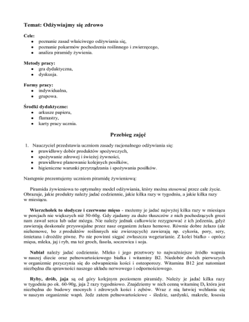 Temat: Odżywiajmy się zdrowo Cele: poznanie zasad właściwego odżywiania się, poznanie pokarmów pochodzenia roślinnego i zwierzęcego, analiza piramidy żywienia. Metody pracy: gra dydaktyczna, dyskusja. Formy pracy: indywidualna, grupowa. Środki dydaktyczne: arkusze papieru, flamastry, karty pracy ucznia. Przebieg zajęć 1. Nauczyciel przedstawia uczniom zasady racjonalnego odżywiania się: prawidłowy dobór produktów spożywczych, spożywanie zdrowej i świeżej żywności, prawidłowe planowanie kolejnych posiłków, higieniczne warunki przyrządzania i spożywania posiłków. Następnie prezentujemy uczniom piramidę żywieniową: Piramida żywieniowa to optymalny model odżywiania, który można stosować przez całe życie. Obrazuje, jakie produkty należy jadać codziennie, jakie kilka razy w tygodniu, a jakie kilka razy w miesiącu. Wierzchołek to słodycze i czerwone mięso - możemy je jadać najwyżej kilka razy w miesiącu w porcjach nie większych niż 50-60g. Gdy zjadamy za dużo tłuszczów z nich pochodzących grozi nam zawał serca lub udar mózgu. Nie należy jednak całkowicie rezygnować z ich jedzenia, gdyż zawierają doskonale przyswajalne przez nasz organizm żelazo hemowe. Równie dobre żelazo (ale niehemowe, bo z produktów roślinnych nie zwierzęcych) zawierają np. cykoria, pory, sery, śmietana i drożdże piwne. Po nie powinni sięgać zwłaszcza wegetarianie. Z kolei białko - oprócz mięsa, mleka, jaj i ryb, ma też groch, fasola, soczewica i soja. Nabiał należy jadać codziennie. Mleko i jego przetwory to najważniejsze źródło wapnia w naszej diecie oraz pełnowartościowego białka i witaminy B2. Niedobór dwóch pierwszych w organizmie przyczynia się do odwapnienia kości i osteoporozy. Witamina B12 jest natomiast niezbędna dla sprawności naszego układu nerwowego i odpornościowego. Ryby, drób, jaja są od góry kolejnym poziomem piramidy. Należy je jadać kilka razy w tygodniu po ok. 60-90g, jaja 2 razy tygodniowo. Znajdziemy w nich cenną witaminę D, która jest niezbędna do budowy mocnych i zdrowych kości i zębów. Wraz z nią łatwiej wchłania się w naszym organizmie wapń. Jedz zatem pełnowartościowe - śledzie, sardynki, makrele, łososia i tuńczyka, które bogate są w kwasy omega-3. Aby dłużej zachować sprawność umysłową jedz też pokarmy niskowęglowodanowe, wysokobiałkowe i niskotłuszczowe, czyli np. chude mięso indyka i kurczaka. Tłuszcze roślinne możesz jadać codziennie w ilości 2 łyżek. Są one bogate w nienasycone kwasy tłuszczowe, które nie podnoszą stężenia cholesterolu we krwi. Zamiast masła używaj więc margaryny lub masła roślinnego; zamiast smażonych dań jedz potrawy duszone, pieczone lub gotowane. Do smażenia używaj oleju rzepakowego, zaś do sałatek oliwy z pestek winogron, oliwy z oliwek, oleju słonecznikowego lub sojowego. Owoce i warzywa można jadać codziennie i to przy każdy posiłku (czyli 5 porcji), po 500-800g. To one są najbogatszym naturalnym źródłem witamin i składników mineralnych, bez których nie moglibyśmy prawidłowo funkcjonować. Ponadto chronią nas przed chorobami układu krążenia, mają dużo antyoksydantów i błonnika, a do tego są mało kaloryczne. Produkty zbożowe jadaj codziennie po kilka porcji. Mogą to być 2 kromki ciemnego pieczywa, pół szklanki ryżu lub makaronu pełne ziarno czy też 3/4 szklanki płatków śniadaniowych. Ważne dla naszego organizmu są produkty o niskim stopniu przetworzenia, czyli np. grube kasze, ciemne pieczywo, niełuskany ciemny ryż, płatki owsiane czy też kukurydziane. Są one doskonałym źródłem błonnika, witamin i minerałów. Regulują pracę układu pokarmowego i niwelują zaparcia. 2. Uczniowie pracują w czteroosobowych grupach. Każda grupa przygotowuje jadłospis na jeden dzień. (Na karcie pracy. Śniadanie, II śniadanie, obiad, podwieczorek, kolację). Następnie przedstawiciele grup prezentują opracowane jadłospisy. Wszyscy uczniowie analizują, czy posiłki przedstawiane przez poszczególne grupy są zgodne z zasadami racjonalnego żywienia. 3. Kolejnym krokiem jest wypisanie przez grupy produktów pochodzenia roślinnego i zwierzęcego. Po wykonaniu zadania uczniowie prezentują swoje prace. 4. Uczniowie odgrywają scenki: Jak się czujemy, gdy jesteśmy głodni oraz jak się czujemy, gdy jesteśmy najedzeni. 5. Praca domowa: zastanów się, czy to, co lubisz jeść, jest zdrowe. Bogusław Cwaliński