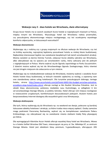 Wakacje razy 2 - dwa hotele we Wrocławiu, dwie alternatywy Grupa Accor Hotels ma w swoich zasobach liczne hotele w największych miastach w Polsce, między innymi we Wrocławiu. Wyszukując hotel we Wrocławiu należy przemyśleć, czy poszukujemy ekonomicznego miejsca noclegowego, czy też oczekujemy wysokiego komfortu odpoczynku, w luksusowych warunkach? Wakacje ekonomiczne Wybierając się z rodziną czy z grupą znajomych na dłuższe wakacje do Wrocławia, czy też na krótką wycieczkę, najczęściej będziemy poszukiwać hotelu w niskiej klasie budżetowej. Najbardziej interesować będzie nas zwiedzanie bezpłatnych lub tanich wrocławskich atrakcji. Można zwiedzić za darmo Ostrów Tumski, zobaczyć liczne obiekty sakralne we Wrocławiu, albo zdecydować się na spacery po wrocławskim rynku, który zaliczany jest do jednych z najpiękniejszych w Polsce. Warto wybrać się do Ogrodu Japońskiego w Parku Szczytnickim. Z dziećmi można wybrać się też do Wrocławskiego Ogrodu Zoologicznego, który również nie jest drogim miejscem do zobaczenia w tym mieście. Wybierając się na niskobudżetowe wakacje do Wrocławia, możemy wybrać z zasobów Accor Hotels hotele klasy budżetowej, w których niewiele zapłacimy za nocleg, a zapewnią nam one standardowy zakres usług hotelowych. Dla turystów poszukujących dobrego, taniego hotelu, strona http://www.accorhotels.com/pl/hotel-6603-ibis-budget-wroclaw-poludnieprzedtem-etap-hotel/index.shtml oferuje noclegi w Ibis Budżet Wrocław Południe. Jest to obiekt klasy ekonomicznej, położony niedaleko Lasu Kuźnickiego, w odległości 6 km od wrocławskiego Starego Miasta, w pobliżu lotniska. Hotel oferuje 122 miejsca noclegowe w nowocześnie urządzonych, komfortowych dwuosobowych pokojach. Atutem hotelu jest bezprzewodowy Internet dostępny dla wszystkich gości oraz klimatyzacja. Wakacje ekskluzywne Dla tych, którzy wybierają się do Wrocławia np. na weekend we dwoje, polecane są bardziej luksusowe obiekty hotelowe i atrakcje, za które trzeba nieco więcej zapłacić. Osoby zamożne mogą podziwiać Panoramę Racławicką, wybrać się na kompleksowe zwiedzanie Pałacu Królewskiego, czy zdecydować się na zwiedzanie miasta statkami białej floty pływającej po Odrze. Dla wymagających klientów Accor Hotels oferuje wysokiej klasy hotel we Wrocławiu. Mowa tu o hotelu Sofitel Wroclaw Old Town, mieszczącym się przy ul. Św. Mikołaja 67, w centrum Starego Miasta. Hotel jest obiektem klasy premium, 5-gwiazdkowym, oferującym 205 komfortowo wyposażonych pokoi. Znajduje się w nim 6th Sense Wellness Center z siłownią, jacuzzi, łaźnią parową, sauną i masażami balijskimi. Więcej szczegółów znajdziesz na stronie: http://www.accorhotels.com/pl/hotel-5345-sofitel-wroclaw-old-town/index.shtml. Jeżeli więc planujesz wybrać się do Wrocławia, bądź pewny, że rezerwujesz hotel na miarę swoich wymagań. Skorzystaj z oferty Accorhotels i śpij spokojnie! http://www.accorhotels.com/pl/polska/index.shtml – ponad 3800 hoteli na całym świecie!