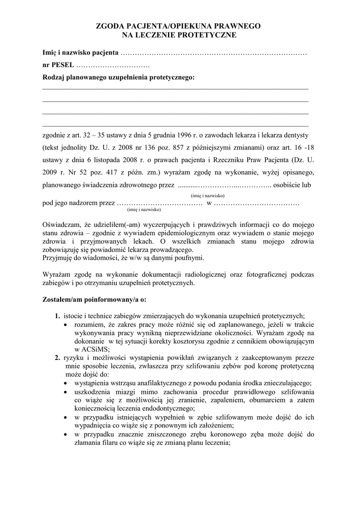 zgoda pacjenta/opiekuna prawnego na leczenie protetyczne