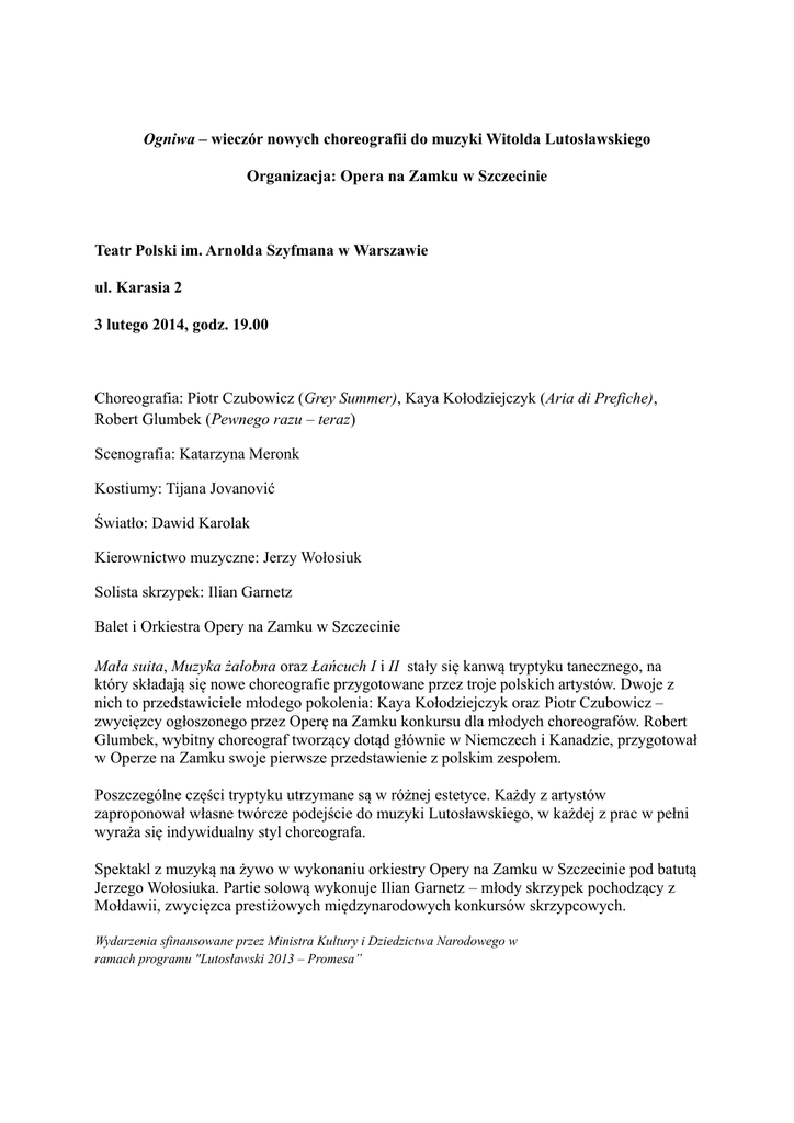Ogniwa – wieczór nowych choreografii do muzyki Witolda Lutosławskiego Organizacja: Opera na Zamku w Szczecinie Teatr Polski im. Arnolda Szyfmana w Warszawie ul. Karasia 2 3 lutego 2014, godz. 19.00 Choreografia: Piotr Czubowicz (Grey Summer), Kaya Kołodziejczyk (Aria di Prefiche), Robert Glumbek (Pewnego razu – teraz) Scenografia: Katarzyna Meronk Kostiumy: Tijana Jovanović Światło: Dawid Karolak Kierownictwo muzyczne: Jerzy Wołosiuk Solista skrzypek: Ilian Garnetz Balet i Orkiestra Opery na Zamku w Szczecinie Mała suita, Muzyka żałobna oraz Łańcuch I i II stały się kanwą tryptyku tanecznego, na który składają się nowe choreografie przygotowane przez troje polskich artystów. Dwoje z nich to przedstawiciele młodego pokolenia: Kaya Kołodziejczyk oraz Piotr Czubowicz – zwycięzcy ogłoszonego przez Operę na Zamku konkursu dla młodych choreografów. Robert Glumbek, wybitny choreograf tworzący dotąd głównie w Niemczech i Kanadzie, przygotował w Operze na Zamku swoje pierwsze przedstawienie z polskim zespołem. Poszczególne części tryptyku utrzymane są w różnej estetyce. Każdy z artystów zaproponował własne twórcze podejście do muzyki Lutosławskiego, w każdej z prac w pełni wyraża się indywidualny styl choreografa. Spektakl z muzyką na żywo w wykonaniu orkiestry Opery na Zamku w Szczecinie pod batutą Jerzego Wołosiuka. Partie solową wykonuje Ilian Garnetz – młody skrzypek pochodzący z Mołdawii, zwycięzca prestiżowych międzynarodowych konkursów skrzypcowych. Wydarzenia sfinansowane przez Ministra Kultury i Dziedzictwa Narodowego w ramach programu "Lutosławski 2013 – Promesa”