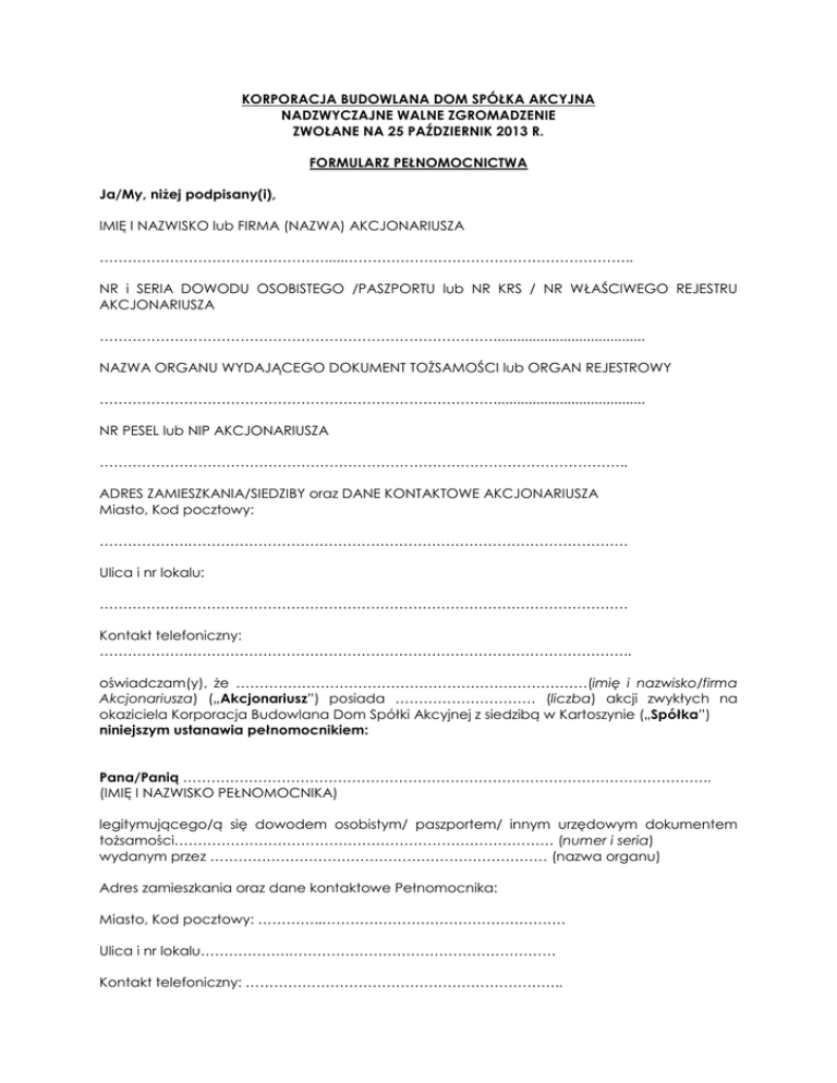 Formularz pełnomocnictwa - Korporacja Budowlana Dom