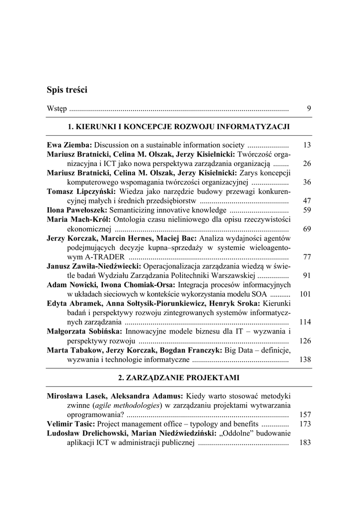 Spis treści Wstęp ............................................................................................................... 9 1. KIERUNKI I KONCEPCJE ROZWOJU INFORMATYZACJI Ewa Ziemba: Discussion on a sustainable information society ..................... Mariusz Bratnicki, Celina M. Olszak, Jerzy Kisielnicki: Twórczość organizacyjna i ICT jako nowa perspektywa zarządzania organizacją ........ Mariusz Bratnicki, Celina M. Olszak, Jerzy Kisielnicki: Zarys koncepcji komputerowego wspomagania twórczości organizacyjnej ................... Tomasz Lipczyński: Wiedza jako narzędzie budowy przewagi konkurencyjnej małych i średnich przedsiębiorstw ............................................. Ilona Pawełoszek: Semanticizing innovative knowledge .............................. Maria Mach-Król: Ontologia czasu nieliniowego dla opisu rzeczywistości ekonomicznej ........................................................................................ Jerzy Korczak, Marcin Hernes, Maciej Bac: Analiza wydajności agentów podejmujących decyzje kupna–sprzedaży w systemie wieloagentowym A-TRADER ................................................................................. Janusz Zawiła-Niedźwiecki: Operacjonalizacja zarządzania wiedzą w świetle badań Wydziału Zarządzania Politechniki Warszawskiej ................ Adam Nowicki, Iwona Chomiak-Orsa: Integracja procesów informacyjnych w układach sieciowych w kontekście wykorzystania modelu SOA ........... Edyta Abramek, Anna Sołtysik-Piorunkiewicz, Henryk Sroka: Kierunki badań i perspektywy rozwoju zintegrowanych systemów informatycznych zarządzania ................................................................................... Małgorzata Sobińska: Innowacyjne modele biznesu dla IT – wyzwania i perspektywy rozwoju ............................................................................ Marta Tabakow, Jerzy Korczak, Bogdan Franczyk: Big Data – definicje, wyzwania i technologie informatyczne ................................................. 13 26 36 47 59 69 77 91 101 114 126 138 2. ZARZĄDZANIE PROJEKTAMI Mirosława Lasek, Aleksandra Adamus: Kiedy warto stosować metodyki zwinne (agile methodologies) w zarządzaniu projektami wytwarzania oprogramowania? .................................................................................. Velimir Tasic: Project management office – typology and benefits .............. Ludosław Drelichowski, Marian Niedźwiedziński: „Oddolne” budowanie aplikacji ICT w administracji publicznej .............................................. 157 173 183 6 Spis treści Witold Chmielarz, Marek Zborowski: Wykorzystanie metody AHP/ANP w konfrontacyjnej metodzie projektowania wzorcowego systemów informatycznych ....................................................................................... Bartosz Wachnik: Reducing information asymmetry in IT projects ............. Michał Twardochleb: Dobór zespołów projektowych z wykorzystaniem metod stochastycznych .......................................................................... Sebastian Łacheciński: Analiza porównawcza wybranych narzędzi CASE do modelowania danych w procesie projektowania relacyjnych baz danych Magdalena Kieruzel: Metoda oceny ryzyka realizacji oprogramowania do wspomagania działalności przedsiębiorstwa na przykładzie oprogramowania typu open source .................................................................... 195 212 223 239 259 3. PROJEKTY INNOWACYJNYCH ROZWIĄZAŃ INFORMATYCZNYCH Agnieszka Szewczyk: Systemy Wspomagania Decyzji doboru typu dostępu do sieci komputerowej w firmie ............................................................ Jerzy Korczak, Helena Dudycz, Mirosław Dyczkowski: Inteligentny Kokpit Menedżerski jako innowacyjny system wspomagający zarządzanie w MŚP ................................................................................................... Mirosława Lasek, Dominik Kosieradzki: Products and services recommendation systems in e-commerce. Recommendation methods, algorithms, and measures of their effectiveness .......................................... Dorota Jelonek: Ocena internetowych kanałów komunikacji z klientem w procesie współtworzenia innowacji ...................................................... Łukasz Łysik, Robert Kutera, Piotr Machura: Rozwiązania komunikacji elektronicznej przedsiębiorstw dla społeczności internetowych – analiza i ocena ............................................................................................ Beata Butryn, Maciej Laska: Analiza porównawcza witryn e-sklepów w ujęciu branżowym – propozycja metody badań .................................... Jadwiga Sobieska-Karpińska, Marcin Hernes: Weryfikacja algorytmu consensusu w systemach zarządzania łańcuchem dostaw ..................... Bożena Śmiałkowska, Tomasz Dudek: Zastosowanie adaptacyjnej hurtowni danych do modelowania scenariuszy biznesowych organizacji ....... Andrzej Bytniewski, Marcin Hernes: Wykorzystanie kognitywnych programów agentowych we wspomaganiu procesu zarządzania produkcją ........ Leonard Rozenberg: Wykorzystanie podejścia rozmytego do konstrukcji wskaźników oceny stanu przedsiębiorstwa ........................................... 271 288 304 318 330 340 351 365 374 384 7 Spis treści Summaries 1. DIRECTIONS AND CONCEPTS OF IT DEVELOPMENT Ewa Ziemba: Przyczynek do dyskusji na temat zrównoważonego społeczeństwa informacyjnego ...................................................................... Mariusz Bratnicki, Celina M. Olszak, Jerzy Kisielnicki: Organizational creativity and ICT as a new perspective for management in organization Mariusz Bratnicki, Celina M. Olszak, Jerzy Kisielnicki: Framework of orgnizational creativity computer support ............................................. Tomasz Lipczyński: Knowledge as a tool of building the competitive advantage of SMEs ...............................