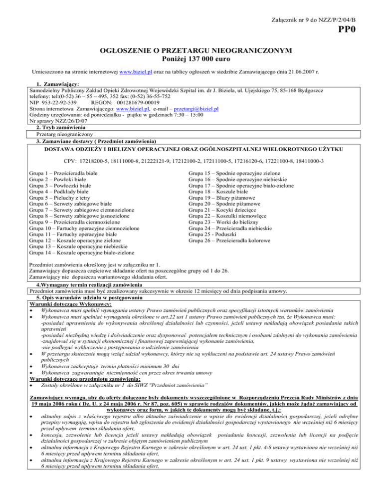 Załącznik nr 9 do NZZ/P/2/04/B PP0 OGŁOSZENIE O PRZETARGU NIEOGRANICZONYM PoniŜej 137 000 euro Umieszczono na stronie internetowej www.biziel.pl oraz na tablicy ogłoszeń w siedzibie Zamawiającego dnia 21.06.2007 r. 1. Zamawiający: Samodzielny Publiczny Zakład Opieki Zdrowotnej Wojewódzki Szpital im. dr J. Biziela, ul. Ujejskiego 75, 85-168 Bydgoszcz telefony: tel:(0-52) 36 – 55 – 495, 352 fax: (0-52) 36-55-752 NIP 953-22-92-539 REGON: 001281679-00019 Strona internetowa Zamawiającego: www.biziel.pl, e-mail – [email protected] Godziny urzędowania: od poniedziałku - piątku w godzinach 7:30 – 15:00 Nr sprawy NZZ/26/D/07 2. Tryb zamówienia Przetarg nieograniczony 3. Zamawiane dostawy ( Przedmiot zamówienia) DOSTAWA ODZIEśY I BIELIZNY OPERACYJNEJ ORAZ OGÓLNOSZPITALNEJ WIELOKROTNEGO UśYTKU CPV: 17218200-5, 18111000-8, 21222121-9, 17212100-2, 17211100-5, 17216120-6, 17221100-8, 18411000-3 Grupa 1 – Prześcieradła białe Grupa 2 – Powłoki białe Grupa 3 – Powłoczki białe Grupa 4 – Podkłady białe Grupa 5 – Pieluchy z tetry Grupa 6 – Serwety zabiegowe białe Grupa 7 – Serwety zabiegowe ciemnozielone Grupa 8 – Serwety zabiegowe jasnozielone Grupa 9 – Prześcieradła ciemnozielone Grupa 10 – Fartuchy operacyjne ciemnozielone Grupa 11 – Fartuchy operacyjne białe Grupa 12 – Koszule operacyjne zielone Grupa 13 – Koszule operacyjne niebieskie Grupa 14 – Koszule operacyjne biało-zielone Grupa 15 – Spodnie operacyjne zielone Grupa 16 – Spodnie operacyjne niebieskie Grupa 17 – Spodnie operacyjne biało-zielone Grupa 18 – Koszule białe Grupa 19 – Bluzy piŜamowe Grupa 20 – Spodnie piŜamowe Grupa 21 – Kocyki dziecięce Grupa 22 – Koszulki niemowlęce Grupa 23 – Worki do bielizny Grupa 24 – Prześcieradła niebieskie Grupa 25 - Poduszki Grupa 26 – Prześcieradła kolorowe Przedmiot zamówienia określony jest w załączniku nr 1. Zamawiający dopuszcza częściowe składanie ofert na poszczególne grupy od 1 do 26. Zamawiający nie dopuszcza wariantowego składania ofert. 4.Wymagany termin realizacji zamówienia Przedmiot zamówienia musi być zrealizowany sukcesywnie w okresie 12 miesięcy od dnia podpisania umowy. 5. Opis warunków udziału w postępowaniu Warunki dotyczące Wykonawcy: • Wykonawca musi spełnić wymagania ustawy Prawo zamówień publicznych oraz specyfikacji istotnych warunków zamówienia • Wykonawca musi spełniać wymagania określone w art.22 ust 1 ustawy Prawo zamówień publicznych tzn, Ŝe Wykonawca musi: -posiadać uprawnienia do wykonywania określonej działalności lub czynności, jeŜeli ustawy nakładają obowiązek posiadania takich uprawnień -posiadać niezbędną wiedzę i doświadczenie oraz dysponować potencjałem technicznym i osobami zdolnymi do wykonania zamówienia -znajdować się w sytuacji ekonomicznej i finansowej zapewniającej wykonanie zamówienia, -nie podlegać wykluczeniu z postępowania o udzielenie zamówienia • W przetargu skutecznie mogą wziąć udział wykonawcy, którzy nie są wykluczeni na podstawie art. 24 ustawy Prawo zamówień publicznych • Wykonawca zaakceptuje termin płatności minimum 30 dni • Wykonawca zagwarantuje niezmienność cen przez okres trwania umowy Warunki dotyczące przedmiotu zamówienia: • Zostały określone w załączniku nr 1 do SIWZ "Przedmiot zamówienia” Zamawiający wymaga, aby do oferty dołączone były dokumenty wyszczególnione w Rozporządzeniu Prezesa Rady Ministrów z dnia 19 maja 2006 roku ( Dz. U. z 24 maja 2006 r. Nr 87, poz. 605) w sprawie rodzajów dokumentów, jakich moŜe Ŝądać zamawiający od wykonawcy oraz form, w jakich te dokumenty mogą być składane, t.j.: • aktualny odpis z właściwego rejestru albo aktualne zaświadczenie o wpisie do ewidencji działalności gospodarczej, jeŜeli odrębne przepisy wymagają, wpisu do rejestru lub zgłoszenia do ewidencji działalności gospodarczej wystawionego nie wcześniej niŜ 6 miesięcy przed upływem terminu składania ofert, • koncesja, zezwolenie lub licencja jeŜeli ustawy nakładają obowiązek posiadania koncesji, zezwolenia lub licencji na podjęcie działalności gospodarczej w zakresie objętym zamówieniem publicznym • aktualna informacja z Krajowego Rejestru Karnego w zakresie określonym w art. 24 ust. 1 pkt. 4-8 ustawy wystawiona nie wcześniej niŜ 6 miesięcy przed upływem terminu składania ofert, • aktualna informacja z Krajowego Rejestru Karnego w zakresie określonym w art. 24 ust. 1 pkt. 9 ustawy wystawiona nie wcześniej niŜ 6 miesięcy przed upływem terminu składania ofert, aktualne zaświadczenie właściwego naczelnika urzędu skarbowego oraz właściwego oddziału ZUS lub KRUS potwierdzające odpowiednio Ŝe wykonawca nie zalega z opłacaniem podatków, opłat i składek na ubezpieczenie zdrowotne i społeczne lub zaświadczeń, Ŝe uzyskał przewidziane prawem zwolnienie, odroczenie lub rozłoŜenie na raty zaległych płatności lub wstrzymania w całości wykonania decyzji właściwego organu- wystawione nie wcześniej niŜ w terminie 3 miesięcy przed upływem terminu składania ofert. • JeŜeli wykonawca ma siedzibę lub miejsce zamieszkania poza terytorium Rzeczypospolitej Polskiej składa dokument lub dokumenty, wystawione w kraju, w którym ma siedzibę lub miejsce zamieszkania, potwierdzające odpowiednio, Ŝe: 1) nie otwarto jego likwidacji ani nie ogłoszono upadłości ( dokument powinien być wystawiony nie wcześniej niŜ 6 miesięcy przed upływem terminu składania ofert), 2) nie orzeczono wobec niego zakazu ubiegania się o zamówienie (dokument powinien być wystawiony nie wcześniej niŜ 6 miesięcy przed upływem terminu składania ofert), 3) nie zalega z uiszczaniem podatków, opłat lub składek na ubezpieczenie społeczne lub zdrowotne albo Ŝe uzyskał przewidziane prawem zwolnienia odroczenia lub rozłoŜenie na raty zaległych płatności lub wstrzymanie w całości wykonania decyzji właśc