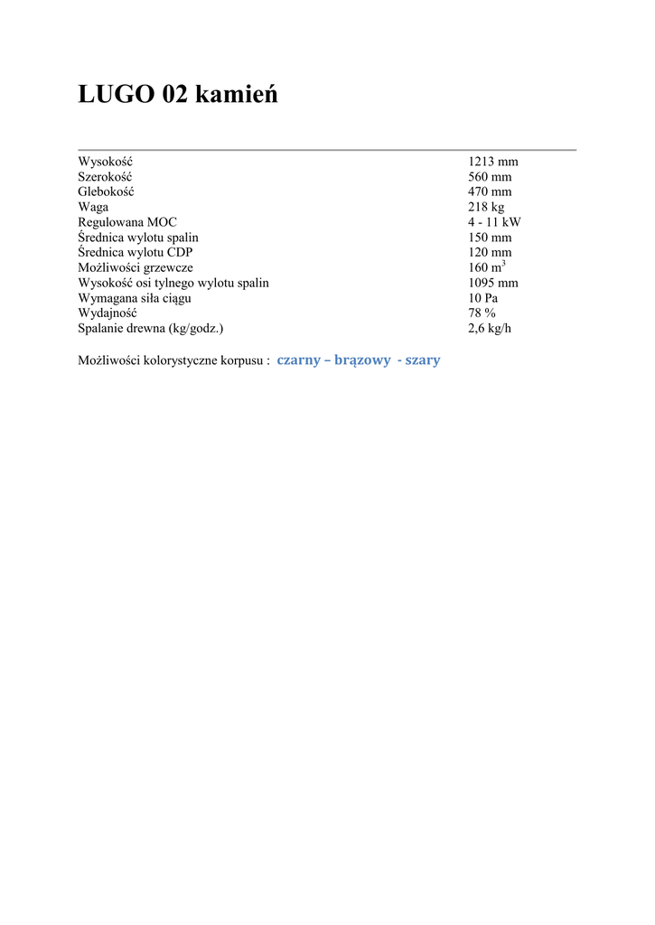 LUGO 02 kamień Wysokość Szerokość Glebokość Waga Regulowana MOC Średnica wylotu spalin Średnica wylotu CDP Możliwości grzewcze Wysokość osi tylnego wylotu spalin Wymagana siła ciągu Wydajność Spalanie drewna (kg/godz.) Możliwości kolorystyczne korpusu : czarny – brązowy - szary 1213 mm 560 mm 470 mm 218 kg 4 - 11 kW 150 mm 120 mm 160 m3 1095 mm 10 Pa 78 % 2,6 kg/h