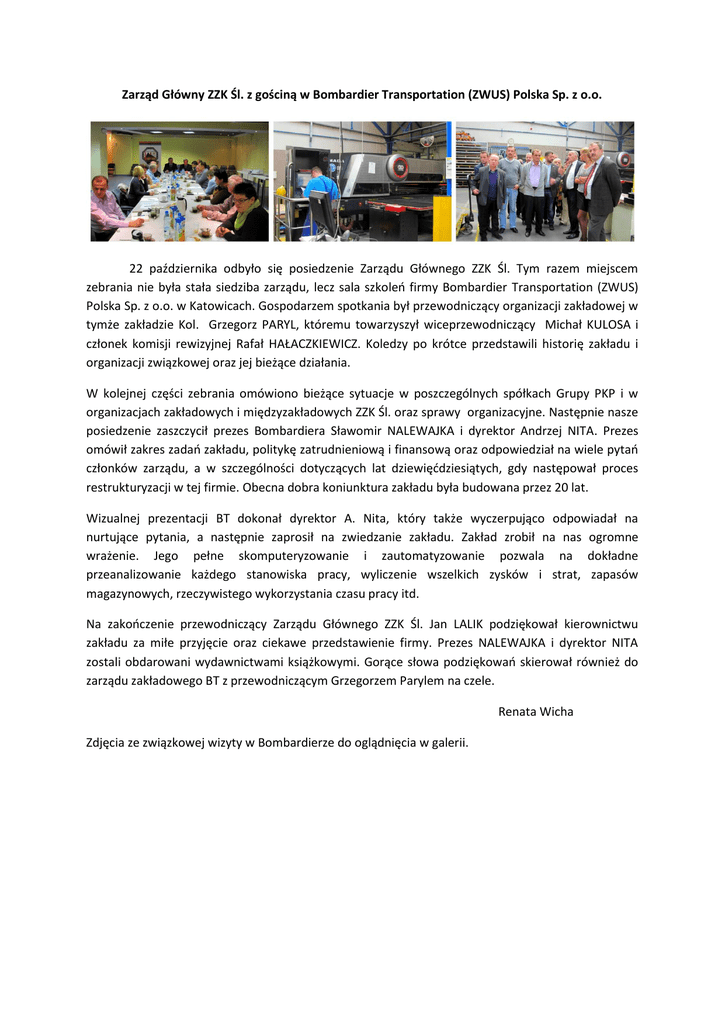 Zarząd Główny ZZK Śl. z gościną w Bombardier Transportation (ZWUS) Polska Sp. z o.o. 22 października odbyło się posiedzenie Zarządu Głównego ZZK Śl. Tym razem miejscem zebrania nie była stała siedziba zarządu, lecz sala szkoleń firmy Bombardier Transportation (ZWUS) Polska Sp. z o.o. w Katowicach. Gospodarzem spotkania był przewodniczący organizacji zakładowej w tymże zakładzie Kol. Grzegorz PARYL, któremu towarzyszył wiceprzewodniczący Michał KULOSA i członek komisji rewizyjnej Rafał HAŁACZKIEWICZ. Koledzy po krótce przedstawili historię zakładu i organizacji związkowej oraz jej bieżące działania. W kolejnej części zebrania omówiono bieżące sytuacje w poszczególnych spółkach Grupy PKP i w organizacjach zakładowych i międzyzakładowych ZZK Śl. oraz sprawy organizacyjne. Następnie nasze posiedzenie zaszczycił prezes Bombardiera Sławomir NALEWAJKA i dyrektor Andrzej NITA. Prezes omówił zakres zadań zakładu, politykę zatrudnieniową i finansową oraz odpowiedział na wiele pytań członków zarządu, a w szczególności dotyczących lat dziewięćdziesiątych, gdy następował proces restrukturyzacji w tej firmie. Obecna dobra koniunktura zakładu była budowana przez 20 lat. Wizualnej prezentacji BT dokonał dyrektor A. Nita, który także wyczerpująco odpowiadał na nurtujące pytania, a następnie zaprosił na zwiedzanie zakładu. Zakład zrobił na nas ogromne wrażenie. Jego pełne skomputeryzowanie i zautomatyzowanie pozwala na dokładne przeanalizowanie każdego stanowiska pracy, wyliczenie wszelkich zysków i strat, zapasów magazynowych, rzeczywistego wykorzystania czasu pracy itd. Na zakończenie przewodniczący Zarządu Głównego ZZK Śl. Jan LALIK podziękował kierownictwu zakładu za miłe przyjęcie oraz ciekawe przedstawienie firmy. Prezes NALEWAJKA i dyrektor NITA zostali obdarowani wydawnictwami książkowymi. Gorące słowa podziękowań skierował również do zarządu zakładowego BT z przewodniczącym Grzegorzem Parylem na czele. Renata Wicha Zdjęcia ze związkowej wizyty w Bombardierze do oglądnięcia w galerii.