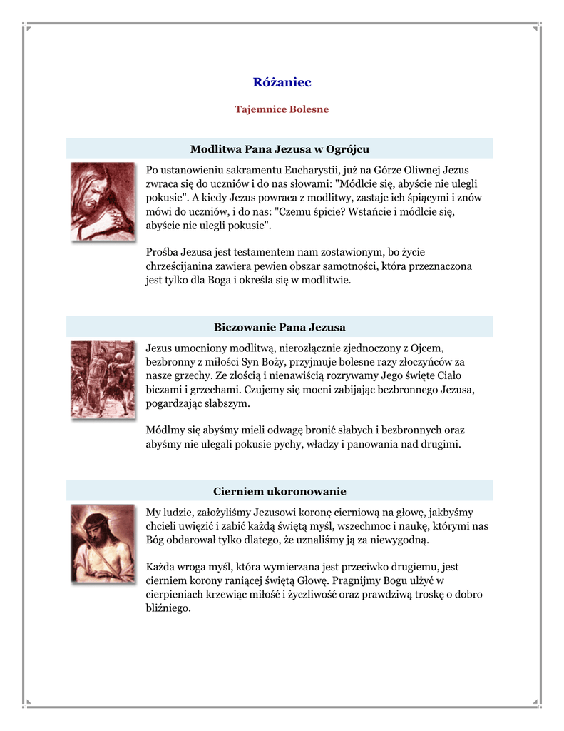 Różaniec Tajemnice Bolesne Modlitwa Pana Jezusa w Ogrójcu Po ustanowieniu sakramentu Eucharystii, już na Górze Oliwnej Jezus zwraca się do uczniów i do nas słowami: "Módlcie się, abyście nie ulegli pokusie". A kiedy Jezus powraca z modlitwy, zastaje ich śpiącymi i znów mówi do uczniów, i do nas: "Czemu śpicie? Wstańcie i módlcie się, abyście nie ulegli pokusie". Prośba Jezusa jest testamentem nam zostawionym, bo życie chrześcijanina zawiera pewien obszar samotności, która przeznaczona jest tylko dla Boga i określa się w modlitwie. Biczowanie Pana Jezusa Jezus umocniony modlitwą, nierozłącznie zjednoczony z Ojcem, bezbronny z miłości Syn Boży, przyjmuje bolesne razy złoczyńców za nasze grzechy. Ze złością i nienawiścią rozrywamy Jego święte Ciało biczami i grzechami. Czujemy się mocni zabijając bezbronnego Jezusa, pogardzając słabszym. Módlmy się abyśmy mieli odwagę bronić słabych i bezbronnych oraz abyśmy nie ulegali pokusie pychy, władzy i panowania nad drugimi. Cierniem ukoronowanie My ludzie, założyliśmy Jezusowi koronę cierniową na głowę, jakbyśmy chcieli uwięzić i zabić każdą świętą myśl, wszechmoc i naukę, którymi nas Bóg obdarował tylko dlatego, że uznaliśmy ją za niewygodną. Każda wroga myśl, która wymierzana jest przeciwko drugiemu, jest cierniem korony raniącej świętą Głowę. Pragnijmy Bogu ulżyć w cierpieniach krzewiąc miłość i życzliwość oraz prawdziwą troskę o dobro bliźniego. Dźwiganie krzyża To ostatnia droga, którą Jezus pokonuje obarczony naszym krzyżem. Każdy z nas dojdzie również do kresu swojej wędrówki. Jakie będą te ostatnie godziny, w których skoncentruje się całe nasze życie? Prośmy Boga o siłę i chęć do dźwigania krzyża, abyśmy w godzinie śmierci mogli odczuwać podobieństwo do Jezusa. Śmierć Pana Jezusa na krzyżu Z naszego powodu Bóg-Człowiek ponosi haniebną śmierć na krzyżu. Umierający Jezus woła z krzyża "Pragnę" pragnąc jedynie miłości w naszych sercach i naszego zbawienia. Przepraszajmy Boga za brak miłości, a w duchu zadośćuczynienia Bogu, zechciejmy wynagrodzić bliźnim, zadane im wcześniej cierpienia.