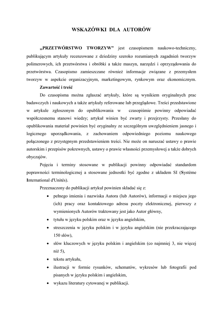 WSKAZÓWKI DLA AUTORÓW „PRZETWÓRSTWO TWORZYW” jest czasopismem naukowo-techniczny, publikującym artykuły recenzowane z dziedziny szeroko rozumianych zagadnień tworzyw polimerowych, ich przetwórstwa i obróbki a także maszyn, narzędzi i oprzyządowania do przetwórstwa. Czasopismo zamieszczane również informacje związane z przemysłem tworzyw w aspekcie organizacyjnym, marketingowym, rynkowym oraz ekonomicznym. Zawartość i treść Do czasopisma można zgłaszać artykuły, które są wynikiem oryginalnych prac badawczych i naukowych a także artykuły referowane lub przeglądowe. Treści przedstawione w artykule zgłoszonym do opublikowania w czasopiśmie powinny odpowiadać współczesnemu stanowi wiedzy; artykuł winien być zwarty i przejrzysty. Przesłany do opublikowania materiał powinien być oryginalny ze szczególnym uwzględnieniem jasnego i logicznego uporządkowania, z zachowaniem odpowiedniego poziomu naukowego połączonego z przystępnym przedstawieniem treści. Nie może on naruszać ustawy o prawie autorskim i przepisów pokrewnych, ustawy o prawie własności przemysłowej a także dobrych obyczajów. Pojęcia i terminy stosowane w publikacji powinny odpowiadać standardom poprawności terminologicznej a stosowane jednostki być zgodne z układem SI (Système International d'Unités). Przeznaczony do publikacji artykuł powinien składać się z: pełnego imienia i nazwiska Autora (lub Autorów), informacji o miejscu jego (ich) pracy oraz kontaktowego adresu poczty elektronicznej, pierwszy z wymienionych Autorów traktowany jest jako Autor główny, tytułu w języku polskim oraz w języku angielskim, streszczenia w języku polskim i w języku angielskim (nie przekraczającego 150 słów), słów kluczowych w języku polskim i angielskim (co najmniej 3, nie więcej niż 5), tekstu artykułu, ilustracji w formie rysunków, schematów, wykresów lub fotografii pod pisanych w języku polskim i angielskim, wykazu literatury cytowanej w publikacji. Wymagania formalne Autor/Autorzy dostarcza/dostarczają artykuł do Redakcji w formie elektronicznej, przez pocztę elektroniczną lub poprzez pocztę tradycyjną na płycie CD/DVD. W obu przypadkach należy przesłać również imię i nazwisko Autora oraz jego adres kontaktowy. W przypadku większej liczby autorów należy podać imię i nazwisko oraz adres kontaktowy Autora głównego. Tekst artykułu powinien być wykonany w formacie "doc" lub "docx" i napisany czcionką Times New Roman o rozmiarze 12 na formacie A4 z interlinią 1,5. Tekst należy wyjustować czyli wyrównać z lewej i prawej strony przyjmując marginesy: prawy 1 cm, lewy 3 cm. Objętość pojedynczego artykułu nie powinna przekraczać 10 stron. Jeżeli artykuł jest dłuższy niż 10 stron dopuszcza się jego podział na części drukowane w kolejnych zeszytach Przetwórstwa Tworzyw. Zaleca się podział artykułu na części opatrzone podtytułami. Poszczególne akapity należy rozpocząć wcięciem na 1,25 cm. W tekście nie należy stosować podkreśleń, wyrazów o zwiększonej odległości między literami (tzw. "rozstrzelony druk") ani innej czcionki. Zastosowany w tekście skrót lub skrótowiec, jeżeli nie jest oczywisty, powinien być rozwinięty w nawiasie. Wzory, równania, ilustracje i tabele umieszcza się w tekście zgodnie z następującymi zasadami: Wzory matematyczne można zamieszczać z użyciem edytora równań kompatybilnym z formatem dokumentu (nie dopuszcza się wstawiania równań matematycznych w postaci tzw. "obrazków"), pod wzorem matematycznym należy każdorazowo podać wyjaśnienie zastosowanych symboli. Wzory i równania chemiczne zaleca się wykonywać z użyciem odpowiedniego edytora kompatybilnego z formatem dokumentu. Zarówno wzory matematyczne, jak i chemiczne powinny być oznaczane kolejną liczbą arabską w nawiasie okrągłym z prawej strony wzoru. Dopuszcza się stosowanie alfabetu greckiego we wzorach matematycznych i chemicznych. Rysunki, schematy, wykresy oraz fotografie należy podpisywać jako "Rys." oraz oznaczać kolejną liczbą arabską. Powinny one być w takich rozmiarach aby były czytelne, nie mniejsze niż 300 x 420 pikseli w formacie "jpg", "bmp" lub "png", mogą być monochromatyczne lub kolorowe w standardzie RGB. Powinny być w tekście oznaczone w nawiasach kolejnymi liczbami arabskimi, dodatkowo wyprowadzonymi na lewy margines. Wymagane jest dołączenie tych rysunków w postaci osobnych plików do przesłanego w elektronicznej formie artykułu. W przypadku wykresów dopuszcza się je w formacie kompatybilnym z formatem dokumentu, jak i w formacie odpowiadającym rysunkom ( "jpg", "bmp", "png") W drugim przypadku należy podać nazwę programu, z użyciem którego zostały przygotowane. Tabele należy podpisywać nad nimi jako "Tab." wraz z kolejną porządkową liczbą arabską. Na osobnych stronach należy dołączyć do artykułu spis rysunków i spis tabel z podaniem numerów porządkowych, tytułów rysunków i tabel oraz informacji o ich źródle, jeżeli zostały zaczerpnięte z innych źródeł. Artykuł zgłoszony do druku powinien być zakończony ponumerowanym wykazem literatury wykorzystanej i cytowanej w artykule w kolejności występowania w tekście. Numery przytaczanych tekstów należy umieścić w nawiasach kwadratowych np. [2, 4, 8] lub [3÷9]. Przy cytowaniach z książek podać należy kolejno: nazwisko autora (nazwiska autorów), inicjał imienia (inicjały imion), a w przypadku pracy zbiorowej należy podać nazwisko redaktora, inicjał imienia, informację "Praca zbiorowa pod red. ... ", pełny tytuł dzieła w oryginale (czcionką pochyloną), nazwę wydawnictwa, miejsce i rok wydania, numer strony (numery stron), na których znajduje się cytowana informacja. W przypadkach cytowania z czasopism należy podać kolejno: nazwisko autora głównego, inicjał imienia autora głównego, współautorów lub dopisek "i inni" w przypadku większej liczby autoró