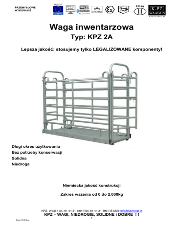 PRZEMYSŁOWE WYKONANIE Waga inwentarzowa Typ: KPZ 2A Lepsza jakość: stosujemy tylko LEGALIZOWANE komponenty! Długi okres użytkowania Bez potrzeby konserwacji Solidna Niedroga Niemiecka jakość konstrukcji Zakres ważenia od 0 do 2.000kg KPZ- Wagi tel.: 61 44 21 189 fax: 61 44 21 190 E-Mail: [email protected] KPZ – WAGI, NIEDROGIE, SOLIDNE i DOBRE ! ! -1Stand 121212 pg PRZEMYSŁOWE WYKONANIE Waga platformowa inwentarzowa KPZ 2A, bardzo solidna i stabilna konstrukcja,ocynkowana blacha ryflowana,stalowe ocynkowane płotki ochronne. Czujniki tensometryczne: wysokiej jakości tensometry DMS ze stali szlachetnej. Stopy ruchome z regulacją wysokości, wykonanie ze stali szlachetnej. Panel sterujący: typ KPZ 51E-9-1 (możliwość dostarczenia wagi bez panelu sterującego). Zaświadczenie: deklaracja zgodności CE. Konstrukcja: spawana rama z profila z poprzecznym wzmocnieniem i solidną płytą z blachy ryflowanej o wymiarach 920x2200 mm,ocynkowana (możliwość dostarczenia również w wersji malowanej proszkowo lub nierdzewnej). Kabel do panelu sterującego: długość 5m, osłonięty po stronie wagi na wypadek uszkodzeń mechanicznych. Specjalnie płaski rodzaj konstrukcji nadaje się do ustawienia nadziemnego. Ze względu na solidne tensometry nie ma części zużywalnych.Stalowe płotki ochronne o wymiarach ca.920x1785 mm, mocowane są w sposób umożliwiający otwarcie klatki zależnie od potrzeb. Panel sterujący KPZ 51E-9-1 Obudowa ze stali szlachetnej IP 67, 6 pozycyjny wyświetlacz LCD wysokość 25 mm, z podświetleniem tła, duże przyciski obsługi, kontrola wartości zadanej / granicznej zliczanie sztuk Dopuszczenie do legalizacji EU do 10.000 e Panel sterujący KPZ 51E-9-1: solidna obudowa ze stali szlachetnej IP 67, przyjazna dla obsługującego, duże przyciski obsługi. Wyświetlacz LCD: 6 cyfr, różne symbole, podświetlane tło. Panel sterujący: z 5 metrowym kablem podłączeniowym. Optymalne warunki pracy w temperaturach od –10°C do +40°C. Funkcje: automatyczna i ręczna korekta zera, przełączanie brutto-/netto, 100% tarowanie, wielokrotna tara, przełączanie jednostek wagi, zliczanie sztuk poprzez zastosowanie odniesienia do ilości sztuk (pomiędzy 10, 20, 50, 100, 200). Minusowy wskaźnik wartości ciężaru, podświetlenie wyświetlacza, automatyczne rozłączanie po (do wyboru) 0/9 minutach, kontrola wartości zadanej/wartości granicznej LOW-OK.-HIGH, (tzn. dwie dowolnie wybrane wartości ciężaru, sygnał tonowy/świetlny na wyświetlaczu), elektroniczny filtr stabilizacyjny, automatyczna funkcja samokontroli, zgłaszanie błędu na wyświetlaczu. Wyświetlacz: ustawianie zera, ciężar brutto, netto, stabilność, wskaźnik naładowania baterii, ostrzeżenie ładowania baterii, wartość zadana/graniczna, zbyt mała ilość sztuk lub zbyt mały ciężar. Dioda LED: stan naładowania akumulatora. Zasilanie sieciowe: 230 Volt zewnętrzne, możliwość zasilania akumulatorowego (opcja) Typ Nośność KPZ 2 A 1500 kg Legalizacja wagi o nośności 1500 kg Działka Wymiary w mm 1000 g 920x2200 Inne wymiary platformy i nośności na zapytanie. KPZ- Wagi tel.: 61 44 21 189 fax: 61 44 21 190 E-Mail: [email protected] KPZ – WAGI, NIEDROGIE, SOLIDNE i DOBRE ! ! -2Stand 121212 pg Nr art. 2A0000001500 300116000000 PRZEMYSŁOWE WYKONANIE Oferujemy również wiele rodzajów niestandardowych konstrukcji, zależnie od potrzeb klienta. KPZ- Wagi tel.: 61 44 21 189 fax: 61 44 21 190 E-Mail: [email protected] KPZ – WAGI, NIEDROGIE, SOLIDNE i DOBRE ! ! -3Stand 121212 pg PRZEMYSŁOWE WYKONANIE KPZ 2-11-3 KPZ 2-03-10IP 65 KPZ 2-03-3 KPZ 2-04-3 KPZ 2E-06S KPZ 2E-06N IP69K KPZ 2-08-2 System wag zliczających KPZ 1 KPZ 2D System wagowy do owijarek palet KPZ 73SDJ KPZ 72 KPZ 76 KPZ 1B KPZ 2B KPZ 2 KPZ 71- 7 Opcje KPZ 71-7 KPZ 73 Wagi hakowe Możliwość wielu opcji KPZ 73B KPZ 74 Wagi samochodowe Klaus-Peter Zander Sp. z o.o. Paproć 132 a 64-300 Nowy Tomyśl Web: www.kpzwagi.pl KPZ- Wagi tel.: 61 44 21 189 fax: 61 44 21 190 E-Mail: [email protected] KPZ – WAGI, NIEDROGIE, SOLIDNE i DOBRE ! ! -4Stand 121212 pg