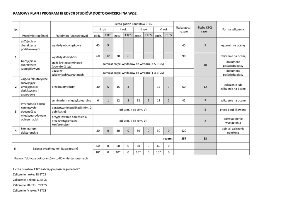 RAMOWY PLAN I PROGRAM III EDYCJI STUDIÓW DOKTORANCKICH NA WZiE liczba godzin i punktów ETCS Lp. I rok Przedmiot (ogólnie) a) Zajęcia o charakterze podstawowym 1 b) Zajęcia o charakterze szczegółowym 2 Zajęcia fakultatywne rozwijające umiejętności dydaktyczne i zawodowe 3 Prezentacja badań naukowych i obecność w międzynarodowym obiegu nauki 4 5 Przedmiot (szczegółowo) 45 9 wykłady do wyboru 60 12 staże krótkoterminowe (powyżej 2 tyg.) udział w szkoleniach/warsztatach VI rok ETCS godz. liczba godz. razem liczba ETCS razem Forma zaliczenia 45 9 egzamin na ocenę ETCS 6 90 zamiast części wykładów do wyboru (3-5 ETCS) zaliczenie na ocenę 18 15 3 seminarium międzykatedralne 6 1 12 2 12 2 dokument poświadczający dokument poświadczający zamiast części wykładów do wyboru (1-3 ETCS) 6 15 3 60 12 zaliczenie lub zaliczenie na ocenę 12 2 42 7 zaliczenie na ocenę opracowanie publikacji (nim. 2 publikacje) od sem. II do sem. VII 5 praca opublikowana przygotowanie doniesienia oraz wystąpienia na konferencjach od sem. II do sem. VII 2 poświadczenie wystąpienia Liczba punktów ETCS zaliczająca poszczególne lata* Zaliczenie IV roku: 7 ETCS ETCS godz. 30 Uwaga: *dotyczy doktorantów studiów niestacjonarnych Zaliczenie IIII roku: 7 ETCS 30 III rok przedmioty z listy Zajęcia dydaktyczne (liczba godzin) Zaliczenie II roku: 11 ETCS ETCS godz. wykłady obowiązkowe Seminarium doktoranckie Zaliczenie I roku: 28 ETCS godz. II rok 30 0 30 0 30 0 30 0 120 razem: 357 60 0 60 0 60 0 60 0 10* 0 10* 0 10* 0 10* 0 opinia i zaliczenie opiekuna 53 Moduł 1a) - Wykłady obowiązkowe (15h każdy) LP PRZEDMIOT 1 2 3 Ekonomia III Zarządzanie III Metodologia nauk ekonomicznych liczba ETCS 3 3 3 Moduł 1b) - Wykłady do wyboru (15h każdy) LP PRZEDMIOT PROWADZĄCY liczba ETCS 1 An economic history of globalization Prof. L. Segreto 4 2 Theoretical basis and current problems in international finance Prof. P. Moore 4 3 Integrated model of innovation prof. S. Soumodip 4 4 Metody ilościowe w naukach ekonomicznych Prof. dr hab. S. Kot, prof. zw. PG 3 5 Wybrane problemy mikroekonomii Dr hab. J. Ossowski, prof. nadzw. PG 3 6 Wybrane problemy makroekonomii Prof. dr hab. P. Dominiak, prof. zw. PG 3 7 Zarządzanie projektami Dr hab. inż. M. Wirkus, prof. nadzw. PG 3 8 Badania jakościowe przedsiębiorstw Dr hab. J. Wasilczuk, prof. nadzw. PG 3 9 Teoria gier Dr E. Babula 3 10 Zarządzanie wiedzą Prof. dr hab. E. Szczerbicki, prof. zw. PG 3 11 Projektowanie systemów zarządzania Dr hab. inż. P. Grudowski, prof. nadzw. PG 3 Uwaga: Przewiduje się wykłady innych profesorów z zagranicy – tytuły i terminy wykładów będą podawane na stronie WZiE w odpowiednim czasie. Moduł 2 - Zajęcia fakultatywne rozwijające umiejętności dydaktyczne i zawodowe (5h każdy) Nazwa obszaru i zajęć Wymiar godz. punkty ECTS Typ zajęć: w/ćw/se m/ Obszar I. Zajęcia rozwijające umiejętności dydaktyczne. 1. Podstawy metodyczne prowadzenia zajęć dydaktycznych. 15 3 w 2. Nowoczesne metody i techniki prowadzenia zajęć dydaktycznych. 15 3 w/ćw 3. Techniki prowadzenia zajęć na odległość (np. platforma Moodle) 15 3 ćw Obszar II. Zajęcia z przedmiotów dodatkowych z których zdaje się egzamin doktorski z dyscypliny dodatkowej. 1. Wybrane zagadnienia filozofii 15 3 w 2. Wybrane zagadnienia ekonomii 15 3 w 3. Wybrane zagadnienia psychologii 15 3 w 4. Wybrane zagadnienia socjologii 15 3 w 5. Historia techniki 15 3 w Inne przedmioty mogą być wprowadzone według potrzeb jak znajdzie się odpowiednia liczba doktorantów (12-15 osób) Obszar III. Zajęcia rozwijające umiejętności zawodowe. 1. Patentowe bazy danych 5 2 ćw 2. Literaturowe bazy danych 5 2 ćw 3. Ochrona własności intelektualnej 5 2 w 4. Podstawy komercjalizacja wyników badań naukowych 5 2 sem 5. Etyka w badaniach naukowych 5 2 w 6. Pisanie wniosków projektowych 5 2 w 7. Ergonomia i wzornictwo przemysłowe 5 2 w 8. Techniki prezentacji wyników naukowych* 10 3 sem 9. Metodologia prowadzenia badań naukowych (metodologia nauk, 5 2 w logika) 10. Przygotowanie zgłoszenia patentowego (wzoru użytkowego) 5 2 sem * Nie obejmuje to pisania publikacji naukowych, które ze względu na specyfikę każdej dziedziny powinny być jako zajęcia fakultatywne prowadzone na każdym wydziale osobno.
