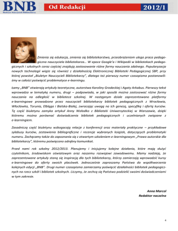 Zmienia się edukacja, zmienia się bibliotekarstwo, przeobrażeniom ulega praca pedagogiczna nauczyciela bibliotekarza… W epoce Google’a i Wikipedii w bibliotekach pedagogicznych i szkolnych coraz częściej znajdują zastosowanie różne formy nauczania zdalnego. Popularyzacja nowych technologii wiąże się również z działalnością Elektronicznej Biblioteki Pedagogicznej SBP, przy której powstał „Biuletyn Nauczycieli Bibliotekarzy”, dlatego też pierwszy numer czasopisma postanowiliśmy w całości poświęcić problematyce e-learningu. Łamy „BNB” otwierają artykuły teoretyczne, autorstwa Karoliny Grodeckiej i Agaty Arkabus. Pierwszy tekst wprowadza w tematykę numeru, drugi – podpowiada, w jaki sposób można zastosować różne formy nauczania na odległość w bibliotece szkolnej. W następnym dziale zaprezentowano platformy e-learningowe prowadzone przez nauczycieli bibliotekarzy bibliotek pedagogicznych z Wrocławia, Włocławka, Torunia, Elbląga i Bielska-Białej, zwracając uwagę na ich genezę, specyfikę i ofertę kursów. Tę część biuletynu zamyka artykuł Anny Wołodko z Biblioteki Uniwersyteckiej w Warszawie, dzięki któremu można porównać doświadczenia bibliotek pedagogicznych i uczelnianych związane z e-learningiem. Zasadniczą część biuletynu wzbogacają relacje z konferencji oraz materiały praktyczne – przykładowe sylabusy kursów, zestawienia bibliograficzne i recenzje wybranych książek, dotyczących problematyki numeru. Zachęcamy także do zapoznania się z otwartym szkoleniem e-learningowym „Prawo autorskie dla bibliotekarzy”, któremu poświęcono odrębny komunikat. Przed nami rok szkolny 2012/2013. Planujemy i inicjujemy kolejne działania, które mają służyć czytelnikom, środowiskom oświatowym oraz naszemu rozwojowi zawodowemu. Mamy nadzieję, że zaprezentowane artykuły staną się inspiracją dla tych bibliotekarzy, którzy zamierzają wprowadzić kursy e-learningowe do oferty swoich placówek. Jednocześnie zapraszamy Państwa do współtworzenia kolejnych edycji „BNB”. Drugi numer czasopisma zamierzamy poświęcić działalności bibliotek pedagogicznych na rzecz szkół i bibliotek szkolnych. Liczymy, że zechcą się Państwo podzielić swoimi doświadczeniami w tym zakresie. Anna Marcol Redaktor naczelna 4