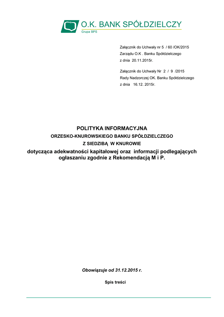 Załącznik do Uchwały nr 5 / 60 /OK/2015 Zarządu O.K . Banku Spółdzielczego z dnia 20.11.2015r. Załącznik do Uchwały Nr 2 / 9 /2015 Rady Nadzorczej OK. Banku Spółdzielczego z dnia 16.12. 2015r. POLITYKA INFORMACYJNA ORZESKO-KNUROWSKIEGO BANKU SPÓŁDZIELCZEGO Z SIEDZIBĄ W KNUROWIE dotycząca adekwatności kapitałowej oraz informacji podlegających ogłaszaniu zgodnie z Rekomendacją M i P. Obowiązuje od 31.12.2015 r. Spis treści 1. Postanowienia ogólne ..................................................................................................... 2 2. Zakres ogłaszanych informacji....................................................................................... 3 4. Formy i miejsce ogłaszania informacji .......................................................................... 6 5. Zasady zatwierdzania i weryfikacji ogłaszanych informacji ......................................... 6 6. Zasady weryfikacji Polityki ............................................................................................. 6 7. Przepisy końcowe i przejściowe ................................................................................. …7 Załącznik nr 1- Zasady ogłaszania informacji 2 1. Postanowienia ogólne § 1. Niniejsza „Polityka informacyjna Orzesko-Knurowskiego Banku Spółdzielczego z siedzibą w Knurowie dotycząca adekwatności kapitałowej oraz informacji podlegających ogłoszeniu zgodnie z Rekomendacją M i P”, zwana dalej „Polityką” stanowi regulację przyjętą w celu: 1) Spełnienia wymogów dotyczących „ oficjalnej strategii” przyjętej w celu ujawniania informacji zgodnie z art.432 ust.3 Rozporządzenia Parlamentu Europejskiego i Rady (UE) nr 575/2013 z dnia 26 czerwca 2013 r. w sprawie wymogów ostrożnościowych dla instytucji kredytowych i firm inwestycyjnych oraz z Rozporządzeniem wykonawczym Komisji nr 1423/2013 z dnia 20.12.2013r. ustanawiające wykonawcze standardy techniczne w zakresie wymogów dotyczących ujawnienia informacji na temat funduszy własnych instytucji zgodnie z Rozporządzeniem Parlamentu Europejskiego i Rady (UE) nr 575/2013 z dnia 26 czerwca 2013. 2) Spełnienia wymogów zawartych w Rekomendacji 18 Rekomendacji P dotyczącej systemu monitorowania płynności finansowej banków w zakresie ujawnień publicznych oraz z Rekomendacjom M- dotycząca zarządzania ryzykiem operacyjnym w bankach. 2. Polityka reguluje: 1) zakres informacji ogłaszanych zgodnie z wymogami prawa ; 2) częstotliwość ogłaszania; 3) formy i miejsce ogłaszania; 4) zasady zatwierdzania i weryfikacji ogłaszanych informacji; 5) zakres weryfikacji Polityki; 6) okresy przejściowe. 3. Polityka zatwierdzana jest przez Radę Nadzorczą Banku. 4. Polityka wprowadza zestaw wymagań informacyjno-sprawozdawczych, które umożliwią uczestnikom rynku ocenę działalności Banku poprzez ocenę: metod szacowania kapitału, narażenia Banku na ryzyka, technik stosowanych przez Bank w celu identyfikacji, pomiaru, monitorowania i kontroli poszczególnych rodzajów ryzyka, a tym samym ocenę adekwatności kapitałowej Banku . Bank podaje do publicznej wiadomości informacje dotyczące polityki zmiennych składników wynagrodzeń osób zajmujących stanowiska kierownicze oraz informacje, które pozwolą na rzetelną ocenę systemu zarządzania ryzykiem płynności banku oraz jego pozycji płynności. 1. § 2. Użyte w Polityce określenia oznaczają: 1) Bank – Orzesko-Knurowski Bank Spółdzielczy z siedzibą w Knurowie; 2) Rozporządzenie – Rozporządzenie Parlamentu Europejskiego i Rady (UE) nr 575/2013 z dnia 26 czerwca 2013 r. w sprawie wymogów ostrożnościowych dla instytucji kredytowych i firm inwestycyjnych; 3) Rozporządzenie Delegowane Komisji 2015/62- Rozporządzenie z dnia 10.10.2014r. zmieniające rozporządzenie Parlamentu Europejskiego i Rady (UE) nr 575/2013 w odniesieniu do wskaźnika dźwigni. 4) Rozporządzenie wykonawcze Komisji nr 1423/2013 z dnia 20.12.2013r. ustanawiające wykonawcze standardy techniczne w zakresie wymogów dotyczących ujawnienia informacji na temat funduszy własnych instytucji zgodnie z Rozporządzeniem Parlamentu Europejskiego i Rady (UE) nr 575/2013 z dnia 26 czerwca 2013. 5) Rekomendacja P- Rekomendacja P dotyczącą systemu monitorowania płynności finansowej banków. 6) Rekomendacja M- dotycząca zarządzania ryzykiem operacyjnym w bankach. 2. Zakres ogłaszanych informacji § 3. 3 1. Bank w zakresie informacji wymaganych przez Część Ósmą Rozporządzenia Parlamentu Europejskiego i Rady (UE) nr 575/2013 z dnia 26 czerwca 2013 r. w sprawie wymogów ostrożnościowych dla instytucji kredytowych i firm inwestycyjnych ogłasza informacje dotyczące: 1) celów i strategii w zakresie zarządzania ryzykiem – zgodnie z art. 435 Rozporządzenia, w tym: a) informacje dotyczące art. 435. ust. 1 lit a-d Rozporządzenia, tzn. strategii i procesów zarządzania ryzykiem; struktury i organizacji odpowiedniej funkcji zarządzania ryzykiem, w tym informacji na temat jej uprawnień i statutu, lub innych odpowiednich rozwiązań w tym względzie; zakresu i charakteru systemów raportowania i pomiaru ryzyka; strategii w zakresie zabezpieczenia i ograniczenia ryzyka, a także strategii i procesów monitorowania stałej skuteczności instrumentów zabezpieczających i czynników łagodzących ryzyko, b) zatwierdzone przez Zarząd oświadczenie zawierające informacje na temat ryzyka, zgodne z art. 435 ust 1. lit f. w której omówiono ogólny profil ryzyka Banku związany ze strategią działalności, zawierająca kluczowe wskaźniki i dane liczbowe dotyczące ryzyka zawarte w informacji dodatkowej do sprawozdania finansowego, c) zatwierdzone przez Zarząd oświadczenie na temat adekwatności ustaleń dotyczących zarządzania ryzykiem w Banku, dające pewność, że stosowane systemy zarządzania ryzykiem są odpowiednie z punktu widzenia profilu i strategii Banku wymagane przez Art. 453 ust.1 lit. e, 2) w zakresie a