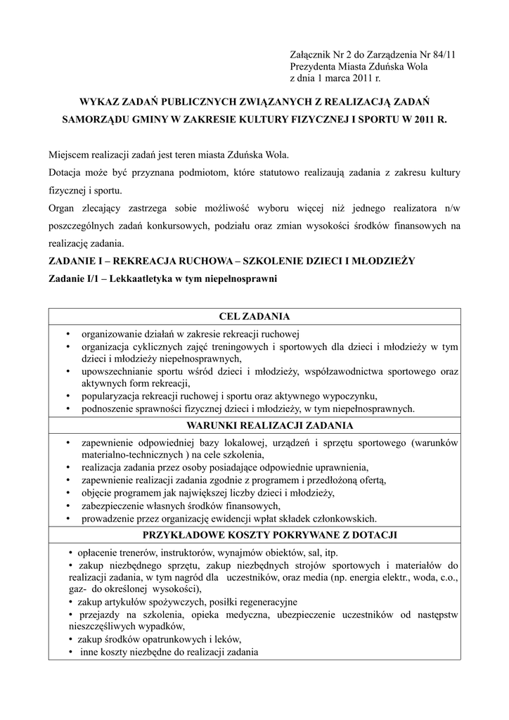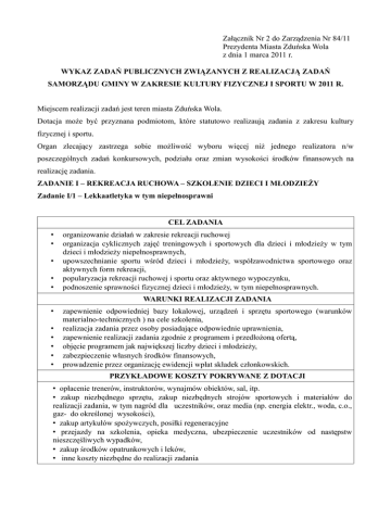 Załącznik Nr 2 do Zarządzenia Nr 84/11 Prezydenta Miasta Zduńska Wola z dnia 1 marca 2011 r. WYKAZ ZADAŃ PUBLICZNYCH ZWIĄZANYCH Z REALIZACJĄ ZADAŃ SAMORZĄDU GMINY W ZAKRESIE KULTURY FIZYCZNEJ I SPORTU W 2011 R. Miejscem realizacji zadań jest teren miasta Zduńska Wola. Dotacja może być przyznana podmiotom, które statutowo realizaują zadania z zakresu kultury fizycznej i sportu. Organ zlecający zastrzega sobie możliwość wyboru więcej niż jednego realizatora n/w poszczególnych zadań konkursowych, podziału oraz zmian wysokości środków finansowych na realizację zadania. ZADANIE I – REKREACJA RUCHOWA – SZKOLENIE DZIECI I MŁODZIEŻY Zadanie I/1 – Lekkaatletyka w tym niepełnosprawni CEL ZADANIA • • • • • organizowanie działań w zakresie rekreacji ruchowej organizacja cyklicznych zajęć treningowych i sportowych dla dzieci i młodzieży w tym dzieci i młodzieży niepełnosprawnych, upowszechnianie sportu wśród dzieci i młodzieży, współzawodnictwa sportowego oraz aktywnych form rekreacji, popularyzacja rekreacji ruchowej i sportu oraz aktywnego wypoczynku, podnoszenie sprawności fizycznej dzieci i młodzieży, w tym niepełnosprawnych. WARUNKI REALIZACJI ZADANIA • • • • • • zapewnienie odpowiedniej bazy lokalowej, urządzeń i sprzętu sportowego (warunków materialno-technicznych ) na cele szkolenia, realizacja zadania przez osoby posiadające odpowiednie uprawnienia, zapewnienie realizacji zadania zgodnie z programem i przedłożoną ofertą, objęcie programem jak największej liczby dzieci i młodzieży, zabezpieczenie własnych środków finansowych, prowadzenie przez organizację ewidencji wpłat składek członkowskich. PRZYKŁADOWE KOSZTY POKRYWANE Z DOTACJI • opłacenie trenerów, instruktorów, wynajmów obiektów, sal, itp. • zakup niezbędnego sprzętu, zakup niezbędnych strojów sportowych i materiałów do realizacji zadania, w tym nagród dla uczestników, oraz media (np. energia elektr., woda, c.o., gaz- do określonej wysokości), • zakup artykułów spożywczych, posiłki regeneracyjne • przejazdy na szkolenia, opieka medyczna, ubezpieczenie uczestników od następstw nieszczęśliwych wypadków, • zakup środków opatrunkowych i leków, • inne koszty niezbędne do realizacji zadania Zadanie I/2 – Piłka siatkowa CEL ZADANIA • organizacja szkolenia z zakresu piłki siatkowej, w tym: treningi, sparingi, turnieje, • popularyzacja walorów rekreacji ruchowej, oraz upowszechnianie aktywnych form wypoczynku i spędzania wolnego czasu, • upowszechnianie sportowego, zdrowego stylu życia, • wszechstronny rozwój sprawności fizycznej dzieci i młodzieży, • kształtowanie pozytywnych cech charakteru i osobowości. WARUNKI REALIZACJI ZADANIA • możliwość zapewnienia odpowiedniej bazy lokalowej, urządzeń, sprzętu sportowego na cele szkolenia, • realizacja zadania przez osoby posiadające odpowiednie uprawnienia, • zapewnienie wykonania zadania zgodnie z przedłożoną ofertą i programem, • objęcie programem jak największej liczby mieszkańców miasta, • zabezpieczenie własnych środków finansowych, • prowadzenie przez organizację ewidencji wpłat składek członkowskich. PRZYKŁADOWE KOSZTY POKRYWANE Z DOTACJI • opłacenie trenerów, instruktorów, • zakup medali, pucharów i dyplomów, • materiały niezbędne do realizacji zadania, w tym niezbędny sprzęt, zakup niezbędnych strojów sportowych i wyposażenie, oraz media (np.energia elektr., woda, c.o., gaz do określonej wysokości), • zakup artykułów spożywczych, posiłki regeneracyjne • ubezpieczenie od skutków nieszczęśliwych wypadków, • zakup środków opatrunkowych i leków:( np. zamrażacze, maści), • opieka medyczna, • wynajem sal, obiektów, itp., • opłaty rejestracyjne zawodników w ramach szkolenia, • opłaty za przejazdy i pobyt na zgrupowaniach szkoleniowych • inne koszty niezbędne do realizacji zadania Zadanie I/3 – Piłka nożna CEL ZADANIA • prowadzenie szkolenia dzieci i młodzieży w zakresie piłki nożnej, • popularyzacja działań w zakresie rekreacji ruchowej, • wpajanie zasad zdrowej rywalizacji sportowej, • promowanie współzawodnictwa sportowego, oraz upowszechnianie form wypoczynku i spędzania wolnego czasu, • wszechstronny rozwój sprawności fizycznej i psychofizycznej dzieci i młodzieży, • kształtowanie pozytywnych cech charakteru i osobowości, • szerzenie pozytywnego wizerunku sportowca. WARUNKI REALIZACJI ZADANIA • • • • • • możliwość zapewnienia odpowiedniej bazy lokalowej, realizacja zadania przez osoby posiadające odpowiednie uprawnienia, zapewnienie wykonania zadania zgodnie z przedłożoną ofertą i programem, objęcie programem jak największej liczby mieszkańców miasta, zabezpieczenie własnych środków finansowych, prowadzenie przez organizację ewidencji wpłat składek członkowskich. PRZYKŁADOWE KOSZTY POKRYWANE Z DOTACJI • zakup niezbędnego sprzętu sportowego (piłki, buty, koszulki, spodenki, dresy), • materiały niezbędne dla realizacji zadania, oraz media (np.energia elektr., woda, c.o., gaz do określonej wysokości), • zakup napoi i innych artykułów spożywczych, posiłki regeneracyjne • opłacenie trenerów, rejestracja zawodników (w ramach szkolenia - do meczów szkoleniowych, sparingów, spotkań towarzyskich, rozgrywek) • zakup środków opatrunkowych i leków: ( np. zamrażacze, bandaże maści), • wynajem sal, obiektów itp. • ubezpieczenie uczestników od następstw nieszczęśliwych wypadków, • przejazdy na mecze, zgrupowania - szkolenie • inne koszty niezbędne do realizacji zadania. Zadanie I/ 4 – Piłka koszykowa CEL ZADANIA • prowadzenie szkolenia dzieci i młodzieży w zakresie piłki koszykowej, • popularyzacja działań w zakresie rekreacji ruchowej, • wpajanie zasad zdrowej rywalizacji sportowej, • promowanie współzawodnictwa sportowego, oraz upowsz