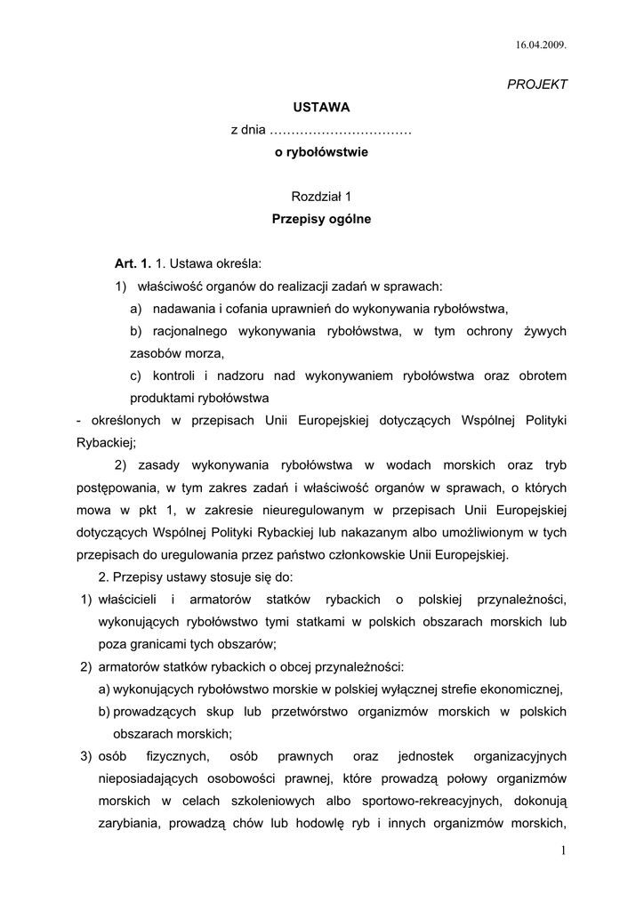 16.04.2009. PROJEKT USTAWA z dnia …………………………… o ryboáówstwie Rozdziaá 1 Przepisy ogólne Art. 1. 1. Ustawa okreĞla: 1) wáaĞciwoĞü organów do realizacji zadaĔ w sprawach: a) nadawania i cofania uprawnieĔ do wykonywania ryboáówstwa, b) racjonalnego wykonywania ryboáówstwa, w tym ochrony Īywych zasobów morza, c) kontroli i nadzoru nad wykonywaniem ryboáówstwa oraz obrotem produktami ryboáówstwa - okreĞlonych w przepisach Unii Europejskiej dotyczących Wspólnej Polityki Rybackiej; 2) zasady wykonywania ryboáówstwa w wodach morskich oraz tryb postĊpowania, w tym zakres zadaĔ i wáaĞciwoĞü organów w sprawach, o których mowa w pkt 1, w zakresie nieuregulowanym w przepisach Unii Europejskiej dotyczących Wspólnej Polityki Rybackiej lub nakazanym albo umoĪliwionym w tych przepisach do uregulowania przez paĔstwo czáonkowskie Unii Europejskiej. 2. Przepisy ustawy stosuje siĊ do: 1) wáaĞcicieli i armatorów statków rybackich o polskiej przynaleĪnoĞci, wykonujących ryboáówstwo tymi statkami w polskich obszarach morskich lub poza granicami tych obszarów; 2) armatorów statków rybackich o obcej przynaleĪnoĞci: a) wykonujących ryboáówstwo morskie w polskiej wyáącznej strefie ekonomicznej, b) prowadzących skup lub przetwórstwo organizmów morskich w polskich obszarach morskich; 3) osób fizycznych, osób prawnych oraz jednostek organizacyjnych nieposiadających osobowoĞci prawnej, które prowadzą poáowy organizmów morskich w celach szkoleniowych albo sportowo-rekreacyjnych, dokonują zarybiania, prowadzą chów lub hodowlĊ ryb i innych organizmów morskich, 1 16.04.2009. wprowadzają gatunki obce lub przenoszą gatunki niewystĊpujące miejscowo w polskich obszarach morskich; 4) osób prawnych oraz jednostek organizacyjnych nieposiadających osobowoĞci prawnej, które prowadzą poáowy organizmów morskich w celach naukowobadawczych. 3. Minister wáaĞciwy do spraw ryboáówstwa ogáosi, w drodze obwieszczenia, wykaz przepisów Unii Europejskiej dotyczących Wspólnej Polityki Rybackiej, o których mowa w ust. 1. Art. 2. UĪyte w ustawie okreĞlenia oznaczają: 1) ryboáówstwo – ryboáówstwo morskie, skup lub przetwórstwo na morzu organizmów morskich, poáów organizmów morskich w celach naukowobadawczych, szkoleniowych albo sportowo-rekreacyjnych, zarybianie oraz chów lub hodowlĊ ryb lub innych organizmów morskich, wprowadzanie gatunków obcych lub gatunków niewystĊpujących miejscowo w polskich obszarach morskich; 2) ryboáówstwo morskie - poáów organizmów morskich w celach zarobkowych; 3) historyczna baza poáowowa - udokumentowane wykorzystywanie przez armatora kwot poáowowych danego gatunku organizmów morskich lub wystawianie lub uĪywanie odpowiednich narzĊdzi poáowowych, w okreĞlonym czasie w przeszáoĞci, stanowiące podstawĊ do ubiegania siĊ o prowadzenie poáowów okreĞlonego gatunku organizmów morskich w okreĞlonym obszarze lub wystawianie lub uĪywanie okreĞlonej liczby narzĊdzi poáowowych danego rodzaju; 4) obrót produktami ryboáówstwa – wyáadunek, sprzedaĪ detaliczną lub hurtową, transport, lub magazynowanie produktów ryboáówstwa na lądzie, a takĪe przeáadunek produktów ryboáówstwa ze statku rybackiego na statek w morzu; 5) organizacja spoáeczno-zawodowa rybaków – uznaną organizacjĊ producentów, o której mowa w art. 5 rozporządzenia Rady (WE) nr 104/2000 z dnia 17 grudnia 1999 r. w sprawie wspólnej organizacji rynków produktów ryboáówstwa i akwakultury (Dz. Urz. WE L 17 z 21.01.2000, str. 22, z póĨn. zm.; Dz. Urz. UE Polskie wydanie specjalne, rozdz. 4, t. 4, str. 198) lub stowarzyszenie w rozumieniu ustawy z dnia 7 kwietnia 1989 r. Prawo o stowarzyszeniach (Dz. U. z 2001 r. Nr 79, poz. 855, z 2003 r. Nr 96, poz. 874, z 2004 r. Nr 102, poz. 1055 2 16.04.2009. oraz z 2007 r. Nr 112, poz. 766), do którego celów statutowych naleĪy dziaáanie na rzecz ryboáówstwa i zrzeszające co najmniej 20 armatorów statków rybackich o polskiej przynaleĪnoĞci wykonujących ryboáówstwo; 6) wycofanie statku rybackiego z wykonywania ryboáówstwa morskiego zaprzestanie wykonywania ryboáówstwa morskiego z powodu rezygnacji przez wáaĞciciela tego statku z wykonywania ryboáówstwa morskiego przy uĪyciu tego statku albo z powodu zatoniĊcia, zaginiĊcia lub zniszczenia danego statku rybackiego. Art. 3. Minister wáaĞciwy do spraw ryboáówstwa okreĞli, w drodze rozporządzenia, granice miĊdzy wodami morskimi a wodami Ğródlądowymi do celów wykonywania ryboáówstwa, mając na wzglĊdzie zróĪnicowanie metod zarządzania Īywymi zasobami morza i wód Ğródlądowych. Art. 4. 1. W sprawach indywidualnych rozstrzyganych w drodze decyzji stosuje siĊ przepisy Kodeksu postĊpowania administracyjnego, chyba Īe przepisy ustawy stanowią inaczej. 2. Przepisy ustawy okreĞlające warunki wykonywania ryboáówstwa nie naruszają przepisów o ochronie przyrody. Rozdziaá 2 Wykonywanie ryboáówstwa w wodach morskich Art. 5. 1. Ryboáówstwo morskie statkami rybackimi o polskiej przynaleĪnoĞci moĪe byü wykonywane przez armatora, którego siedziba albo oddziaá, albo miejsce zamieszkania znajduje siĊ na terytorium Rzeczypospolitej Polskiej. 2. Ryboáówstwo morskie na terytorium Rzeczypospolitej Polskiej moĪe byü wykonywane wyáącznie statkami rybackimi o polskiej przynaleĪnoĞci. Art. 6. Wykonywanie ryboáówstwa morskiego przez armatora, o którym mowa w art. 5 ust. 1, odbywa siĊ przy uĪyciu statku rybackiego wpisanego do rejestru statków rybackich, zwanego dalej „rejestrem”, na który zostaáa wydana licencja poáowowa oraz specjalne zezwolenie poáowowe. 3 16.04.2009. Art. 7. 1. Minister wáaĞciwy do spraw ryboáówstwa prowadzi rejestr zgodnie z rozporządzeniem Komisji (WE) nr 26/2004 z dnia 30 grudnia 2003 r. dotyczącym rejestru statków rybackich Wspólnoty (Dz. Urz. UE L 5 z 09.01.2004, str. 25, z póĨn. zm.; Dz. Urz. UE Polskie w
