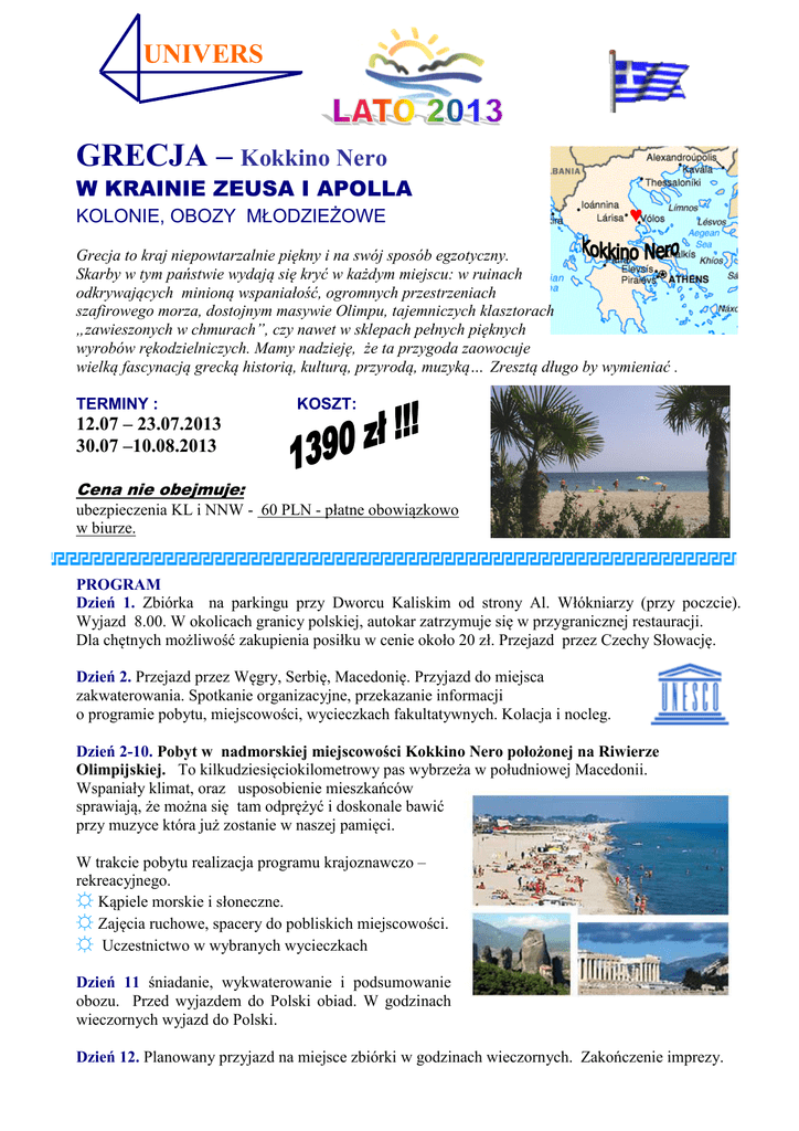 UNIVERS GRECJA – Kokkino Nero W KRAINIE ZEUSA I APOLLA KOLONIE, OBOZY MŁODZIEŻOWE ♥ Grecja to kraj niepowtarzalnie piękny i na swój sposób egzotyczny. Skarby w tym państwie wydają się kryć w każdym miejscu: w ruinach odkrywających minioną wspaniałość, ogromnych przestrzeniach szafirowego morza, dostojnym masywie Olimpu, tajemniczych klasztorach „zawieszonych w chmurach”, czy nawet w sklepach pełnych pięknych wyrobów rękodzielniczych. Mamy nadzieję, że ta przygoda zaowocuje wielką fascynacją grecką historią, kulturą, przyrodą, muzyką… Zresztą długo by wymieniać . TERMINY : KOSZT: 12.07 – 23.07.2013 30.07 –10.08.2013 Cena nie obejmuje: ubezpieczenia KL i NNW - 60 PLN - płatne obowiązkowo w biurze. PROGRAM Dzień 1. Zbiórka na parkingu przy Dworcu Kaliskim od strony Al. Włókniarzy (przy poczcie). Wyjazd 8.00. W okolicach granicy polskiej, autokar zatrzymuje się w przygranicznej restauracji. Dla chętnych możliwość zakupienia posiłku w cenie około 20 zł. Przejazd przez Czechy Słowację. Dzień 2. Przejazd przez Węgry, Serbię, Macedonię. Przyjazd do miejsca zakwaterowania. Spotkanie organizacyjne, przekazanie informacji o programie pobytu, miejscowości, wycieczkach fakultatywnych. Kolacja i nocleg. Dzień 2-10. Pobyt w nadmorskiej miejscowości Kokkino Nero położonej na Riwierze Olimpijskiej. To kilkudziesięciokilometrowy pas wybrzeża w południowej Macedonii. Wspaniały klimat, oraz usposobienie mieszkańców sprawiają, że można się tam odprężyć i doskonale bawić przy muzyce która już zostanie w naszej pamięci. W trakcie pobytu realizacja programu krajoznawczo – rekreacyjnego. ☼ Kąpiele morskie i słoneczne. ☼ Zajęcia ruchowe, spacery do pobliskich miejscowości. ☼ Uczestnictwo w wybranych wycieczkach Dzień 11 śniadanie, wykwaterowanie i podsumowanie obozu. Przed wyjazdem do Polski obiad. W godzinach wieczornych wyjazd do Polski. Dzień 12. Planowany przyjazd na miejsce zbiórki w godzinach wieczornych. Zakończenie imprezy. Opis i ceny wycieczek fakultatywnych. ♥ METEORY – geologiczny i historyczny fenomen, ogromne skały, na szczycie których znajdują się klasztory. Nazwa pochodzi od słowa "meteor" - "zawieszony pomiędzy niebem a ziemią". Terminu tego miał użyć w XIV w. mnich Atanazy, który pierwszy zbudował tu klasztor. Legenda głosi, że na górę wzniósł się na skrzydłach orła. Koszt 35 € + każdy klasztor 2€ ♥ ATENY - całodzienna wycieczka do miasta - legendy - kolebki kultury europejskiej. Ateny istnieją od ponad 3500 lat, ale dni ich świetności przypadają na okres dziejów Grecji, którego spuścizną są zachowane budowle i dzieła sztuki. Szczególnie V stulecie p.n.e. było złotym wiekiem, gdy pod okiem Peryklesa wznoszono nowe budowle na Akropolu. Dzisiaj jest to nowoczesna, tętniąca życiem metropolia.W programie Akropol, port Pireus, dzielnicę Plaka – stara dzielnica Aten, zmiana warty pod Parlamentem i niezliczone zabytki tego magicznego miasta. Koszt 45 € ♥ REJS NA WYSPĘ SKIATOS - Urocza wyspa w archipelagu Sporad z jedną z niewielu na świecie plaż ze złocistym piaskiem. Na statku kapitan uczy tańców greckich a ze stateczku wspaniałe widoki wysokich gór schodzących wprost do lazurowego morza. Koszt 40 € ŚWIADCZENIA Opis zakwaterowania: Studio: Katerina, Dimitros, Kalipso, Panos, Lula Nasze budynki to starannie wyselekcjonowane obiekty, najlepsze w miejscowości. W studiach znajduje się: sypialnia dla 2 lub 3 osób, łazienka i kuchnia (w pełni wyposażona w: lodówkę, kuchenkę elektryczną ). Uczestnicy we własnym zakresie powinni wyposażyć sie w: ręczniki, środki czystości. Pościel jest na wyposażeniu studia. Odległość studiów od plaży od 50 do 300 metrów. Plaża kamienista. Woda w apartamentach ogrzewana jest bateriami słonecznymi umieszczonymi na dachach budynków. Lokalizacja i wyposażenie obiektów sprawia, że to idealne miejsce na obóz młodzieży w Grecji. ☼ Przejazd luksusowym autokarem – klimatyzacja, barek. ☼ 9 noclegów w apartamencie ☼ Wyżywienie - 9 śniadań, 9 lunchów, 9 obiadokolacji ☼ Opieka wykwalifikowanej kadry pedagogicznej oraz ratownika WOPR Uwaga ! na wyjazd konieczny jest paszport lub d.o. Organizator wyjazdu: Biuro Turystyczne Fun Club Poznań __________________________________________________________________________________ UNIVERS – Biuro Turystyczne tel. (42) 630 52 12 fax (42) 633 79 00 90-307 Łódź Al. J. Piłsudskiego 35 [email protected] www.btunivers.pl