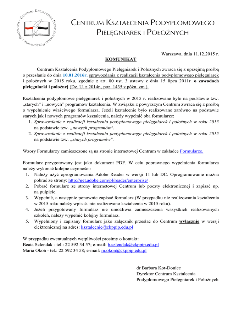 Warszawa, dnia 11.12.2015 r. KOMUNIKAT Centrum Kształcenia Podyplomowego Pielęgniarek i Położnych zwraca się z uprzejmą prośbą o przesłanie do dnia 10.01.2016r. sprawozdania z realizacji kształcenia podyplomowego pielęgniarek i położnych w 2015 roku, zgodnie z art. 80 ust. 3 ustawy z dnia 15 lipca 2011r. o zawodach pielęgniarki i położnej (Dz. U. z 2014r., poz. 1435 z późn. zm.). Kształcenia podyplomowe pielęgniarek i położnych w 2015 r. realizowane było na podstawie tzw. „starych” i „nowych” programów kształcenia. W związku z powyższym Centrum zwraca się z prośbą o wypełnienie właściwego formularza. Jeżeli kształcenie było realizowane zarówno na podstawie starych jak i nowych programów kształcenia, należy wypełnić oba formularze: 1. Sprawozdanie z realizacji kształcenia podyplomowego pielęgniarek i położnych w roku 2015 na podstawie tzw. „nowych programów". 2. Sprawozdanie z realizacji kształcenia podyplomowego pielęgniarek i położnych w roku 2015 na podstawie tzw. „starych programów". Wzory Formularzy zamieszczone są na stronie internetowej Centrum w zakładce Formularze. Formularz przygotowany jest jako dokument PDF. W celu poprawnego wypełnienia formularza należy wykonać kolejne czynności: 1. Należy użyć oprogramowania Adobe Reader w wersji 11 lub DC. Oprogramowanie można pobrać ze strony: http://get.adobe.com/pl/reader/enterprise/ . 2. Pobrać formularz ze strony internetowej Centrum lub poczty elektronicznej i zapisać np. na pulpicie. 3. Wypełnić, a następnie ponownie zapisać formularz (W przypadku nie realizowania kształcenia w 2015 roku należy wpisać- nie realizowano kształcenia w 2015 roku). 4. Jeżeli przygotowany formularz nie umożliwia zamieszczenia wszystkich realizowanych szkoleń, należy wypełnić kolejny formularz. 5. Wypełniony i zapisany formularz jako załącznik przesłać do Centrum wyłącznie w wersji elektronicznej na adres: [email protected] W przypadku ewentualnych wątpliwości prosimy o kontakt: Beata Szlendak - tel.: 22 592 34 57; e-mail: [email protected] Maria Okoń - tel.: 22 592 34 58; e-mail: [email protected] dr Barbara Kot-Doniec Dyrektor Centrum Kształcenia Podyplomowego Pielęgniarek i Położnych