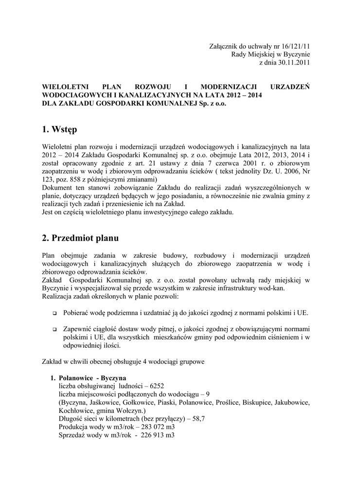 Załącznik do uchwały nr 16/121/11 Rady Miejskiej w Byczynie z dnia 30.11.2011 WIELOLETNI PLAN ROZWOJU I MODERNIZACJI WODOCIAGOWYCH I KANALIZACYJNYCH NA LATA 2012 – 2014 DLA ZAKŁADU GOSPODARKI KOMUNALNEJ Sp. z o.o. URZADZEŃ 1. Wstęp Wieloletni plan rozwoju i modernizacji urządzeń wodociągowych i kanalizacyjnych na lata 2012 – 2014 Zakładu Gospodarki Komunalnej sp. z o.o. obejmuje Lata 2012, 2013, 2014 i został opracowany zgodnie z art. 21 ustawy z dnia 7 czerwca 2001 r. o zbiorowym zaopatrzeniu w wodę i zbiorowym odprowadzaniu ścieków ( tekst jednolity Dz. U. 2006, Nr 123, poz. 858 z późniejszymi zmianami) Dokument ten stanowi zobowiązanie Zakładu do realizacji zadań wyszczególnionych w planie, dotyczący urządzeń będących w jego posiadaniu, a równocześnie nie zwalnia gminy z realizacji tych zadań i przeniesienie ich na Zakład. Jest on częścią wieloletniego planu inwestycyjnego całego zakładu. 2. Przedmiot planu Plan obejmuje zadania w zakresie budowy, rozbudowy i modernizacji urządzeń wodociągowych i kanalizacyjnych służących do zbiorowego zaopatrzenia w wodę i zbiorowego odprowadzania ścieków. Zakład Gospodarki Komunalnej sp. z o.o. został powołany uchwałą rady miejskiej w Byczynie i wyspecjalizował się przede wszystkim w zakresie infrastruktury wod-kan. Realizacja zadań określonych w planie pozwoli: Pobierać wodę podziemna i uzdatniać ją do jakości zgodnej z normami polskimi i UE. Zapewnić ciągłość dostaw wody pitnej, o jakości zgodnej z obowiązującymi normami polskimi i UE, dla wszystkich mieszkańców gminy pod odpowiednim ciśnieniem i w odpowiedniej ilości. Zakład w chwili obecnej obsługuje 4 wodociągi grupowe 1. Polanowice - Byczyna liczba obsługiwanej ludności – 6252 liczba miejscowości podłączonych do wodociągu – 9 (Byczyna, Jaśkowice, Gołkowice, Piaski, Polanowice, Proślice, Biskupice, Jakubowice, Kochłowice, gmina Wołczyn.) Długość sieci w kilometrach (bez przyłączy) – 58,7 Produkcja wody w m3/rok – 283 072 m3 Sprzedaż wody w m3/rok - 226 913 m3 2. Kostów liczba obsługiwanej ludności – 1186 liczba miejscowości podłączonych do wodociągu – 4 (Kostów, Janówka, Ciecierzyn, Miechowa) Długość sieci w kilometrach (bez przyłączy) – 15,8 Produkcja wody w m3/rok – 54639 m3 Sprzedaż wody w m3/rok - 50399 m3 3. Dobiercice liczba obsługiwanej ludności – 791 liczba miejscowości podłączonych do wodociągu – 4 (Dobiercice, Sarnów, Pszczonki, Chudoba) Długość sieci w kilometrach (bez przyłączy) – 10,4 Produkcja wody w m3/rok – 31869 m3 Sprzedaż wody w m3/rok – 22600 m3 4. Nasale – Kastel liczba obsługiwanej ludności – 1624 liczba miejscowości podłączonych do wodociągu – 8 (Wojsławice, Roszkowice, Sierosławice, Borki, Nasale, Gosław, Paruszowice, Pogorzałka) Długość sieci w kilometrach (bez przyłączy) – 25,6 Produkcja wody w m3/ rok - 49653 m3 Sprzedaż wody w m3/rok - 36397 m3 W eksploatacji Zakładu znajduje się 12 studni głębinowych z których zaopatruje się w wodę 23 miejscowości na terenie gminy. Długość przyłączy domowych wynosi ok. 40 km. 1,2 km sieci wodociągowej jest własnością osób prywatnych. Od roku 2001, od wejścia w życie ustawy, 125 osób jest właścicielami swoich przyłączy. Rocznie 12 nowych odbiorców zawiera umowy na dostawę wody. 3. Rozwój i modernizacja urządzeń wodociągowych Zakres prac modernizacyjnych i rozwojowych obejmuje: Stacje uzdatniania wody i obiektów z nimi związanych Sieć wodociągową Stacja Uzdatniania Wody Dobiercice 1. Opracowanie dokumentacji rozbudowy stacji SUW wraz z uzdatnianiem wody 2. Rozbudowa stacji 3. Wykonanie nowych odwiertów studni 4. Utworzenie stref ochrony bezpośredniej ujęć Stacja Uzdatniania Wody Polanowice 1. Rozbudowa SUW Polanowice wraz z uzdatnianiem wody Stacja Uzdatniania Wody Nasale - Kastel 1. Uzbrojenie nowej studni 2. Utworzenie strefy ochrony bezpośredniej ujęcia 3. Rozbudowa SUW Kastel wraz z uzdatnianiem wody Sieć wodociągowa Dobiercice 1. Opracowanie dokumentacji budowy sieci SUW Dobiercice-Chudoba – Stacja Biskupice – Biskupice wieś – Byczyna wpięcie do tranzytu 2. Polanowice - Byczyna 3. Wykonanie sieci 4. Modernizacja urządzeń pomiarowych (wymiana wodomierzy) Sieć wodociągowa Byczyna 1. Opracowanie dokumentacji budowy sieci łączącej wodociąg Piaski z stacją SUW Kostów 2. Wykonanie sieci 3. Opracowanie dokumentacji rozbudowy sieci wodociągowej w Byczynie, kanalizacji sanitarnej i deszczowej na terenie tartaku 4. Rozbudowa sieci wodociągowej w Byczynie, kanalizacji sanitarnej i deszczowej na terenie tartaku 5. Opracowanie dokumentacji rozbudowy sieci wodociągowej w Byczynie, kanalizacji sanitarnej i deszczowej teren ul. Częstochowskiej i Nasalskiej 6. Rozbudowa sieci wodociągowej w Byczynie, kanalizacji sanitarnej i deszczowej teren ul. Częstochowskiej i Nasalskiej 7. Opracowanie dokumentacji budowy stacji podnoszenia ciśnienia wody – ul. Częstochowska – Nasalska 8. Budowa stacji podnoszenia ciśnienia wody – ul. Częstochowska – Nasalska 9. Modernizacja urządzeń pomiarowych – wymiana 200 szt. wodomierzy 10. Opracowanie dokumentacji budowy sieci wodociągowych ulic Brzozowa - Borkowska 11. Budowa sieci wodociągowych ulic Brzozowa - Borkowska Sieć wodociągowa Nasale - Kastel 1. Opracowanie dokumentacji budowy sieci łączącej SUW Kastel – Nowy Gródek – Nasale 2. Wykonanie sieci 3. Modernizacja urządzeń pomiarowych (wymiana wodomierzy) Sieć wodociągowa Polanowice 1. Sukcesywna wymiana przyłączy wodociągowych 30 szt. 2. Modernizacja urządzeń pomiarowych (wymiana wodomierzy) 4.Racjonalizacja zużycia wody Opiera się o następujące zaplanowane działania określone w planie Modernizacja urządzeń pomiarowych( wymiana wodomierzy na nowe w wyższej klasie pomiarowej ok. 600 szt.) Wymiana starych , awaryjnych przyłączy (rozpoczynając od wsi Polanowice) Zwiększenie poziomu 