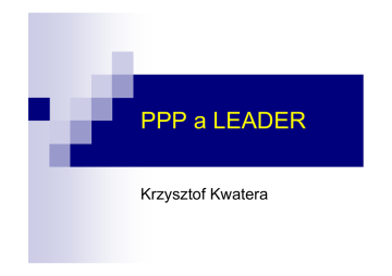 PPP a LEADER Krzysztof Kwatera Historia uchwalania PPP Projekt rządu - czerwiec 2004 Ustawa przyjęta przez Sejm po poprawkach Senatu - 28 lipca 2005 Podpisanie przez Prezydenta - 18 sierpnia 2005 Definicja PPP Art. 1 2. Partnerstwo publiczno-prywatne, w rozumieniu ustawy, to, oparta na umowie o partnerstwie publiczno-prywatnym współpraca podmiotu publicznego i partnera prywatnego, służąca realizacji zadania publicznego, jeżeli odbywa się na zasadach określonych w ustawie. Źródło: Ustawa o partnerstwie publiczno-prywatnym Przedmiot PPP Art. 2. 1. Przedmiotem umowy o partnerstwie publicznoprywatnym jest realizacja przez partnera prywatnego przedsięwzięcia za wynagrodzeniem na rzecz podmiotu publicznego. 2. Partner prywatny poniesie w całości albo w części nakłady na realizację przedsięwzięcia, o którym mowa w ust. 1, lub zapewni ich poniesienie przez inne podmioty. Przedsięwzięcie (1) Art. 4, ust. 4 a) zaprojektowanie lub realizację inwestycji w wykonaniu zadania publicznego, b) świadczenie usług publicznych przez okres powyżej 3 lat, jeżeli obejmuje eksploatację, utrzymanie lub zarządzanie niezbędnym do tego składnikiem majątkowym, Przedsięwzięcie (2) c) działanie na rzecz rozwoju gospodarczego i społecznego, w tym rewitalizacji albo zagospodarowania miasta lub jego części albo innego obszaru, przeprowadzone na podstawie projektu przedłożonego przez podmiot publiczny lub połączone z jego zaprojektowaniem przez partnera prywatnego, jeżeli wynagrodzenie partnera prywatnego nie będzie mieć formy zapłaty sumy pieniężnej przez podmiot publiczny, Przedsięwzięcie (3) d) przedsięwzięcie pilotażowe, promocyjne, naukowe, edukacyjne lub kulturalne, wspomagające realizację zadań publicznych, jeżeli wynagrodzenie partnera prywatnego będzie pochodziło w przeważającej części ze źródeł innych niż środki podmiotu publicznego Wynagrodzenie partnera prywatnego Art. 4, ust. 4 prawo partnera prywatnego do pobierania pożytków lub uzyskiwania innych korzyści z przedsięwzięcia lub zapłatę sumy pieniężnej przez podmiot publiczny. Warunek zastosowania PPP Art. 3. 1.Partnerstwo publiczno-prywatne może stanowić sposób realizacji przedsięwzięcia, jeżeli przynosi to korzyści dla interesu publicznego przeważające w stosunku do korzyści wynikających z innych sposobów realizacji tego przedsięwzięcia. Korzyści z zastosowania PPP Art. 3. 2. Korzyścią dla interesu publicznego jest w szczególności oszczędność w wydatkach podmiotu publicznego, podniesienie standardu świadczonych usług lub obniżenie uciążliwości dla otoczenia. Partner prywatny Art. 4, ust. 2 a) przedsiębiorca w rozumieniu przepisów o swobodzie działalności gospodarczej, b) organizację pozarządową, c) kościół lub inny związek wyznaniowy, d) podmiot zagraniczny, jeżeli jest przedsiębiorcą w rozumieniu prawa kraju rejestracji i spełnia warunki do wykonywania w Rzeczypospolitej Polskiej działalności gospodarczej; Partner publiczny (1) Art. 4, ust. 3 a) organy administracji rządowej, b) jednostki samorządu terytorialnego oraz ich związki, c) fundusze celowe, d) państwowe szkoły wyższe, e) jednostki badawczo-rozwojowe, f) samodzielne publiczne zakłady opieki zdrowotnej, Partner publiczny (2) g) państwowe lub samorządowe instytucje kultury, h) Polska Akademia Nauk i tworzone przez nią jednostki organizacyjne, i) państwowe lub samorządowe osoby prawne utworzone na podstawie odrębnych ustaw w celu wykonywania zadań publicznych, z wyłączeniem przedsiębiorstw, banków i spółek handlowych; Partnerstwo, ale ... (1) Art. 10. 1. Podmiot zainteresowany realizacją określonego przedsięwzięcia w ramach partnerstwa publiczno-prywatnego może zgłosić wniosek do podmiotu publicznego z propozycją realizacji tego przedsięwzięcia. 2. Podmiot, który złożył wniosek, o którym mowa w ust. 1, nie może być traktowany w sposób szczególny przez podmiot publiczny w trakcie postępowania o wybór partnera prywatnego. Partnerstwo, ale ... (2) Choć z pewnymi wyjątkami, to jednak ... Art. 14. Do wyboru partnera prywatnego i umów o partnerstwie publiczno-prywatnym w zakresie nieuregulowanym w ustawie stosuje się odpowiednio przepisy ustawy z dnia 29 stycznia 2004 r. - Prawo zamówień publicznych [...] Przykłady PPP Przykłady w wydawnictwie Komisji Europejskiej z 2004 r.: 26 duże projekty infrastrukturalne z zakresu gospodarki wodno-ściekowej, gospodarki odpadami, transportu od kilku mln do kilkuset mln Euro Przykład z Polski - budowa lotniska w Warszawie Inne przykłady w Polsce - budowa autostrad, modernizacja oświetlenia ulicznego w Krakowie PPP, LGD (partnerstwo międzysektorowe) Lokalna Grupa Działania Partnerstwo Publiczno-Prywatne Dotyczy zrównoważonego rozwoju całego obszaru (wiejskiego) Dotyczy realizacji konkretnego przedsięwzięcia Głównym zadaniem jest realizacja strategii, wspomaganie opracowania projektów, które służą jej realizacji, poszukiwanie środków i dobieranie partnerów dla realizacji tych projektów Główne zadanie - realizacja jednego projektu, który powinien wynikać ze strategii rozwoju regionu Fundacja, stowarzyszenie lub związek stowarzyszeń Umowa lub spółka kapitałowa Pożądana jak największa, ewentualnie liczna reprezentacja Wystarcza dwóch i im mniej tym łatwiej określić ich kompetencje i zadania Strategia (ZSROW), a projekty PPP LGD (Partnerstwo międzysektorowe) Strategia rozwoju (ZSROW) PPP 1 PPP 2 PPP 3 Przedsięwzięcie 1 Przedsięwzięcie 2 Przedsięwzięcie 3