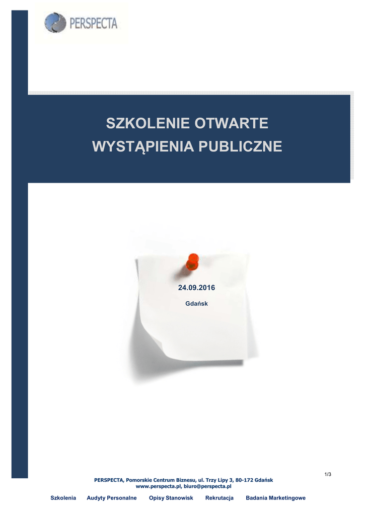 SZKOLENIE OTWARTE WYSTĄPIENIA PUBLICZNE 24.09.2016 Gdańsk 1/3 PERSPECTA, Pomorskie Centrum Biznesu, ul. Trzy Lipy 3, 80-172 Gdańsk www.perspecta.pl, [email protected] Szkolenia Audyty Personalne Opisy Stanowisk Rekrutacja Badania Marketingowe KORZYŚCI UCZESTNICTWA W SZKOLENIACH OTWARTYCH Szkolenia prowadzone w formie 20% teorii, 80% praktyki Największy wybór tematyczny szkoleń otwartych w Trójmieście Wykwalifikowana kadra trenerska Imienne Certyfikaty Ukończenia Szkolenia Małe grupy szkoleniowe, pozwalające na indywidualną analizę każdego uczestnika Kompleksowy pakiet materiałów szkoleniowych TECHNIKI SZKOLENIOWE Prezentacje Multimedialne Ćwiczenia Analiza przypadku, case studies Testy psychologiczne Indywidualne doradztwo Dyskusje, demonstracje Gry symulacyjne Scenki, psychodrama WARUNKI ORGANIZACYJNE Uczestnicy szkolenia Szkolenie skierowane zarówno do firm jak i osób prywatnych. Koszt 499 PLN - 1 dzień szkoleniowy (w godzinach 8-14), materiały szkoleniowe, certyfikat ukończenia szkolenia, przerwy kawowe, każdy z uczestników otrzyma również nagrania. Aktualne promocje dostępne na naszej stronie. Zapisy Formularz zgłoszeniowy oraz lista pozostałych szkoleń dostępne na naszej stronie w zakładce Szkolenia Otwarte. Liczba miejsc w szkoleniu jest ograniczona. Decyduje kolejność zgłoszeń. 2/3 PERSPECTA, Pomorskie Centrum Biznesu, ul. Trzy Lipy 3, 80-172 Gdańsk www.perspecta.pl, [email protected] Szkolenia Audyty Personalne Opisy Stanowisk Rekrutacja Badania Marketingowe MODUŁY SZKOLENIA Cel szkolenia: Umiejętność występowania jest potrzeba nie tylko w polityce - jest również niezbędna w każdej dziedzinie życia. Każdy pracodawca, przełożony musi umieć przemawiać do swoich pracowników, tak aby udowodnić, że jest prawdziwym liderem i zachęcić swoich pracowników do zwiększenia zaangażowania w pracy. Uczestnicy szkolenia poznają sposoby na: • przemówienie, którego nikt nie zapomni • osiągnięcie celu wystąpienia • utrzymanie uwagi słuchaczy Dodatkowo nauczą się, jak występować, aby być słuchanym, jak trafić do publiczności i pozbyć się tremy. Część ćwiczeń stanowią ćwiczenia z kamerą, każdy z uczestników po zakończeniu szkolenia otrzyma nagrania z poszczególnych ćwiczeń na pendrive’ie wliczonym w cenę szkolenia. PRZYGOTOWANIE DO WYSTĄPIENIA Jak powinnyśmy wyglądać. Ubranie, makijaż, postawa. Zasady zachowania na scenie.. Co powinniśmy wiedzieć o słuchaczach – kluczowe informacje a dostosowanie stylu wystąpienia. Mocne i słabe strony mówcy– co powinnyśmy wiedzieć o sobie. Określenie celu przemówienia – co chcemy osiągnąć. NAWIĄZANIE KONTAKTU ZE SŁUCHACZAMI Jak ważne jest pierwsze wrażenie. Sztuka dopasowania do widowni. Jak rozpocząć – dobre wejście. Przedstawienie – co o sobie opowiedzieć. Rodzaje grup – same kobiety, sami mężczyźni, grupy mieszane. MOWA WERBALNA I NIEWERBALNA Głos i ton głosu – jak wpływają na słuchaczy, jak się nimi posługiwać. Słowa, które przyciągają uwagę. Jak utrzymać uwagę słuchaczy. Pewność siebie w trakcie wypowiedzi. Gestykulacja sposobem utrzymania zainteresowania, podkreślenia rangi wypowiedzi. TECHNIKI OBNIŻANIA STRESU I LIKWIDACJI TREMY Jak poradzić sobie ze stresem tak aby słuchacze się nie zorientowali. Jak pozbyć się tremy i wyglądać na pewnego siebie. Jak utrzymać emocjonalne połączenie z odbiorcą. Trudne sytuacje – jak sobie z nimi radzić? PYTANIA – JAK NA NIE ODPOWIADAĆ? Pytania, których na pewno możesz się spodziewać. Jak odpowiedzieć gdy nie znasz odpowiedzi. Niewygodny uczestnik, niewygodne pytania, jak na nie reagować i nie dać się wyprowadzić z równowagi. JAK ZAKOŃCZYĆ ABY ZOSTAĆ ZAPAMIĘTANYM Zakończenie – podsumowaniem przemówienia. TRIKI, KTÓRE NAM POMOGĄ Power point – kiedy jest pomocny. Gry szkoleniowe i ich wpływ na korzyść mówcy. Przerywniki, które pomagają w ponownym przyciągnięciu uwagi. Techniki wspomagające jakość wystąpień. 3/3 PERSPECTA, Pomorskie Centrum Biznesu, ul. Trzy Lipy 3, 80-172 Gdańsk www.perspecta.pl, [email protected] Szkolenia Audyty Personalne Opisy Stanowisk Rekrutacja Badania Marketingowe