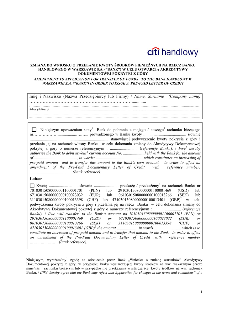 ZMIANA DO WNIOSKU O PRZELANIE KWOTY ŚRODKÓW PIENIĘŻNYCH NA RZECZ BANKU HANDLOWEGO W WARSZAWIE S.A. (”BANK”) W CELU OTWARCIA AKREDYTYWY DOKUMENTOWEJ POKRYTEJ Z GÓRY AMENDMENT TO APPLICATION FOR TRANSFER OF FUNDS TO THE BANK HANDLOWY W WARSZAWIE S.A. (“BANK”) IN ORDER TO ISSUE A PRE-PAID LETTER OF CREDIT Imię i Nazwisko (Nazwa Przedsiębiorcy lub Firmy) / Name, Surname ……………………………………………………………............. (Company name) …………………………………………………………………………………………………………………………….…............ Adres (Address)………………………………………………………………………….....................…………………………………….............. ………………………………………………………………………………………………………………………………………. .....…………………………………………………………….……..…………………………………………………………….… Niniejszym upoważniam /-my1 Bank do pobrania z mojego / naszego1 rachunku bieżącego nr………………..................….…... prowadzonego w Banku kwoty .......................................... słownie ............................................................................. stanowiącej podwyższenie kwoty pokrycia z góry i przelania jej na rachunek własny Banku w celu dokonania zmiany do Akredytywy Dokumentowej pokrytej z góry o numerze referencyjnym : ........................... (referencje Banku). / I/we1 hereby authorize the Bank to debit my/our1 current account No. .....................held with the Bank for the amount of .........................................., in words: ............................................., which constitutes an increasing of pre-paid amount and to transfer this amount to the Bank’s own account in order to effect an amendment of the Pre-Paid Documentary Letter of Credit with reference number: ......................................... (Bank reference). Lub/or Kwotę ..............................słownie ........................ przekażę / przekażemy1 na rachunek Banku nr 70103015080000001100001701 (PLN) lub 29103015080000001100001469 (USD) lub 67103015080000000100023032 (EUR) lub 06103015080000000100013266 (SEK) lub 31103015080000000100013398 (CHF) lub 47103015080000000100013401 (GBP)2 w celu podwyższenia kwoty pokrycia z góry i przelania jej na rzecz Banku w celu dokonania zmiany do Akredytywy Dokumentowej pokrytej z góry o numerze referencyjnym : ........................... (referencje Banku). / I/we will transfer1 to the Bank’s account no 70103015080000001100001701 (PLN) or 29103015080000001100001469 (USD) or 67103015080000000100023032 (EUR) or 06103015080000000100013266 (SEK) or 31103015080000000100013398 (CHF) or 47103015080000000100013401 (GBP)2 the amount .................... in words .......................... which is to constitute an increased of pre-paid amount and to transfer that amount to the Bank in order to effect an amendment of the Pre-Paid Documentary Letter of Credit ,with reference number ……………………(Bank reference). Niniejszym, wyrażam/my1 zgodę na odrzucenie przez Bank „Wniosku o zmianę warunków” Akredytywy Dokumentowej pokrytej z góry, w przypadku braku wystarczającej kwoty środków na ww. wskazanym przeze mnie/nas rachunku bieżącym lub w przypadku nie przekazania wystarczającej kwoty środków na ww. rachunek Banku. / I/We1 hereby agree that the Bank may reject „an Application for changes in the terms and conditions” of a 1 Pre-Paid Documentary Letter of Credit in case if there is no sufficient balance in the a.m. account indicated by myself/us or in case of lack of transfer of sufficient amount to the account of the Bank. Niniejsza zmiana podlega warunkom oryginalnego wniosku o przelanie kwoty środków pieniężnych na rzecz Banku Handlowego w Warszawie S.A. w celu otwarcia akredytywy dokumentowej pokrytej z gory z dnia …………................................. . oraz zmian(y) do tego wniosku. / This amendment is governed by the rules applicable to original application for transfer of funds to he Bank Handlowy w Warszawie S.A. in order to issue a pre-paid letter of credit dated ………………………………. and amendment(s) to this application. Data / date……………………………........... ……….……………………………………. pieczęć firmowa, imię i nazwisko osób/osoby3 podpisującej i jej podpis / Stamp, name and surname of authorized person(s)3 and signature(s) Warunki zawarte w niniejszym Wniosku zostały zaakceptowane przez Bank/Conditions of this application are accepted by the Bank. Data/ date…………………………….. ……………………………………….………………………………………. Pieczęć i podpis osób upoważnionych do reprezentowania Banku / Bank's seal and authorized signature _______________________________________________ Wskazówki dotyczące wypełnienia/Filling guidelines 1 2 3 niepotrzebne skreślić / Choose applicable wybrać jeden z podanych rachunków w zależności od symbolu waluty - pozostałe rachunki skreślić / Choose one of accounts depends on currency – the rest please delete. Podpisy osób upoważnionych zgodnie z KRS, o ile nie złożono odrębnego pełnomocnictwa / Signature(s) of authorized representatives - as per the National Court Register, unless a separate Power of Attorney has been provided 2