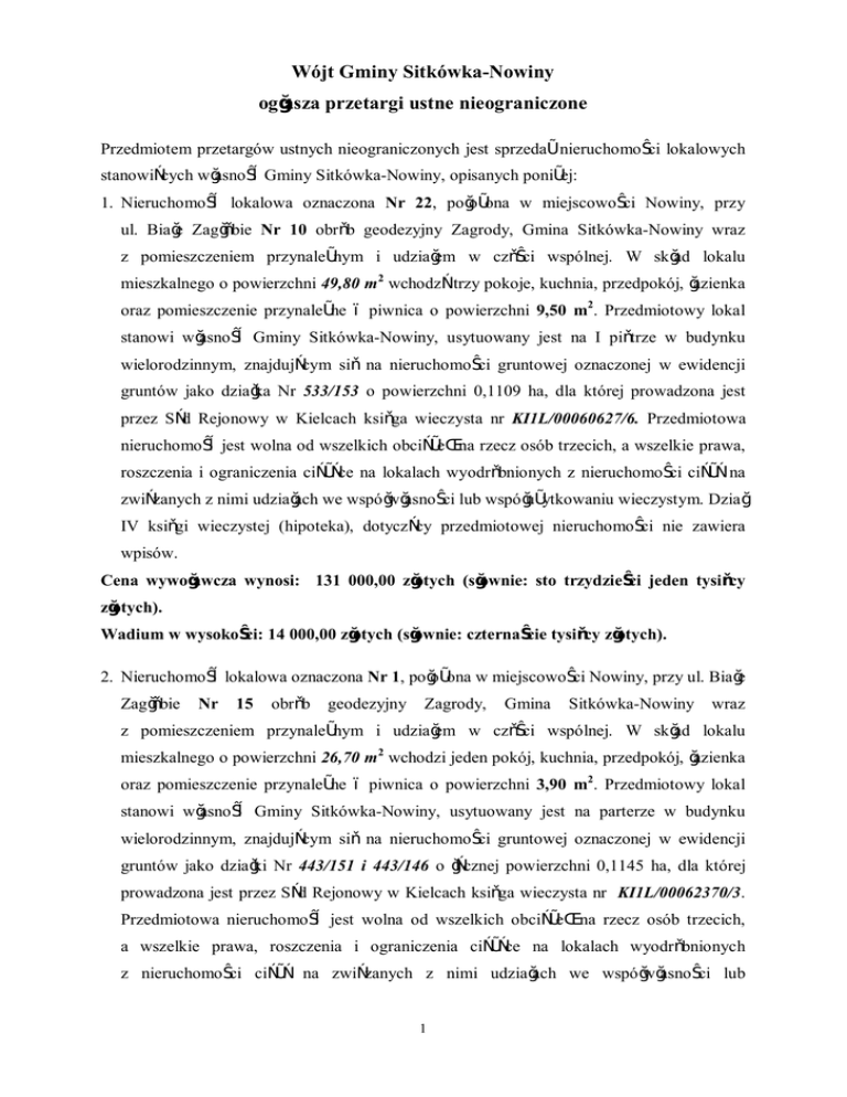 Wójt Gminy Sitkówka-Nowiny ogłasza przetargi ustne nieograniczone Przedmiotem przetargów ustnych nieograniczonych jest sprzedaż nieruchomości lokalowych stanowiących własność Gminy Sitkówka-Nowiny, opisanych poniżej: 1. Nieruchomość lokalowa oznaczona Nr 22, położona w miejscowości Nowiny, przy ul. Białe Zagłębie Nr 10 obręb geodezyjny Zagrody, Gmina Sitkówka-Nowiny wraz z pomieszczeniem przynależnym i udziałem w części wspólnej. W skład lokalu mieszkalnego o powierzchni 49,80 m2 wchodzą trzy pokoje, kuchnia, przedpokój, łazienka oraz pomieszczenie przynależne – piwnica o powierzchni 9,50 m2. Przedmiotowy lokal stanowi własność Gminy Sitkówka-Nowiny, usytuowany jest na I piętrze w budynku wielorodzinnym, znajdującym się na nieruchomości gruntowej oznaczonej w ewidencji gruntów jako działka Nr 533/153 o powierzchni 0,1109 ha, dla której prowadzona jest przez Sąd Rejonowy w Kielcach księga wieczysta nr KI1L/00060627/6. Przedmiotowa nieruchomość jest wolna od wszelkich obciążeń na rzecz osób trzecich, a wszelkie prawa, roszczenia i ograniczenia ciążące na lokalach wyodrębnionych z nieruchomości ciążą na związanych z nimi udziałach we współwłasności lub współużytkowaniu wieczystym. Dział IV księgi wieczystej (hipoteka), dotyczący przedmiotowej nieruchomości nie zawiera wpisów. Cena wywoławcza wynosi: 131 000,00 złotych (słownie: sto trzydzieści jeden tysięcy złotych). Wadium w wysokości: 14 000,00 złotych (słownie: czternaście tysięcy złotych). 2. Nieruchomość lokalowa oznaczona Nr 1, położona w miejscowości Nowiny, przy ul. Białe Zagłębie Nr 15 obręb geodezyjny Zagrody, Gmina Sitkówka-Nowiny wraz z pomieszczeniem przynależnym i udziałem w części wspólnej. W skład lokalu mieszkalnego o powierzchni 26,70 m2 wchodzi jeden pokój, kuchnia, przedpokój, łazienka oraz pomieszczenie przynależne – piwnica o powierzchni 3,90 m2. Przedmiotowy lokal stanowi własność Gminy Sitkówka-Nowiny, usytuowany jest na parterze w budynku wielorodzinnym, znajdującym się na nieruchomości gruntowej oznaczonej w ewidencji gruntów jako działki Nr 443/151 i 443/146 o łącznej powierzchni 0,1145 ha, dla której prowadzona jest przez Sąd Rejonowy w Kielcach księga wieczysta nr KI1L/00062370/3. Przedmiotowa nieruchomość jest wolna od wszelkich obciążeń na rzecz osób trzecich, a wszelkie prawa, roszczenia i ograniczenia ciążące na lokalach wyodrębnionych z nieruchomości ciążą na związanych z nimi udziałach we współwłasności lub 1 współużytkowaniu wieczystym. Dział IV księgi wieczystej (hipoteka), dotyczący przedmiotowej nieruchomości nie zawiera wpisów. Cena wywoławcza wynosi: 68.000,00 złotych (słownie: sześćdziesiąt osiem tysięcy złotych). Wadium w wysokości: 7 000,00 złotych (słownie: siedem tysięcy złotych). 3. Nieruchomość lokalowa oznaczona Nr 15, położona w miejscowości Nowiny, przy ul. Parkowa Nr 2 obręb geodezyjny Zagrody, Gmina Sitkówka-Nowiny wraz z pomieszczeniem przynależnym i udziałem w części wspólnej. W skład lokalu mieszkalnego o powierzchni 53,40 m2 wchodzą trzy pokoje, kuchnia, przedpokój, łazienka oraz pomieszczenie przynależne – piwnica o powierzchni 4,50 m2. Przedmiotowy lokal stanowi własność Gminy Sitkówka-Nowiny, usytuowany jest na III piętrze w budynku wielorodzinnym, znajdującym się na nieruchomości gruntowej oznaczonej w ewidencji gruntów jako działka Nr 533/157 o powierzchni 0,0518 ha, dla której prowadzona jest przez Sąd Rejonowy w Kielcach księga wieczysta nr KI1L/00065246/6. Przedmiotowa nieruchomość jest wolna od wszelkich obciążeń na rzecz osób trzecich, a wszelkie prawa, roszczenia i ograniczenia ciążące na lokalach wyodrębnionych z nieruchomości ciążą na związanych z nimi udziałach we współwłasności lub współużytkowaniu wieczystym. Dział IV księgi wieczystej (hipoteka), dotyczący przedmiotowej nieruchomości nie zawiera wpisów. Cena wywoławcza wynosi: 123.000,00 złotych (słownie: sto dwadzieścia trzy tysiące złotych). Wadium w wysokości: 13 000,00 złotych (słownie: trzynaście tysięcy złotych). Zgodnie z ustaleniami obowiązującego planu zagospodarowania przestrzennego Gminy Sitkówka-Nowiny wszystkie ww. nieruchomości położone są w terenach oznaczonych symbolem B.MW - przeznaczenie podstawowe: istniejąca zabudowa mieszkaniowa wielorodzinna niska (do 5 kondygnacji); przeznaczenie uzupełniające: usługi wolnostojące lub wbudowane nie zakłócające funkcji podstawowej terenu, tymczasowe obiekty usługowohandlowe, urządzenia budowlane, garaże, parkingi, dojścia, dojazdy, place zabaw dla dzieci, mała architektura, zieleń. Przetargi ustne nieograniczone zostaną przeprowadzone w siedzibie Urzędu Gminy Sitkówka-Nowiny (sala konferencyjna) 26-052 Nowiny, ul. Białe Zagłębie 25 w dniu 7 czerwca 2016 roku w następującej kolejności i godzinach: · 9.00 – 9.30 – nieruchomość lokalowa z pozycji 1 (ul. Białe Zagłębie 10/22), · 9.30 - 10.00 – nieruchomość lokalowa z pozycji 2 (ul. Białe Zagłębie 15/1), · 10.00 - 10.30 – nieruchomość lokalowa z pozycji 3 (ul. Parkowa 2/15). 2 Warunkiem przystąpienia do każdego z przetargów jest wpłacenie w pieniądzu wadium w wysokości określonej powyżej na konto Gminy Sitkówka-Nowiny Nr 82-8493-0004-00400429-2160-0006 do dnia 1 czerwca 2016 r., z dokładnym opisem przedmiotu przetargu, którego dotyczy oraz wpłacającego. Za termin wniesienia wadium uważa się dzień wpływu wadium na wskazane konto. W przypadku wpłacenia wadium w formie przelewu bankowego wpłata winna być dokonana odpowiednio wcześniej tak, aby w dniu 1 czerwca 2016 roku wadium znajdowało się na rachunku organizatora przetargu. Z uwagi, iż sprzedaży podlega kilka nieruchomości lokalowych, wpłata wadium w określonej wysokości uprawnia do licytacji tylko tej nieruchomości, na którą dokonano wpłaty. Uczestnic