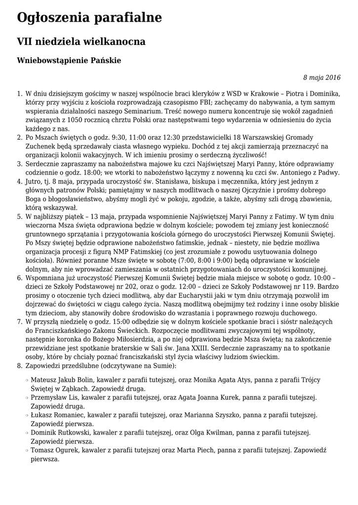 Ogłoszenia parafialne VII niedziela wielkanocna Wniebowstąpienie Pańskie 8 maja 2016 1. W dniu dzisiejszym gościmy w naszej wspólnocie braci kleryków z WSD w Krakowie – Piotra i Dominika, którzy przy wyjściu z kościoła rozprowadzają czasopismo FBI; zachęcamy do nabywania, a tym samym wspierania działalności naszego Seminarium. Treść nowego numeru koncentruje się wokół zagadnień związanych z 1050 rocznicą chrztu Polski oraz następstwami tego wydarzenia w odniesieniu do życia każdego z nas. 2. Po Mszach świętych o godz. 9:30, 11:00 oraz 12:30 przedstawicielki 18 Warszawskiej Gromady Zuchenek będą sprzedawały ciasta własnego wypieku. Dochód z tej akcji zamierzają przeznaczyć na organizacji kolonii wakacyjnych. W ich imieniu prosimy o serdeczną życzliwość! 3. Serdecznie zapraszamy na nabożeństwa majowe ku czci Najświętszej Maryi Panny, które odprawiamy codziennie o godz. 18:00; we wtorki to nabożeństwo łączymy z nowenną ku czci św. Antoniego z Padwy. 4. Jutro, tj. 8 maja, przypada uroczystość św. Stanisława, biskupa i męczennika, który jest jednym z głównych patronów Polski; pamiętajmy w naszych modlitwach o naszej Ojczyźnie i prośmy dobrego Boga o błogosławieństwo, abyśmy mogli żyć w pokoju, zgodzie, a także, abyśmy szli drogą zbawienia, którą wskazywał. 5. W najbliższy piątek – 13 maja, przypada wspomnienie Najświętszej Maryi Panny z Fatimy. W tym dniu wieczorna Msza święta odprawiona będzie w dolnym kościele; powodem tej zmiany jest konieczność gruntownego sprzątania i przygotowania kościoła górnego do uroczystości Pierwszej Komunii Świętej. Po Mszy świętej będzie odprawione nabożeństwo fatimskie, jednak – niestety, nie będzie możliwa organizacja procesji z figurą NMP Fatimskiej (co jest zrozumiałe z powodu usytuowania dolnego kościoła). Również poranne Msze święte w sobotę (7:00, 8:00 i 9:00) będą odprawiane w kościele dolnym, aby nie wprowadzać zamieszania w ostatnich przygotowaniach do uroczystości komunijnej. 6. Wspomniana już uroczystość Pierwszej Komunii Świętej będzie miała miejsce w sobotę o godz. 10:00 – dzieci ze Szkoły Podstawowej nr 202, oraz o godz. 12:00 – dzieci ze Szkoły Podstawowej nr 119. Bardzo prosimy o otoczenie tych dzieci modlitwą, aby dar Eucharystii jaki w tym dniu otrzymają pozwolił im dojrzewać do świętości w ciągu całego życia. Naszą modlitwą obejmijmy też rodziny i inne osoby bliskie tym dzieciom, aby stanowiły dobre środowisko do wzrastania i poprawnego rozwoju duchowego. 7. W przyszłą niedzielę o godz. 15:00 odbędzie się w dolnym kościele spotkanie braci i sióstr należących do Franciszkańskiego Zakonu Świeckich. Rozpoczęcie modlitwami zwyczajowymi tej wspólnoty, następnie koronka do Bożego Miłosierdzia, a po niej odprawiona będzie Msza święta; na zakończenie przewidziane jest spotkanie braterskie w Sali św. Jana XXIII. Serdecznie zapraszamy na to spotkanie osoby, które by chciały poznać franciszkański styl życia właściwy ludziom świeckim. 8. Zapowiedzi przedślubne (odczytywane na Sumie): ❍ ❍ ❍ ❍ ❍ Mateusz Jakub Bolin, kawaler z parafii tutejszej, oraz Monika Agata Atys, panna z parafii Trójcy Świętej w Ząbkach. Zapowiedź druga. Przemysław Lis, kawaler z parafii tutejszej, oraz Agata Joanna Kurek, panna z parafii tutejszej. Zapowiedź druga. Łukasz Romaniec, kawaler z parafii tutejszej, oraz Marianna Szyszko, panna z parafii tutejszej. Zapowiedź pierwsza. Dominik Rutkowski, kawaler z parafii tutejszej, oraz Olga Kwilman, panna z parafii tutejszej. Zapowiedź pierwsza. Tomasz Ogurek, kawaler z parafii tutejszej oraz Marta Piech, panna z parafii tutejszej. Zapowiedź pierwsza.