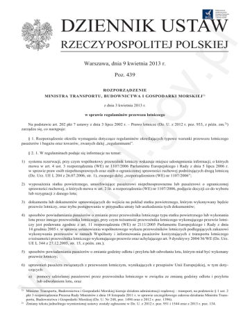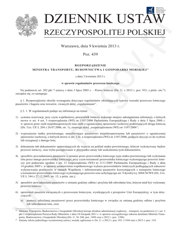 Elektronicznie podpisany przez Grzegorz Paczowski Data: 2013.04.09 13:02:58 +02'00' DZIENNIK USTAW v.p l RZECZYPOSPOLITEJ POLSKIEJ Warszawa, dnia 9 kwietnia 2013 r. Poz. 439 ROZPORZĄDZENIE MINISTRA TRANSPORTU, BUDOWNICTWA I GOSPODARKI MORSKIEJ 1) .go z dnia 3 kwietnia 2013 r. w sprawie regulaminów przewozu lotniczego Na podstawie art. 202 pkt 7 ustawy z dnia 3 lipca 2002 r. – Prawo lotnicze (Dz. U. z 2012 r. poz. 933, z późn. zm.2)) zarządza się, co następuje: § 1. Rozporządzenie określa wymagania dotyczące regulaminów określających typowe warunki przewozu lotniczego pasażerów i bagażu oraz towarów, zwanych dalej „regulaminami”. § 2. 1. W regulaminach podaje się informacje na temat: w. rcl 1) systemu rezerwacji, przy czym wspólnotowy przewoźnik lotniczy wskazuje miejsce udostępnienia informacji, o których mowa w art. 4 ust. 3 rozporządzenia (WE) nr 1107/2006 Parlamentu Europejskiego i Rady z dnia 5 lipca 2006 r. w sprawie praw osób niepełnosprawnych oraz osób o ograniczonej sprawności ruchowej podróżujących drogą lotniczą (Dz. Urz. UE L 204 z 26.07.2006, str. 1), zwanego dalej „rozporządzeniem (WE) nr 1107/2006”; 2) wyposażenia statku powietrznego, umożliwiające pasażerowi niepełnosprawnemu lub pasażerowi o ograniczonej sprawności ruchowej, o których mowa w art. 2 lit. a rozporządzenia (WE) nr 1107/2006, podjęcie decyzji co do wyboru lub rezygnacji z danego lotu; 3) dokumentu lub dokumentów uprawniających do wejścia na pokład statku powietrznego, którym wykonywany będzie przewóz lotniczy, oraz trybu postępowania w przypadku utraty lub uszkodzenia tych dokumentów; ww 4) sposobów powiadamiania pasażerów o zmianie przez przewoźnika lotniczego typu statku powietrznego lub wykonania lotu przez innego przewoźnika lotniczego, przy czym tożsamość przewoźnika lotniczego wykonującego przewóz lotniczy jest podawana zgodnie z art. 11 rozporządzenia (WE) nr 2111/2005 Parlamentu Europejskiego i Rady z dnia 14 grudnia 2005 r. w sprawie ustanowienia wspólnotowego wykazu przewoźników lotniczych podlegających zakazowi wykonywania przewozów w ramach Wspólnoty i informowania pasażerów korzystających z transportu lotniczego o tożsamości przewoźnika lotniczego wykonującego przewóz oraz uchylającego art. 9 dyrektywy 2004/36/WE (Dz. Urz. UE L 344 z 27.12.2005, str. 15, z późn. zm.); 5) sposobów powiadamiania pasażerów o zmianie godziny odlotu i przylotu lub odwołaniu lotu, którym miał być wykonany przewóz lotniczy; 6) uprawnień pasażera związanych z przewozem lotniczym, wynikających z przepisów Unii Europejskiej, w tym dotyczących: a) pomocy udzielanej pasażerowi przez przewoźnika lotniczego w związku ze zmianą godziny odlotu i przylotu lub odwołaniem lotu, oraz Minister Transportu, Budownictwa i Gospodarki Morskiej kieruje działem administracji rządowej – transport, na podstawie § 1 ust. 2 pkt 3 rozporządzenia Prezesa Rady Ministrów z dnia 18 listopada 2011 r. w sprawie szczegółowego zakresu działania Ministra Transportu, Budownictwa i Gospodarki Morskiej (Dz. U. Nr 248, poz. 1494 oraz z 2012 r. poz. 1396). 2) Zmiany tekstu jednolitego wymienionej ustawy zostały ogłoszone w Dz. U. z 2012 r. poz. 951 i 1544 oraz z 2013 r. poz. 134. 1) Dziennik Ustaw –2– Poz. 439 b) uprawnień pasażera w przypadku niewykonania umowy przewozu lotniczego z przyczyn leżących po stronie przewoźnika lotniczego, w szczególności dotyczących zwrotu kosztów zakupu biletu v.p l – z uwzględnieniem przepisów rozporządzenia (WE) nr 261/2004 Parlamentu Europejskiego i Rady z dnia 11 lutego 2004 r. ustanawiającego wspólne zasady odszkodowania i pomocy dla pasażerów w przypadku odmowy przyjęcia na pokład albo odwołania lub dużego opóźnienia lotów, uchylającego rozporządzenie (EWG) nr 295/91 (Dz. Urz. UE L 46 z 17.02.2004, str. 1, z późn. zm.; Dz. Urz. UE Polskie wydanie specjalne, rozdz. 7, t. 8, str. 10, z późn. zm.); 7) obowiązku przewoźnika lotniczego dotyczącego przekazywania uprawnionym organom państwowym danych osobowych pasażerów, jeżeli żądanie ich przekazania następuje na podstawie przepisów prawa; 8) wymagań i procedur dotyczących odprawy pasażerskiej; 9) wymagań i procedur dotyczących odprawy bagażu pasażera, w tym bagażu wolnego od opłat; 10) warunków dokonywania, potwierdzania lub anulowania rezerwacji; 12) dodatkowych opłat lub ulg; .go 11) obowiązku przewoźnika lotniczego dotyczącego wskazywania ostatecznej ceny zgodnie z art. 23 rozporządzenia Parlamentu Europejskiego i Rady (WE) nr 1008/2008 z dnia 24 września 2008 r. w sprawie wspólnych zasad wykonywania przewozów lotniczych na terenie Wspólnoty (Dz. Urz. UE L 293 z 31.10.2008, str. 3); 13) przepisów o charakterze porządkowym dotyczących sposobu postępowania przewoźnika lotniczego wobec pasażerów, których zachowanie zagraża bezpieczeństwu lub narusza porządek na pokładzie statku powietrznego, oraz o uprawnieniach przewoźnika lotniczego do dochodzenia roszczeń wobec pasażera, który wyrządził szkodę innemu pasażerowi lub przewoźnikowi lotniczemu; 14) wymagań i procedur dotyczących odbioru bagażu; w. rcl 15) konsekwencji dla pasażera związanych z naruszaniem przez niego wymagań i procedur dotyczących odprawy pasażerskiej; 16) odpowiedzialności przewoźnika lotniczego oraz trybu wszczęcia postępowania w sprawach dotyczących odszkodowań z tytułu śmierci, uszczerbku na zdrowiu oraz utraty lub uszkodzenia bagażu pasażera; 17) warunków unieważnienia, odstąpienia oraz wypowiedzenia zawartej umowy na przewóz lotniczy; 18) świadczenia przez przewoźnika lotniczego dodatkowych usług; 19) listy przedmiotów zabronionych do przewozu lotniczego, w tym listy towarów niebezpiecznych, o których mowa w Załączniku 18 do Konwencji o międzynarodowym lotnictwie cywilnym, podpisanej w Chicago dnia 7 grudnia 1944 r. (Dz. U. z 1959 r. Nr 35, poz. 212 i 214, z późn. zm