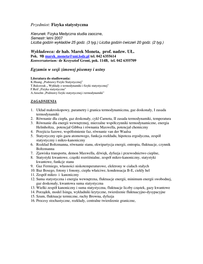 Przedmiot: Fizyka statystyczna Wykładowca: dr hab. Marek Moneta