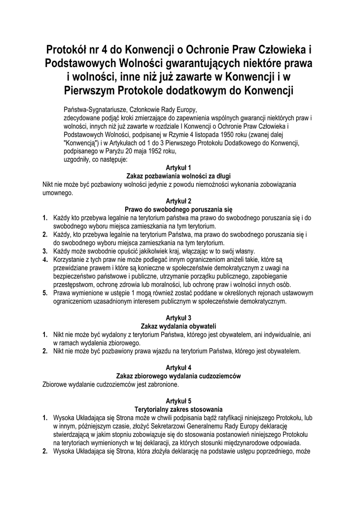 Protokół nr 4 do Konwencji o Ochronie Praw Człowieka i Podstawowych Wolności gwarantujących niektóre prawa i wolności, inne niż już zawarte w Konwencji i w Pierwszym Protokole dodatkowym do Konwencji Państwa-Sygnatariusze, Członkowie Rady Europy, zdecydowane podjąć kroki zmierzające do zapewnienia wspólnych gwarancji niektórych praw i wolności, innych niż już zawarte w rozdziale I Konwencji o Ochronie Praw Człowieka i Podstawowych Wolności, podpisanej w Rzymie 4 listopada 1950 roku (zwanej dalej "Konwencją") i w Artykułach od 1 do 3 Pierwszego Protokołu Dodatkowego do Konwencji, podpisanego w Paryżu 20 maja 1952 roku, uzgodniły, co następuje: Artykuł 1 Zakaz pozbawiania wolności za długi Nikt nie może być pozbawiony wolności jedynie z powodu niemożności wykonania zobowiązania umownego. Artykuł 2 Prawo do swobodnego poruszania się 1. Każdy kto przebywa legalnie na terytorium państwa ma prawo do swobodnego poruszania się i do swobodnego wyboru miejsca zamieszkania na tym terytorium. 2. Każdy, kto przebywa legalnie na terytorium Państwa, ma prawo do swobodnego poruszania się i do swobodnego wyboru miejsca zamieszkania na tym terytorium. 3. Każdy może swobodnie opuścić jakikolwiek kraj, włączając w to swój własny. 4. Korzystanie z tych praw nie może podlegać innym ograniczeniom aniżeli takie, które są przewidziane prawem i które są konieczne w społeczeństwie demokratycznym z uwagi na bezpieczeństwo państwowe i publiczne, utrzymanie porządku publicznego, zapobieganie przestępstwom, ochronę zdrowia lub moralności, lub ochronę praw i wolności innych osób. 5. Prawa wymienione w ustępie 1 mogą również zostać poddane w określonych rejonach ustawowym ograniczeniom uzasadnionym interesem publicznym w społeczeństwie demokratycznym. Artykuł 3 Zakaz wydalania obywateli 1. Nikt nie może być wydalony z terytorium Państwa, którego jest obywatelem, ani indywidualnie, ani w ramach wydalenia zbiorowego. 2. Nikt nie może być pozbawiony prawa wjazdu na terytorium Państwa, którego jest obywatelem. Artykuł 4 Zakaz zbiorowego wydalania cudzoziemców Zbiorowe wydalanie cudzoziemców jest zabronione. Artykuł 5 Terytorialny zakres stosowania 1. Wysoka Układająca się Strona może w chwili podpisania bądź ratyfikacji niniejszego Protokołu, lub w innym, późniejszym czasie, złożyć Sekretarzowi Generalnemu Rady Europy deklarację stwierdzającą w jakim stopniu zobowiązuje się do stosowania postanowień niniejszego Protokołu na terytoriach wymienionych w tej deklaracji, za których stosunki międzynarodowe odpowiada. 2. Wysoka Układająca się Strona, która złożyła deklarację na podstawie ustępu poprzedniego, może w każdym czasie złożyć następną deklarację zmieniającą treść uprzedniej lub wyłączającą stosowanie postanowień niniejszego Protokołu na jakimkolwiek terytorium. 3. Deklarację złożoną na podstawie niniejszego artykułu uznaje się za zgodną z ustępem 1 artykułu 56 Konwencji. 4. Terytorium Państwa, na którym stosuje się niniejszy Protokół na podstawie ratyfikacji bądź przyjęcia przez to Państwo, oraz każde terytorium, na którym stosuje się niniejszy Protokół na podstawie deklaracji złożonej przez to Państwo zgodnie z niniejszym artykułem, uznaje się za terytoria odrębne w świetle odniesień do terytorium Państwa ujętych w artykułach 2 i 3. 5. Państwo, które złożyło deklarację na podstawie ustępu 1 lub 2 niniejszego artykułu, może w każdym późniejszym czasie uznać w odniesieniu do jednego lub wielu terytoriów wymienionych w tej deklaracji kompetencję Trybunału do przyjmowania skarg od osób, organizacji pozarządowych lub grup, zgodnie z artykułem 34 Konwencji w stosunku do wszystkich lub niektórych artykułów od 1 do 4 niniejszego Protokołu. Artykuł 6 Stosunek do Konwencji Wysokie Układające się Strony uznają postanowienia artykułów od 1 do 5 niniejszego Protokołu za dodatkowe artykuły Konwencji, a wszystkie przepisy Konwencji stosuje się odpowiednio. Artykuł 7 Podpisanie i ratyfikacja 1. Niniejszy Protokół jest otwarty do podpisu dla Państw-Członków Rady Europy, które są sygnatariuszami Konwencji i podlega ratyfikacji w tym samym czasie co Konwencja lub po jej ratyfikacji. Protokół wchodzi w życie po złożeniu pięciu dokumentów ratyfikacyjnych. W stosunku do sygnatariusza, który dokona ratyfikacji w terminie późniejszym, Protokół wchodzi w życie w dniu złożenia dokumentów ratyfikacyjnych. 2. Dokumenty ratyfikacyjne składa się Sekretarzowi Generalnemu Rady Europy, który notyfikuje Państwom-Członkom nazwy państw, które dokonały ratyfikacji. Na dowód czego niżej podpisani, będąc do tego należycie upoważnieni, podpisali niniejszy Protokół. Sporządzono w Strasburgu, dnia 16 września 1963 roku w jednym egzemplarzu, w językach angielskim i francuskim, przy czym oba teksty są jednakowo autentyczne; oryginał zostanie złożony w archiwach Rady Europy. Sekretarz Generalny przekaże uwierzytelnione odpisy każdemu z Państw-Sygnatariuszy.