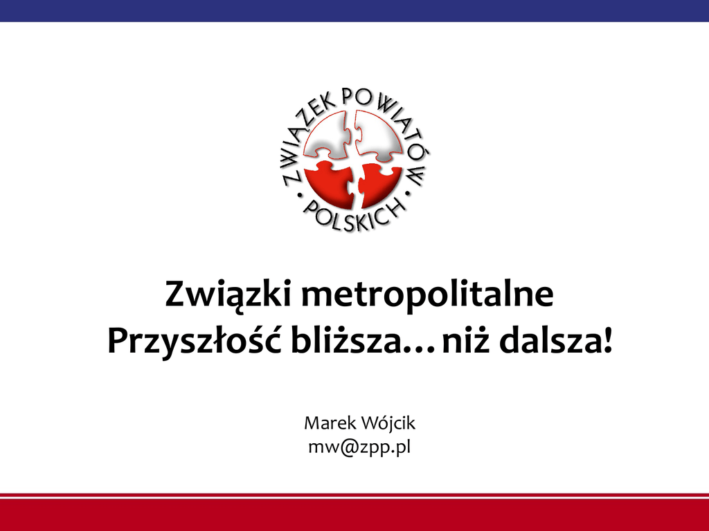 Związki metropolitalne Przyszłość bliższa…niż dalsza! Marek Wójcik [email protected] Podstawowe elementy ustawy o związkach metropolitalnych Ustrój Finanse Zadania Organy Zrzeszenie JST •Związek metropolitalny jest zrzeszeniem jednostek samorządu terytorialnego położonych w danym obszarze metropolitalnym Gminy i powiaty •W skład związku metropolitalnego wchodzą: gminy położone w granicach obszaru metropolitalnego oraz powiaty, na obszarze których leży co najmniej jedna gmina położona w granicach obszaru metropolitalnego Statut •Związek metropolitalny a osobowość prawną, wykonuje zadania publiczne w imieniu własnym i na własną odpowiedzialność; •O ustroju związku metropolitalnego stanowi jego statut (projekt statutu i jego zmiany podlegają uzgodnieniu z Prezesem Rady Ministrów na wniosek MSWiA) Obszar metropolitalny – spójna pod względem przestrzennym strefa oddziaływania miasta będącego siedzibą wojewody lub sejmiku województwa, chrakteryzująca się istnieniem silnych powiązań funkcjonalnych oraz zaawansowaniem procesów urbanizacyjnych, zamieszkała przez co najmniej 500 000 mieszkańców. •Obszar metropolitalny wynika z koncepcji przestrzennego zagospodarowania kraju oraz planu zagospodarowania przestrzennego województwa; •Istnieją powiązania funkcjonalne oraz zaawansowane są procesy urbanizacyjne; •Charakteryzuje się jednorodnością układu osadniczego •i przestrzennego, uwzględniając więzi społeczne, gospodarcze i kulturowe; Harmonogram tworzenia związku metropolitalnego 1 stycznia 2016r. Wejście w życie ustawy o związkach metropolitalnych Wydanie Rozporządzenia Rady Ministrów w sprawie trybu postępowania w sprawie składania wniosku o utworzenie związku metropolitalnego Wniosek rady gminy położonej w granicach obszaru metropolitalnego (do wniosku dołącza się uzasadnienie oraz niezbędne dokumenty, w tym mapy) Związek metropolitalny jest tworzony z dniem 1 lipca, (rozpoczęcie działalności i dochody z dodatkowego PIT od 1 stycznia kolejnego roku) Inicjatywa Rady Ministrów (rola MSWiA) Wydanie Rozporządzenia Rady Ministrów w sprawie utworzenia związku metropolitalnego (ustalenie granic oraz nazwy związku metropolitalnego) Do 30 kwietnia 2016r. Warunki wydania rozporządzenia w sprawie utworzenia związku metropolitalnego Zaciągniecie opinii Brak aktywności Pozytywna opinia •Rad gmin położonych w granicach obszaru metropolitalnego poprzedzonych przeprowadzeniem konsultacji z mieszkańcami; •2Rad powiatów, na obszarze których leży co najmniej jedna gmina położona w granicach obszaru metropolitalnego; •Sejmiku województwa; •Wojewody •W przypadku niewyrażenia w/w opinii, w terminie 3 miesięcy od dnia otrzymania wystąpienia o opinię, wymóg zasięgnięcia opinii uznaje się za spełniony; •W przypadku nieprzeprowadzenia konsultacji mieszkańcami, w terminie 3 miesięcy od dnia otrzymania wystąpienia o przeprowadzenie konsultacji, wymóg przeprowadzenia konsultacji uznaje się za spełniony; •Rad co najmniej 70% miast na prawach powiatu położonych w granicach obszaru metropolitalnego; • Rad co najmniej 70% gmin niemających statusu miasta na prawach powiatu położonych w granicach obszaru metropolitalnego; •Rad co najmniej 50% powiatów, na obszarze których leży co najmniej jedna gmina położona w granicach obszaru metropolitalnego; Ważna rola pełnomocnika • Prezes Rady Ministrów (wojewoda, MSWiA) wyznacza pełnomocnika do spraw utworzenia związku metropolitalnego spośród pracowników wojewody; • Pełnomocnik wykonuje zadania i kompetencje organów związku metropolitalnego; (zgromadzenie - do dnia jego pierwszej sesji; zarząd - do dnia jego wyboru) • Obsługę pełnomocnika zapewnia urząd wojewódzki; • Zadania pełnomocnika: przygotowanie organizacyjne i prawne związku do wykonywania zadań publicznych; (w szczególności: opracowanie projektu statutu związku oraz opracowanie projektu uchwały pierwszego budżetu) • Pełnomocnik może zawierać porozumienia z JST oraz organami administracji rządowej; Rola wojewody • Wojewoda przekazuje związkowi metropolitalnemu mienie nieruchome Skarbu Państwa, z przeznaczeniem na siedzibę organów związku metropolitalnego (na podstawie decyzji administracyjnej wojewody wydanej z urzędu); • Nabycie mienia jest nieodpłatne i następuje z dniem, • w którym decyzja o jego przekazaniu stała się ostateczna; • Wojewoda może udzielić dotacji na działania związane z utworzeniem związku metropolitalnego; Zakres działania i zadania związku metropolitalnego Związek metropolitalny wykonuje zadania publiczne w zakresie: • 1) kształtowania ładu przestrzennego; • 2) rozwoju obszaru związku; • 3) publicznego transportu zbiorowego na obszarze związku; • 4) współdziałania w ustalaniu przebiegu dróg krajowych i wojewódzkich na obszarze związku; • 5) promocji obszaru metropolitalnego. Nadzór nad działalnością związku metropolitalnego sprawują: Prezes Rady Ministrów oraz wojewoda, a w zakresie spraw finansowych – regionalna izba obrachunkowa; Związki metropolitalne mogą więcej • Na podstawie porozumienia zawartego z jednostką samorządu terytorialnego związek metropolitalny może realizować zadania publiczne należące do zakresu działania gminy, powiatu lub samorządu województwa lub koordynować realizację tych zadań; • Na podstawie porozumienia zawartego z organem administracji rządowej związek metropolitalny może realizować zadania publiczne należące do zakresu działania administracji rządowej; Formy działania związku metropolitalnego • Związek metropolitalny może: tworzyć jednostki organizacyjne; zawierać porozumienia z JST oraz organami administracji rządowej; prowadzić działalność gospodarczą niewykraczającą poza obszar zadań o charakterze użyteczności publicznej; • Związek metropolitalny może tworzyć stowarzyszenia z