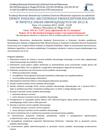 Fundacja Rozwoju Demokracji Lokalnej Centrum Mazowsze zaprasza na szkolenie: ZWROT PODATKU AKCYZOWEGO PRODUCENTOM ROLNYM W ŚWIETLE ZMIAN OBOWIĄZUJĄCYCH OD 2012 R. Data: 14 września 2012, 10:00 - 15:00 Miejsce: Warszawa, ul. Długa 23/25 Cena: 299 zł + VAT* przy zgłoszeniu do 31 sierpnia! Rabat 10 % dla każdej kolejnej osoby z tej samej Instytucji! *dla opłacających szkolenie co najmniej w 70% ze środków publicznych cena zwolniona z VAT Prowadzący: Ekonomista, absolwentka Akademii Ekonomicznej w Krakowie, doradca podatkowy. Doświadczenie zdobyte w Regionalnej Izbie Obrachunkowej w Krakowie w Wydziale Kontroli Gospodarki Finansowej oraz Urzędzie Miasta Krakowa w Wydziale Podatków i Opłat na stanowiskach kierowniczych. Wydawca tygodnika o tematyce podatkowej. Prowadząca szkolenia z zakresu prawa podatkowego oraz rachunkowości od 15 lat. Program szkolenia: 1. Planowane zmiany do ustawy o zwrocie podatku akcyzowego zawartego w cenie oleju napędowego wykorzystywanego do produkcji rolnej. 2. Omówienie zasad poboru opłaty skarbowej za potwierdzenie przez pracownika urzędu gminy lub miasta kopii faktur VAT za zgodność z oryginałem stanowiących załącznik do wniosku. 3. Podmioty uprawnione do otrzymania zwrotu podatku akcyzowego: • definicja producenta rolnego, • szczegółowe rozstrzygnięcia dotyczące posiadacza zależnego oraz współposiadacza, • zwrot podatku akcyzowego małżonkowi. 4. Obowiązkowe elementy faktury stwierdzającej dokonanie sprzedaży. 5. Zasada ustalania kwoty zwrotu podatku akcyzowego. 6. Zasady ustalania rocznego limitu zwrotu podatku akcyzowego obowiązujące od 1 stycznia 2012 r. Zapis w ewidencji gruntów i budynków według stanu na dzień 1 lutego danego roku. 7. Decyzja w sprawie zwrotu podatku akcyzowego. • elementy decyzji o zwrocie, • wzory decyzji w sprawie zwrotu podatku akcyzowego. 8. Postępowanie w przypadku jednej faktury VAT dokumentującej zakup paliwa producenta rolnego posiadającego użytki rolne w kilku gminach. 9. Decyzja w sprawie zwrotu podatku akcyzowego. • elementy decyzji o zwrocie, termin wydania, • wzory decyzji w sprawie zwrotu podatku akcyzowego. 10. Zwrot nienależnie lub w nadmiernej wysokości otrzymanej kwoty podatku. 11. Zastosowanie przepisów Ordynacji podatkowej, ustawy o postępowaniu egzekucyjnym w administracji i kpa w realizacji zadania. 12. Szczegółowe omówienie wyjaśnień Ministerstwa Rolnictwa i Rozwoju Wsi w sprawach zwrotu podatku akcyzowego. 13. Orzecznictwo sądów administracyjnych w sprawach zwrotu podatku akcyzowego producentom rolnym. ZGŁOSZENIE ZWROT PODATKU AKCYZOWEGO PRODUCENTOM ROLNYM W ŚWIETLE ZMIAN OBOWIĄZUJĄCYCH OD 2012 R. Data: 14 września 2012, 10:00 - 15:00 Miejsce: Warszawa, ul. Długa 23/25 Cena: 299 zł + VAT* przy zgłoszeniu do 31 sierpnia! Rabat 10 % dla każdej kolejnej osoby z tej samej Instytucji! *dla opłacających szkolenie co najmniej w 70% ze środków publicznych cena zwolniona z VAT Instytucja: ............................................................................................................................. Adres: ................................................................................................................................... NIP: ...................................................................................................................................... L.p. Imię i nazwisko Wydział tel. e-mail 1. .......................................................................................................................................... 2. .......................................................................................................................................... 3. .......................................................................................................................................... ........................................................... podpis i pieczątka osoby delegującej Zgłoszenie na szkolenie Zgłoszenia prosimy przesyłać do 7 września 2012 r. faxem pod nr (22) 351 93 10 lub e-mailem na adres [email protected] lub wybrać opcje zapisu przez stronę www.frdl.mazowsze.pl Przy zgłoszeniu w ramach Forów prosimy o wpisanie w uwagach: „Zgłoszenie w ramach Forum (nazwa Forum)”. Ewentualną rezygnację ze szkolenia można zgłosić najpóźniej na dwa dni robocze przed szkoleniem. W przypadku niewykorzystania zgłoszonego uczestnictwa - Urząd będzie zobowiązany do finansowania 60% odpłatności za uczestnictwo i materiały. FRDL zastrzega sobie prawo odwołania szkolenia. Cena: 299 zł + VAT* przy zgłoszeniu do 31 sierpnia! Cena po 31 sierpnia to 350 zł+ VAT*. *dla opłacających szkolenie co najmniej w 70% ze środków publicznych cena zwolniona z VAT Rabat 10 % dla każdej kolejnej osoby z tej samej Instytucji! W cenie materiały szkoleniowe, zaświadczenie, lunch oraz przerwy kawowe. Płatność przelewem, na podstawie faktury wystawionej w dniu szkolenia. Miejsce szkolenia: Centrum Warszawy, ul. Długa 23/25, sala Konferencyjna FRDL, III piętro. Dojazd metrem do stacji Ratusz Arsenał