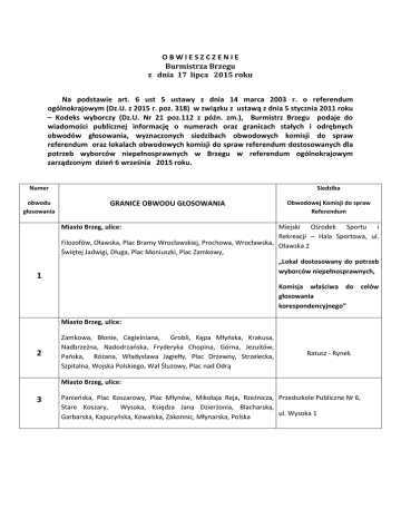 OBWIESZCZENIE Burmistrza Brzegu z dnia 17 lipca 2015 roku Na podstawie art. 6 ust 5 ustawy z dnia 14 marca 2003 r. o referendum ogólnokrajowym (Dz.U. z 2015 r. poz. 318) w związku z ustawą z dnia 5 stycznia 2011 roku – Kodeks wyborczy (Dz.U. Nr 21 poz.112 z późn. zm.), Burmistrz Brzegu podaje do wiadomości publicznej informację o numerach oraz granicach stałych i odrębnych obwodów głosowania, wyznaczonych siedzibach obwodowych komisji do spraw referendum oraz lokalach obwodowych komisji do spraw referendum dostosowanych dla potrzeb wyborców niepełnosprawnych w Brzegu w referendum ogólnokrajowym zarządzonym dzieo 6 września 2015 roku. Numer obwodu głosowania Siedziba GRANICE OBWODU GŁOSOWANIA Obwodowej Komisji do spraw Referendum Miejski Ośrodek Sportu i Rekreacji – Hala Sportowa, ul. Filozofów, Oławska, Plac Bramy Wrocławskiej, Prochowa, Wrocławska, Oławska 2 Świętej Jadwigi, Długa, Plac Moniuszki, Plac Zamkowy, „Lokal dostosowany do potrzeb wyborców niepełnosprawnych, Miasto Brzeg, ulice: 1 Komisja właściwa do celów głosowania korespondencyjnego” Miasto Brzeg, ulice: 2 Zamkowa, Błonie, Cegielniana, Grobli, Kępa Młyoska, Krakusa, Nadbrzeżna, Nadodrzaoska, Fryderyka Chopina, Górna, Jezuitów, Paoska, Różana, Władysława Jagiełły, Plac Drzewny, Strzelecka, Szpitalna, Wojska Polskiego, Wał Śluzowy, Plac nad Odrą Ratusz - Rynek Miasto Brzeg, ulice: 3 Panieoska, Plac Koszarowy, Plac Młynów, Mikołaja Reja, Rzeźnicza, Przedszkole Publiczne Nr 6, Stare Koszary, Wysoka, Księdza Jana Dzierżonia, Blacharska, ul. Wysoka 1 Garbarska, Kapucyoska, Kowalska, Zakonnic, Młynarska, Polska Miasto Brzeg, ulice: Brzeskie Centrum Kultury, ul. Mleczna 2 Bolesława Chrobrego, Emilii Plater, Jabłkowa, Kościelna, Lekarska, Mleczna, 3 Maja, Plac Kościelny, Rynek, Staromiejska, „Lokal dostosowany do potrzeb Sukiennice, wyborców niepełnosprawnych, 4 Komisja właściwa do celów głosowania korespondencyjnego” Miasto Brzeg, ulice: 5 Publiczna Szkoła Podstawowa nr 3, ul. Kamienna 2 Księcia Jerzego II Piasta, Ofiar Katynia z wyłączeniem nr 24a, 24b, 24c, Kamienna, Zbigniewa Herberta, Nowy Rynek, Sergiusza „Lokal dostosowany do potrzeb Mossora, Powstaoców Śląskich, wyborców niepełnosprawnych, Komisja właściwa do celów głosowania korespondencyjnego” 6 Miasto Brzeg, ulice: Zespół Szkół Budowlanych, Adama Mickiewicza, Rybacka, Franciszka Krzyszowica, ul. Kamienna 3 Miasto Brzeg, ulice: Publiczna Szkoła Podstawowa nr 3, ul. Kamienna 2 Szkolna, „Lokal dostosowany do potrzeb wyborców niepełnosprawnych 7 Komisja właściwa do celów głosowania korespondencyjnego” Miasto Brzeg, ulice: 8 Pierwszej Brygady, Chorążych, Saperska, Generała Władysława Przedszkole Publiczne nr 5, Sikorskiego, Ziemi Tarnowskiej, Kotlarska, Rzemieślnicza, ul. Boh. Monte Cassino 1 Kombatantów, Polna, Kruszyoska, Nysaoska, Fabryczna, Wita Stwosza Miasto Brzeg, ulice: 9 Władysława Łokietka, Bohaterów Monte Cassino, Piwowarska, Ofiar Publiczne Gimnazjum nr 3, ul. Katynia 24a, 24b, 24c Boh. Monte Cassino 14 10 11 Miasto Brzeg, ulice: Przedszkole Publiczne Nr 10, Jana Brzechwy, Janiny Porazioskiej, Juliusza Słowackiego, Kornela Makuszyoskiego ul. Ks. Makarskiego 5 Miasto Brzeg, ulice: Zespół Szkół nr 1 z Oddziałami Sportowymi, Księdza Makarskiego , Gustawa Morcinka, Poprzeczna, Działkowa, ul. Poprzeczna 1 Miasto Brzeg, ulice: 12 Klub Spółdzielni Mieszkaniowej Ciepłownicza, Elektryczna, Czesława Janczarskiego, Mikołaja „ZGODA” , Kopernika, Janusza Korczaka, Karola Szymanowskiego, Składowa, Jana ul. Brzechwy 3 Marcina Szancera, Starobrzeska Miasto Brzeg, ulice: 13 Bohaterów Westerplatte, Roweckiego Miasto Brzeg, ulice: 14 Majora Sucharskiego, Generała Grota- Klub Spółdzielni Mieszkaniowej „SAWA”, ul. Chocimska 7 Miejski Ośrodek Sportu i Rekreacji – Stadion Miejski, Cisowa, Aleksandra Fredry, Jaśminowa, Jodłowa, Kasztanowa, Jana ul. Sportowa 1 Kilioskiego, Marii Konopnickiej, Lipowa, Janusza Kusocioskiego, „Lokal dostosowany do potrzeb Sportowa, Modrzewiowa, Platanowa, Topolowa, Gabrieli Zapolskiej, wyborców niepełnosprawnych, Jana Kochanowskiego, Komisja właściwa do celów głosowania korespondencyjnego” Miasto Brzeg, ulice: 15 Zespół Szkół Nr 2 z Oddziałami Integracyjnymi, Cicha, Dębowa, Wojciecha Drzymały, Władysława Karłowicza, Krzywa, ul. Lompy 1 Kwiatowa, Liliowa, Józefa Lompy, Orla, Partyzantów, Pomorska, Słoneczna, Tęczowa, Świętego Wojciecha, Stanisława Wyspiaoskiego, Zielona, Lwowska, Wileoska, Małujowicka, Mały Rynek, Malinowa, Agrestowa, Czereśniowa, Jagodowa, Poziomkowa, Śliwkowa, Wiśniowa Miasto Brzeg, ulice: Zespół Szkół Zawodowych nr 1, ul. Słowiaoska 18 Słowiaoska, Kardynała Wyszyoskiego, Marszałka Piłsudskiego „Lokal dostosowany do potrzeb wyborców niepełnosprawnych, 16 Komisja właściwa do celów głosowania korespondencyjnego” Miasto Brzeg, ulice: 17 Dzienny Dom Pomocy Społecznej, ul. Piastowska 29 Kolejowa, Piastowska, Plac Dworcowy, Spacerowa, Towarowa, Trzech Kotwic, Miasto Brzeg, ulice: 18 Stefana Żeromskiego, Tadeusza Kościuszki, 1 Maja, Ptasia, Gaj, Plac Henryka Dąbrowskiego, Górnośląska, Gdaoska, Poznaoska, Toruoska, II Liceum Ogólnokształcące, Katowicka, Grudziądzka, Władysława Broniewskiego, Ostapa ul. 1 Maja 7 Dłuskiego, Jakuba Kani, Wojciecha Korfantego, Cypriana Kamila Norwida, Andrzeja Struga, Juliana Tuwima, Kazimierza Przerwy Tetmajera, Marii Dąbrowskiej, Elizy Orzeszkowej, Władysława Reymonta, Bolesława Prusa Miasto Brzeg, ulice: 19 Publiczna Szkoła Podstawowa nr 5, ul. Robotnicza 22 Wolności, Legionistów, Grunwaldzka, Lechicka, Robotnicza, Krótka, „Lokal dostosowany do potrzeb wyborców niepełnosprawnych, Hetmana Tarnowskiego, Planty, Komisja właściwa do celów głosowania korespondencyjnego” Miasto Brzeg, ulice: 20 Zespół Szkół nr 1 z Oddziałami Sportowymi, ul. Poprzeczna 1 Króla Jana III, Marysieoki, Jakuba