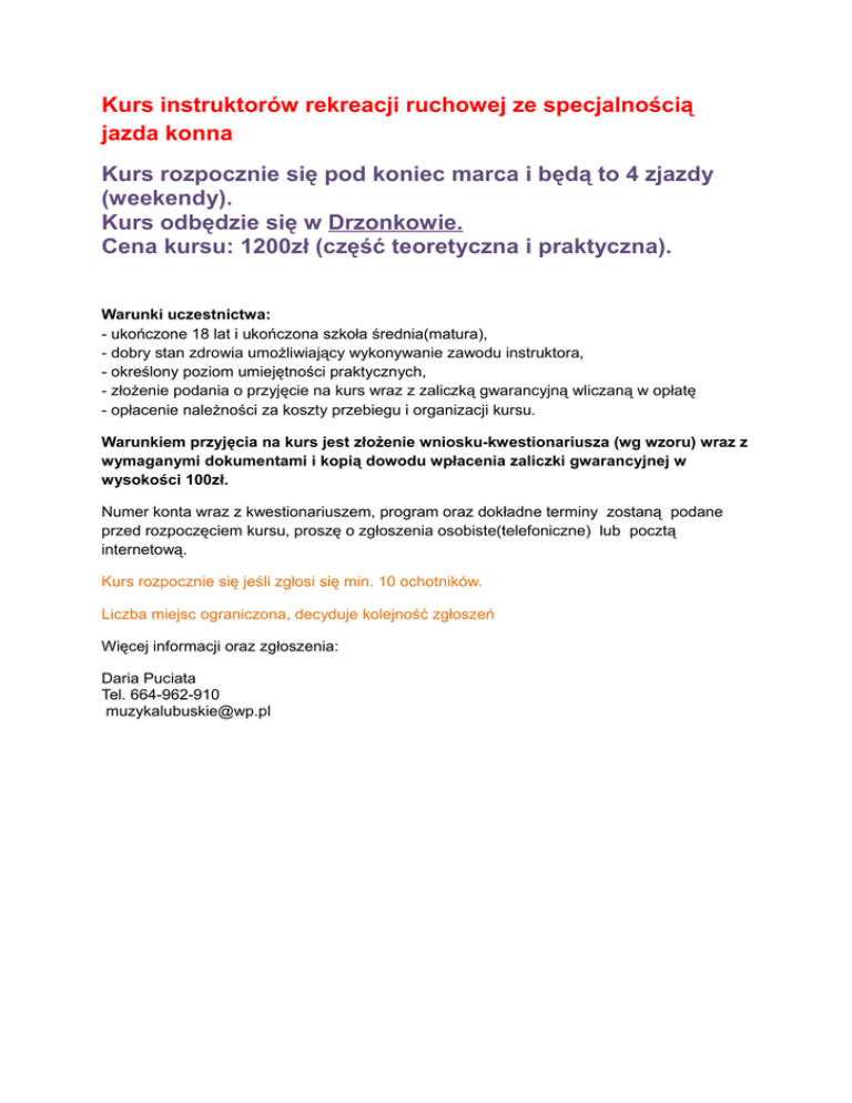Kurs instruktorów rekreacji ruchowej ze specjalnością jazda konna Kurs rozpocznie się pod koniec marca i będą to 4 zjazdy (weekendy). Kurs odbędzie się w Drzonkowie. Cena kursu: 1200zł (część teoretyczna i praktyczna). Warunki uczestnictwa: - ukończone 18 lat i ukończona szkoła średnia(matura), - dobry stan zdrowia umożliwiający wykonywanie zawodu instruktora, - określony poziom umiejętności praktycznych, - złożenie podania o przyjęcie na kurs wraz z zaliczką gwarancyjną wliczaną w opłatę - opłacenie należności za koszty przebiegu i organizacji kursu. Warunkiem przyjęcia na kurs jest złożenie wniosku-kwestionariusza (wg wzoru) wraz z wymaganymi dokumentami i kopią dowodu wpłacenia zaliczki gwarancyjnej w wysokości 100zł. Numer konta wraz z kwestionariuszem, program oraz dokładne terminy zostaną podane przed rozpoczęciem kursu, proszę o zgłoszenia osobiste(telefoniczne) lub pocztą internetową. Kurs rozpocznie się jeśli zgłosi się min. 10 ochotników. Liczba miejsc ograniczona, decyduje kolejność zgłoszeń Więcej informacji oraz zgłoszenia: Daria Puciata Tel. 664-962-910 [email protected]