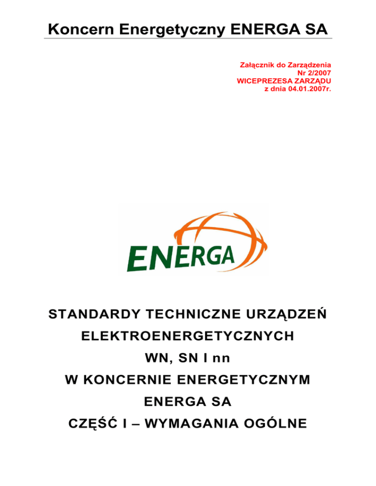 Koncern Energetyczny ENERGA SA Załącznik do Zarządzenia Nr 2/2007 WICEPREZESA ZARZĄDU z dnia 04.01.2007r. STANDARDY TECHNICZNE URZĄDZEŃ ELEKTROENERGETYCZNYCH WN, SN I nn W KONCERNIE ENERGETYCZNYM ENERGA SA CZĘŚĆ I – WYMAGANIA OGÓLNE Standardy techniczne urządzeń elektroenergetycznych WN, SN i nn w Koncernie Energetycznym ENERGA SA Opracował Zespół w składzie: 1. Wawrzyniak Henryk 2. Karmienko Cezary 3. Widelski Grzegorz 4. Wawrzak Waldemar 5. Cieślak Stanisław 6. Turalski Leszek 7. Łopat śaneta 8. Ryński Grzegorz 9. Sokół Jan 10. Lewa Jarosław 11. Grey Piotr 12. Konieczny Zbigniew 13. Ketner Halina DD/DM DD/DM DD/DM O/Koszalin O/Koszalin O/Słupsk O/Gdańsk O/Elbląg O/Olsztyn O/Olsztyn O/Płock O/Toruń O/Kalisz przy współudziale: 1. 2. 3. 4. 5. 6. 7. 8. Jarząbek Paweł Dąbrowski Jacek Nowiński Stanisław KoŜuchowski Jacek Wiszowaty Radosław Kapela Bogusław Zdziech Dariusz Buczkowski Rafał O/Olsztyn O/Gdańsk O/Kalisz O/Płock O/Słupsk O/Koszalin O/Toruń O/Toruń Konsultacja: Mirosław Schwann O/Gdańsk Uzgodnił: Eugeniusz Blicharski – Dyrektor Departamentu Dystrybucji Data obowiązywania: Komórka organizacyjna odpowiedzialna za aktualizację: od 01.01.2007 roku DD/DM 2 Standardy techniczne urządzeń elektroenergetycznych WN, SN i nn w Koncernie Energetycznym ENERGA SA Spis treści Wstęp ..........................................................................................................................4 I. Wymagania ogólne .............................................................................................5 1. Linie napowietrzne 110kV ................................................................................ 5 2. Linie kablowe 110kV ........................................................................................ 5 3. Stacje napowietrzne 110/15kV......................................................................... 5 3.1. Rozdzielnia 110kV ....................................................................................... 5 3.2. Rozdzielnia SN .......................................................................................... 12 3.3. Rozdzielnia potrzeb własnych.................................................................... 14 3.4. Telemechanika obiektowa ......................................................................... 16 3.5. Sterowanie aparatami, blokady oraz pomiary wielkości elektrycznych. ..... 17 4. Słupowe stacje transformatorowe SN/nn ....................................................... 20 5. Wnętrzowe stacje transformatorowe SN/nn ................................................... 21 6. Transformatory SN/nn.................................................................................... 24 7. Złącza kablowe SN ........................................................................................ 25 8. Linie napowietrzne SN ................................................................................... 25 9. Linie kablowe SN ........................................................................................... 28 10. Linie i przyłącza napowietrzne nn .................................................................. 30 11. Linie i przyłącza kablowe nn .......................................................................... 32 12. Złącza kablowe i szafki pomiarowe nn ........................................................... 33 13. Ochrona przeciwprzepięciowa i przeciwłukowa ............................................. 36 3 Standardy techniczne urządzeń elektroenergetycznych WN, SN i nn w Koncernie Energetycznym ENERGA SA Wstęp Celem niniejszego dokumentu jest ujednolicenie stosowanych rozwiązań technicznych w Koncernie Energetycznym ENERGA SA. Obowiązek stosowania zawartych w przedmiotowym dokumencie rozwiązań dotyczy prac projektowych, budowy nowych oraz modernizacji istniejących obiektów elektroenergetycznych. Opracowanie podzielone jest na dwie części. W pierwszej części zawarte są wymagania ogólne stawiane wybranym elementom majątku sieciowego. Druga część zawierać będzie szczegółowe specyfikacje techniczne urządzeń, które naleŜy wykorzystywać przy zamówieniach. Zastosowanie innych niŜ określone w niniejszym dokumencie rozwiązań wymaga indywidualnego uzgodnienia z Departamentem Dystrybucji i/lub Wydziałami Zarządzania Majątkiem Sieciowym w Oddziałach. Projektowanie oraz budowa urządzeń powinna być zgodna z zasadami wiedzy technicznej. 4 Standardy techniczne urządzeń elektroenergetycznych WN, SN i nn w Koncernie Energetycznym ENERGA SA I. Wymagania ogólne Niniejsza część określa podstawowe rozwiązania techniczne i wymagania stawiane urządzeniom elektroenergetycznym WN, SN i nn, stosowanym w Koncernie Energetycznym ENERGA SA. Zaleca się, aby przy projektowaniu linii napowietrznych naleŜy w jak największym stopniu wykorzystywać moŜliwości budowy linii wielonapięciowych i wielotorowych. 1. Linie napowietrzne 110kV Ze względu na specyfikę tych linii, rozwiązania techniczne powinny być uzgadniane indywidualnie. a. jedno lub wielotorowe, b. jedno lub wielonapięciowe, c. słupy kratowe, rurowe stalowe lub wirowane, d. jako standardowa izolacja kompozytowa, w zaleŜności od potrzeb moŜliwe jest stosowanie innych rozwiązań np. porcelanowe, szklane, e. linie światłowodowe skojarzone z przewodem odgromowym lub samonośnych podwieszanych, f. przewody robocze o obciąŜalności prądowej nie mniejszej niŜ dla przewodu AFL-6 240mm2. 2. Linie kablowe 110kV Ze względu na specyfikę tych linii, rozwiązania techniczne powinny być uzgadniane indywidualnie. 3. Stacje napowietrzne 110/15kV W wykonaniu standardowym w stacji nie powinno przewidywać się stałej obsługi. 3.1. Rozdzielnia 110kV Pola rozdzielni WN wykonane jako: a. „tradycyjne”, gdzie kaŜdy element pola stanowi odrębne urządzenie, b. w technice modułowej, 5 Standardy techniczne urządzeń elektroenergetycznych WN, SN i n