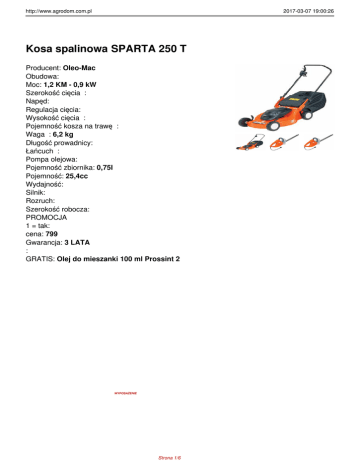 http://www.agrodom.com.pl 2017-03-07 19:00:26 Kosa spalinowa SPARTA 250 T Producent: Oleo-Mac Obudowa: Moc: 1,2 KM - 0,9 kW Szerokość cięcia : Napęd: Regulacja cięcia: Wysokość cięcia : Pojemność kosza na trawę : Waga : 6,2 kg Długość prowadnicy: Łańcuch : Pompa olejowa: Pojemność zbiornika: 0,75l Pojemność: 25,4cc Wydajność: Silnik: Rozruch: Szerokość robocza: PROMOCJA 1 = tak: cena: 799 Gwarancja: 3 LATA : GRATIS: Olej do mieszanki 100 ml Prossint 2 WYPOSAŻENIE Strona 1/6 http://www.agrodom.com.pl 2017-03-07 19:00:27 Kosa SPARTA 250T Głowica z żyłką Tarcza stalowa trójzębna Szelki Strona 2/6 http://www.agrodom.com.pl 2017-03-07 19:00:27 Zestaw kluczy Opakowanie kartonowe Instrukcja obsługi Gwarancja gwarancja 36 miesięcy Strona 3/6 http://www.agrodom.com.pl 2017-03-07 19:00:27 PARAMETRY Moc/Pojemno?? silnika: 1,2 KM - 0,8 kW/25,4 cm³ ?rednica rury: 26 mm Uchwyt: r?koje?? Akcesoria tn?ce: g?owica Tap'n Go Ø 130 , ?y?ka Ø 2.4 mm; tarcza 3 Sprz?g?o: -z?bna Ø 255 mm tak Strona 4/6 http://www.agrodom.com.pl 2017-03-07 19:00:27 Pojemno?? zbiornika paliwa: 0,75 L Ci??ar: 6,2 Kg Kosy spalinowe przystosowane do domowych prac przy piel?gnacji ogródka. -Lekkie i ?atwe w manewrowaniu , ze zmniejszonym do minimum poziomem wibracji dzi?ki samosmaruj?cym ?o?yskom os?ony wa?u nap?dowego oraz dzi?ki izolacji uchwytu od silnika. -Wa? silnika oraz korbowód zosta?y wykonane ze stali kutej, co gwarantuje d?ug? trwa?o?? oraz utrzymanie wysokich parametrów pracy. -Sprz?g?o od?rodkowe z ok?adzin? z materia?u spiekanego zapewnia du?? odporno?? na napr??enia oraz d?ug? trwa?o??. -W sk?ad wyposa?enia wchodzi pompka rozruchowa, która d ostarczaj?c mieszank? do ga?nika u?atwia Strona 5/6 http://www.agrodom.com.pl 2017-03-07 19:00:27 uruchomienie urz?dzenia przy minimalnej liczbie poci?gni?? linki rozruchowej. -Po wci?ni?ciu przycisku, ?atwo uzyskuje si? dost?p do filtra powietrza i nie ma konieczno?ci korzystania ze specjalnych narz?dzi. -SPARTA 250 jest dost?pna z silnikiem Burn Right spe?niaj?cym wymagania norm emisji zanieczyszcze? Euro2. Strona 6/6