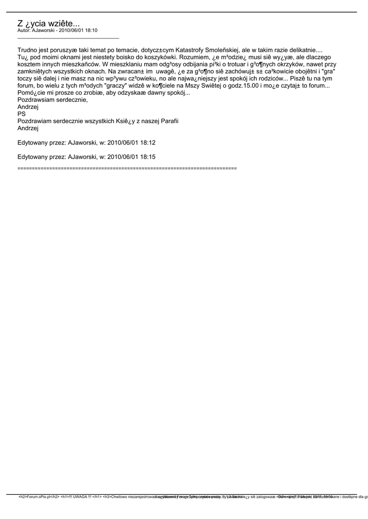 Z ¿ycia wziête... Autor: AJaworski - 2010/06/01 18:10 _____________________________________ Trudno jest poruszyæ taki temat po temacie, dotycz±cym Katastrofy Smoleñskiej, ale w takim razie delikatnie.... Tu¿ pod moimi oknami jest niestety boisko do koszykówki. Rozumiem, ¿e m³odzie¿ musi siê wy¿yæ, ale dlaczego kosztem innych mieszkañców. W mieszklaniu mam odg³osy odbijania pi³ki o trotuar i g³o¶nych okrzyków, nawet przy zamkniêtych wszystkich oknach. Na zwracan± im uwagê, ¿e za g³o¶no siê zachówuj± s± ca³kowicie obojêtni i "gra" toczy siê dalej i nie masz na nic wp³ywu cz³owieku, no ale najwa¿niejszy jest spokój ich rodziców... Piszê tu na tym forum, bo wielu z tych m³odych "graczy" widzê w ko¶ciele na Mszy Swiêtej o godz.15.00 i mo¿e czytaj± to forum... Pomó¿cie mi prosze co zrobiæ, aby odzyskaæ dawny spokój... Pozdrawsiam serdecznie, Andrzej PS Pozdrawiam serdecznie wszystkich Ksiê¿y z naszej Parafii Andrzej Edytowany przez: AJaworski, w: 2010/06/01 18:12 Edytowany przez: AJaworski, w: 2010/06/01 18:15 ============================================================================ <h2>Forum.oPio.pl</h2> <h1>!!! UWAGA !!! </h1> <h3>Chwilowo niezarejestrowani Joomlaboard u¿ytkownicyForum mog±Component tylko czytaæversion: posty, by 1.1.3 pisaæ Stable nale¿y siê zalogowaæ.</h3> Generated: <p>(Forum 7 March, jest 2017, niemoderowane 19:00 i dostêpne dla go