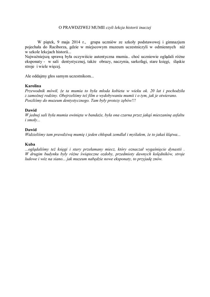 O PRAWDZIWEJ MUMII czyli lekcja historii inaczej W piątek, 9 maja 2014 r., grupa uczniów ze szkoły podstawowej i gimnazjum pojechała do Raciborza, gdzie w miejscowym muzeum uczestniczyli w odmiennych niż w szkole lekcjach historii... Najważniejszą sprawą była oczywiście autentyczna mumia.. choć uczniowie oglądali różne eksponaty - w sali dentystycznej, także obrazy, naczynia, sarkofagi, stare księgi, śląskie stroje i wiele więcej. Ale oddajmy głos samym uczestnikom... Karolina Przewodnik mówił, że ta mumia to była młoda kobieta w wieku ok. 20 lat i pochodziła z zamożnej rodziny. Obejrzeliśmy też film o wydobywaniu mumii i o tym, jak je otwierano. Poszliśmy do muzeum dentystycznego. Tam były protezy zębów!!! Dawid W jednej sali była mumia owinięta w bandaże, była ona czarna przez jakąś mieszaninę asfaltu i smoły... Dawid Widzieliśmy tam prawdziwą mumię i jeden chłopak zemdlał i myślałem, że to jakaś klątwa... Kuba ...oglądaliśmy też księgi i stary przełamany miecz, który oznaczał wygaśnięcie dynastii . W drugim budynku były różne świąteczne ozdoby, przedmioty dawnych kolędników, stroje ludowe i wóz na siano... jak muzeum nabędzie nowe eksponaty, to przyjadę znów.